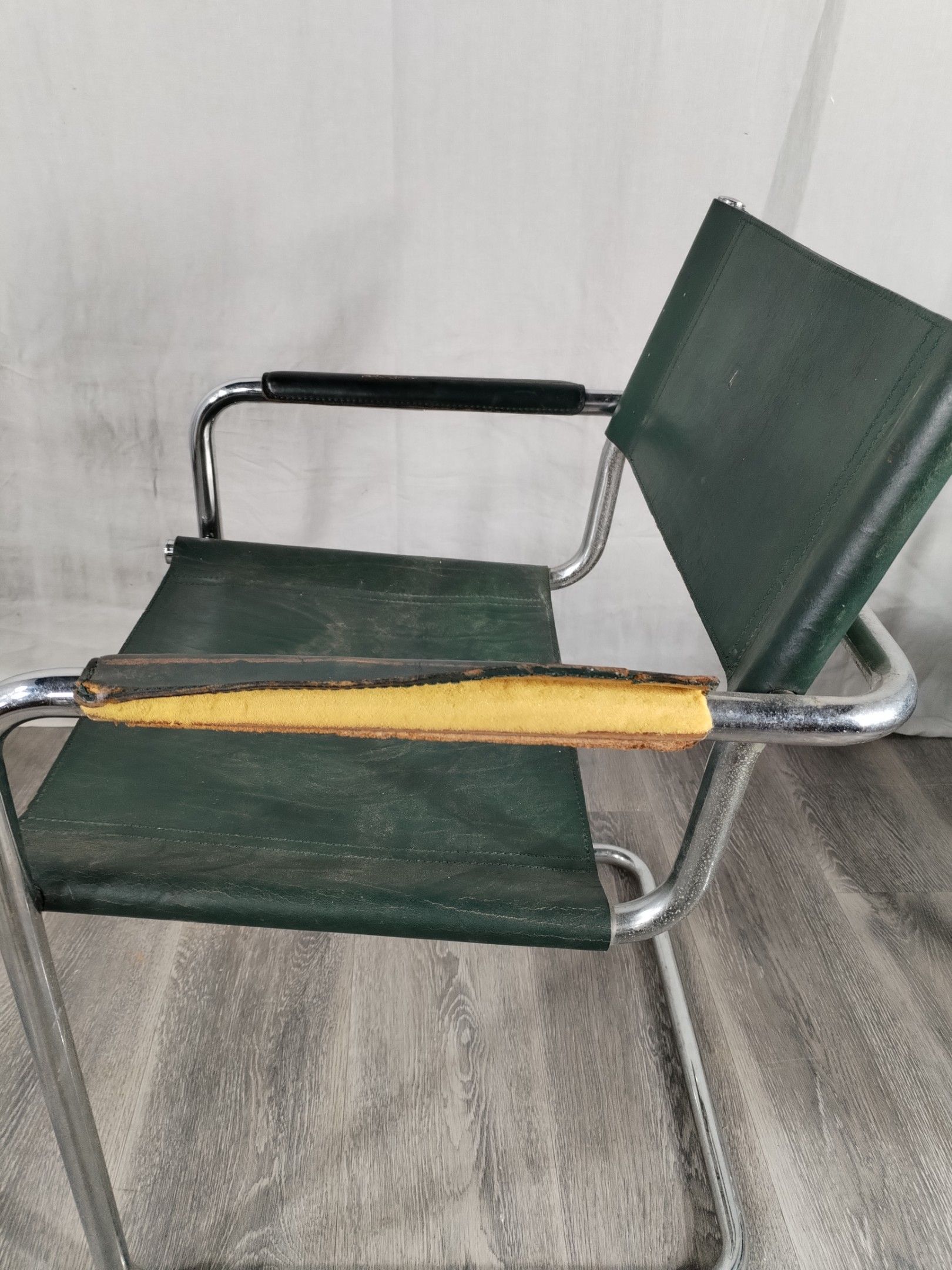 Suite of 4 chromed iron armchairs with saddle-stitched green…