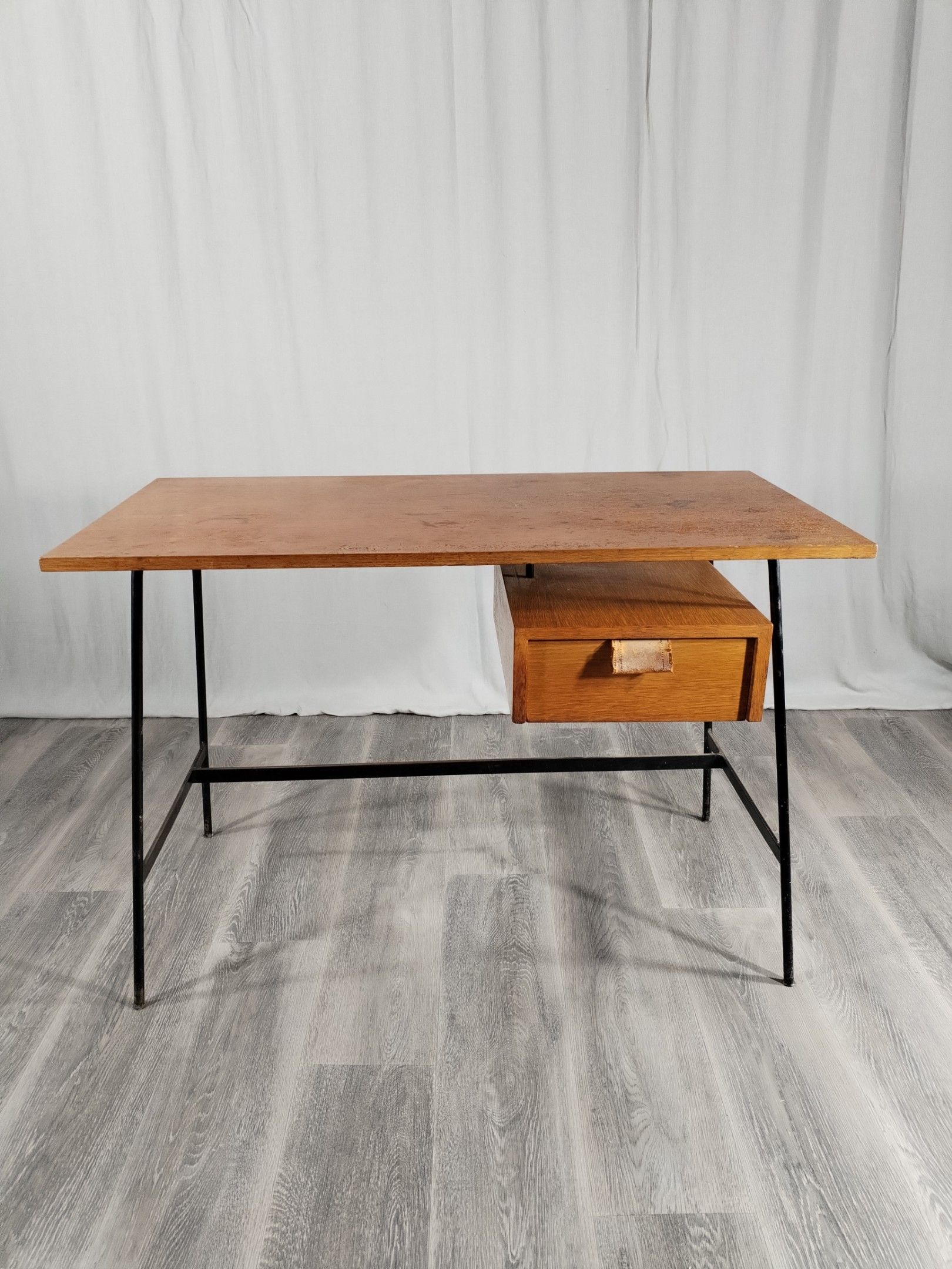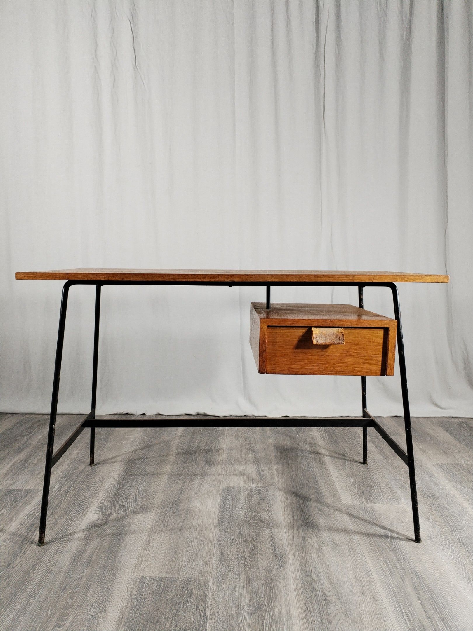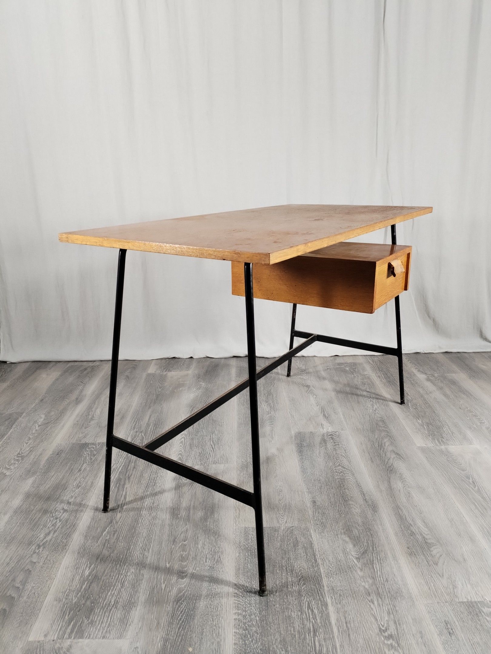 Small desk model FT 280, black lacquered metal tubular base, oak veneered top and drawer, with leather handle.
