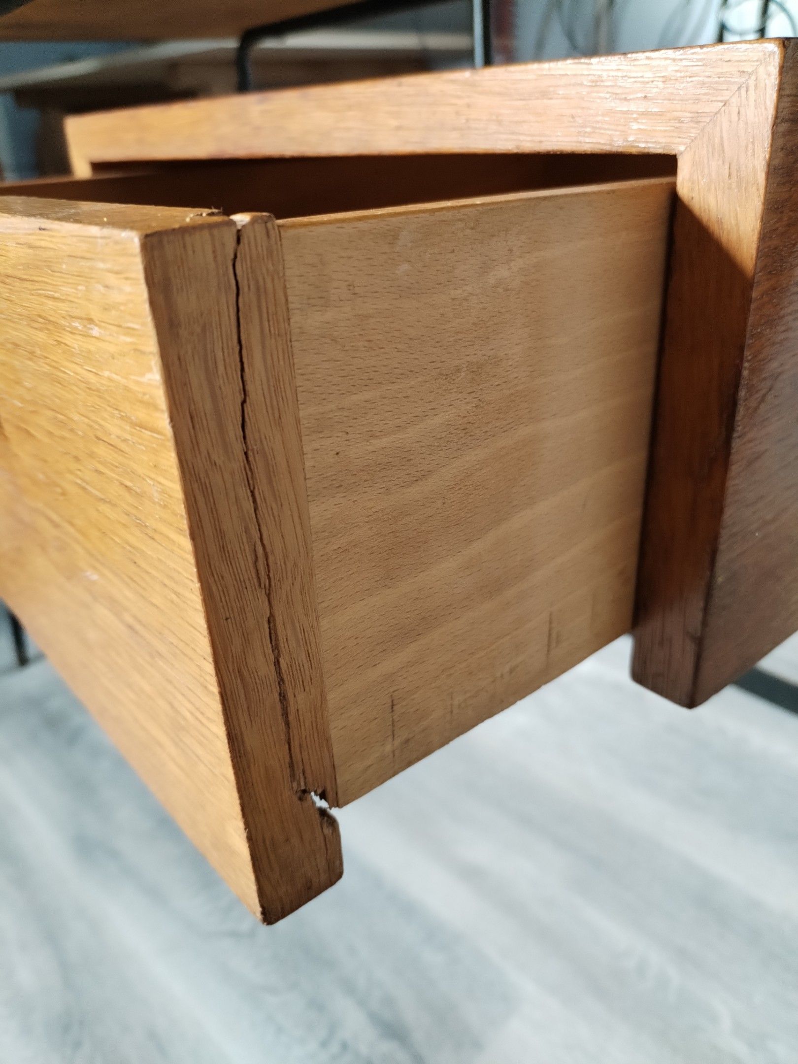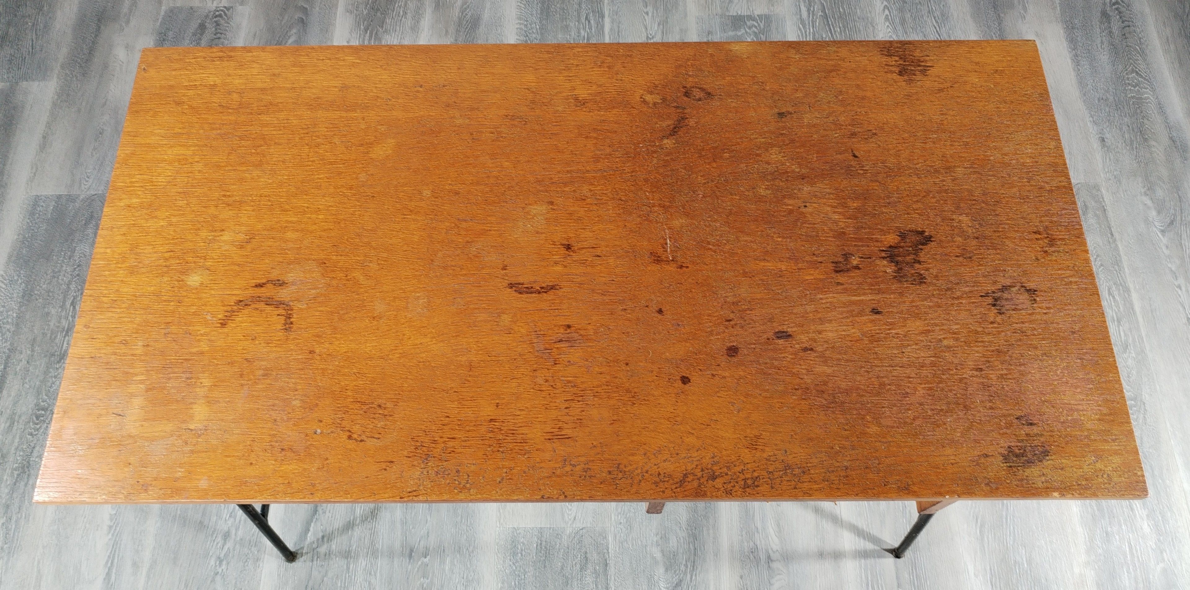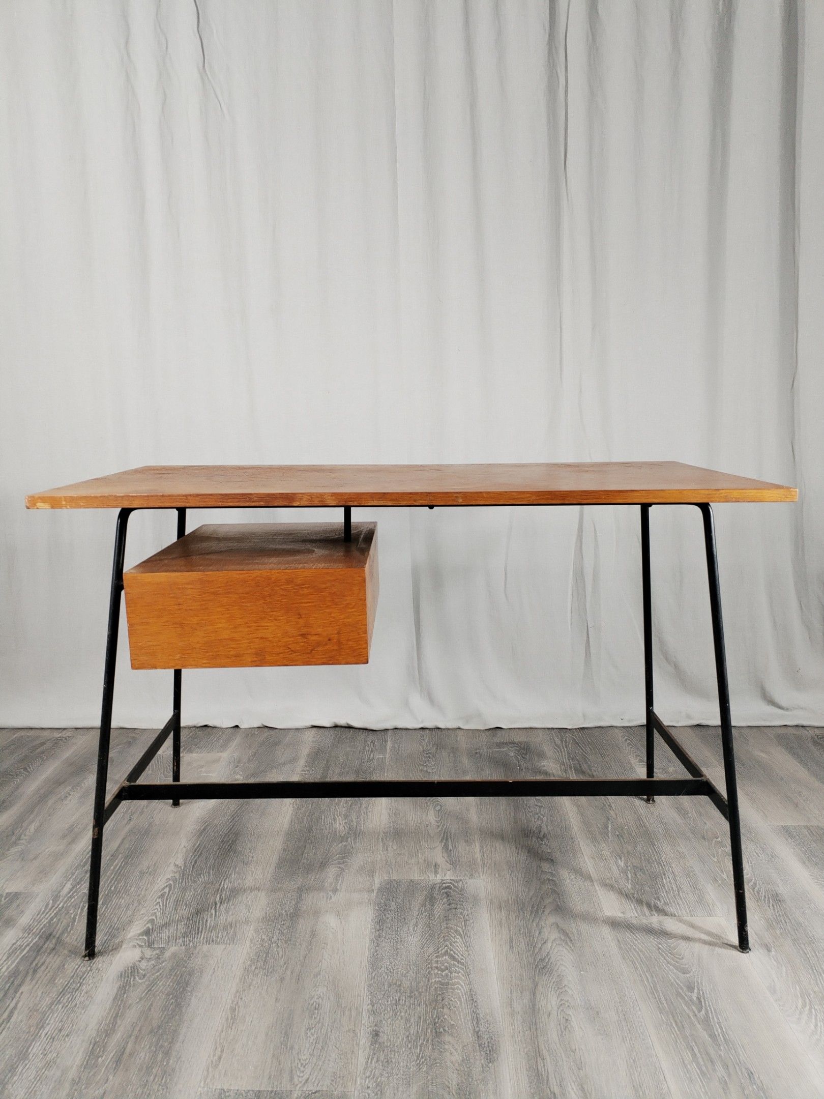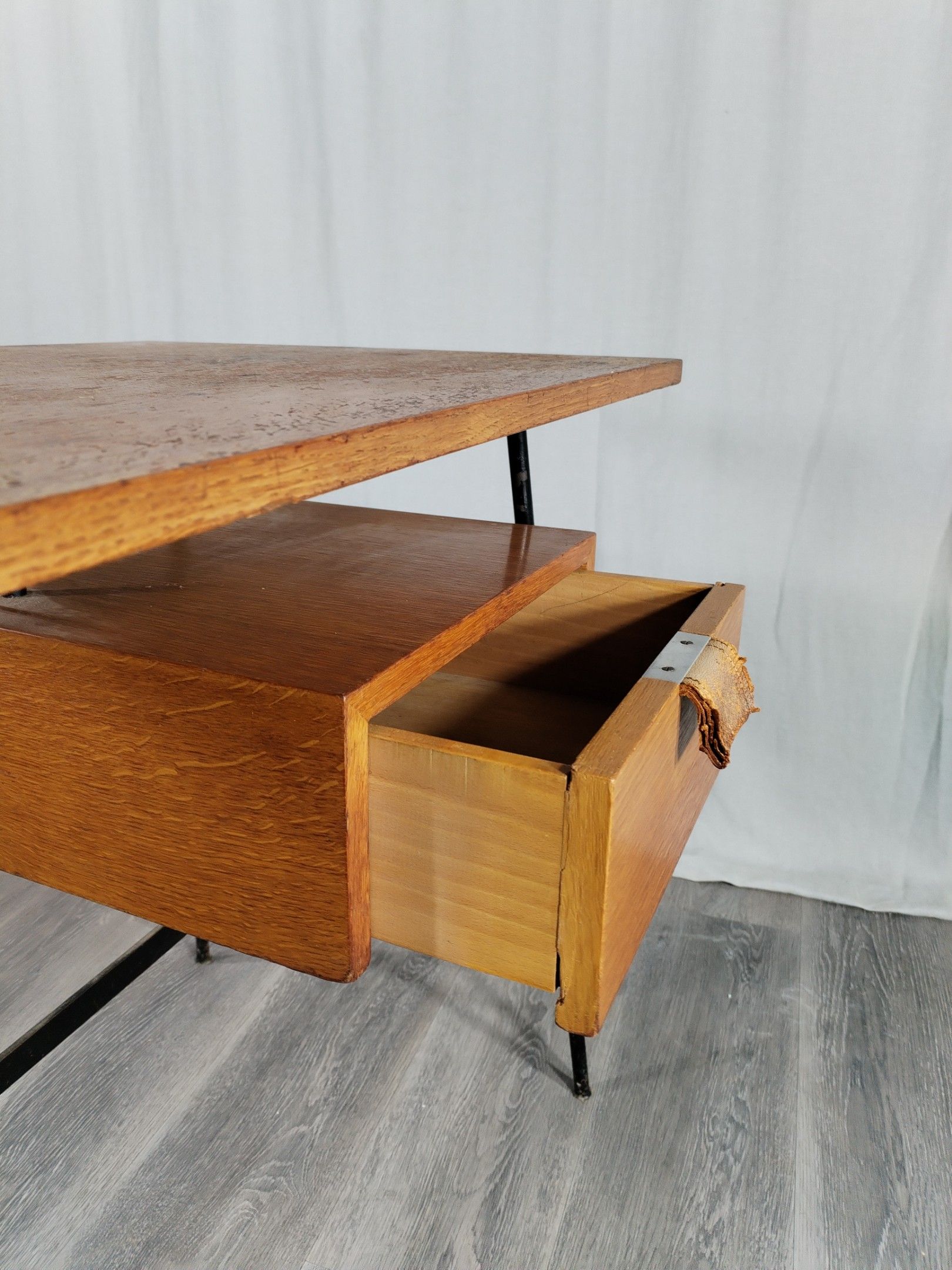 Small desk model FT 280, black lacquered metal tubular base, oak veneered top and drawer, with leather handle.
