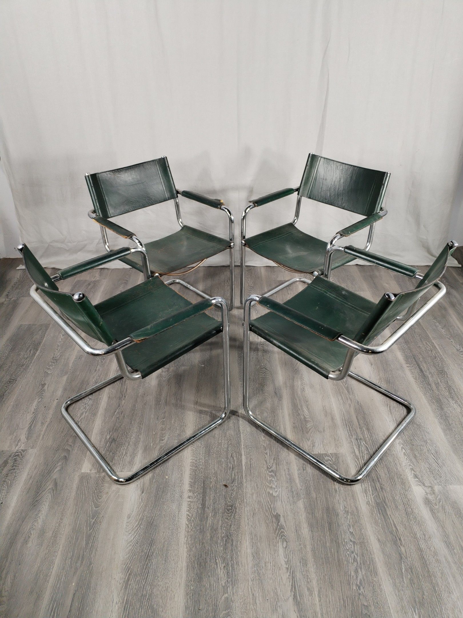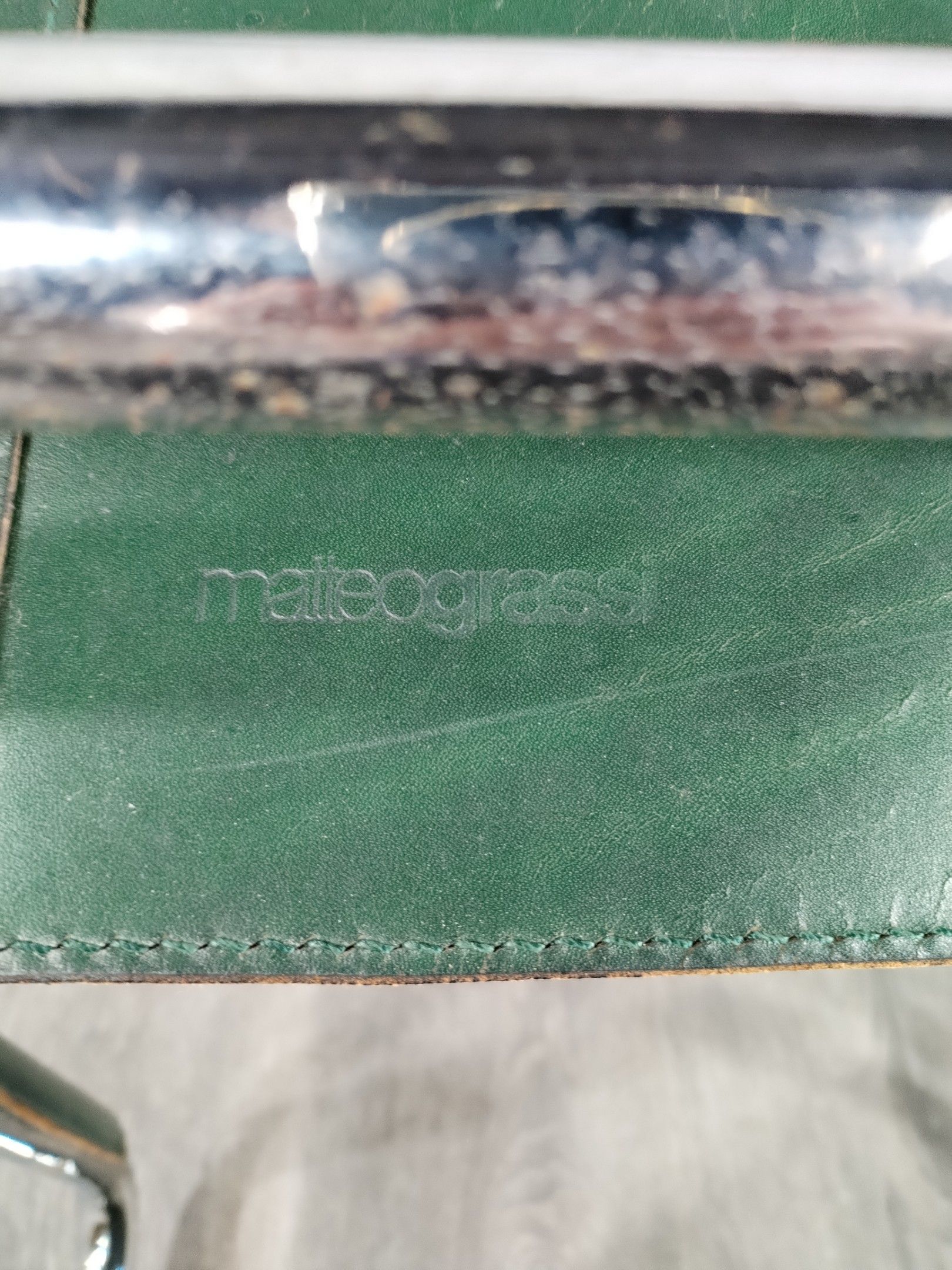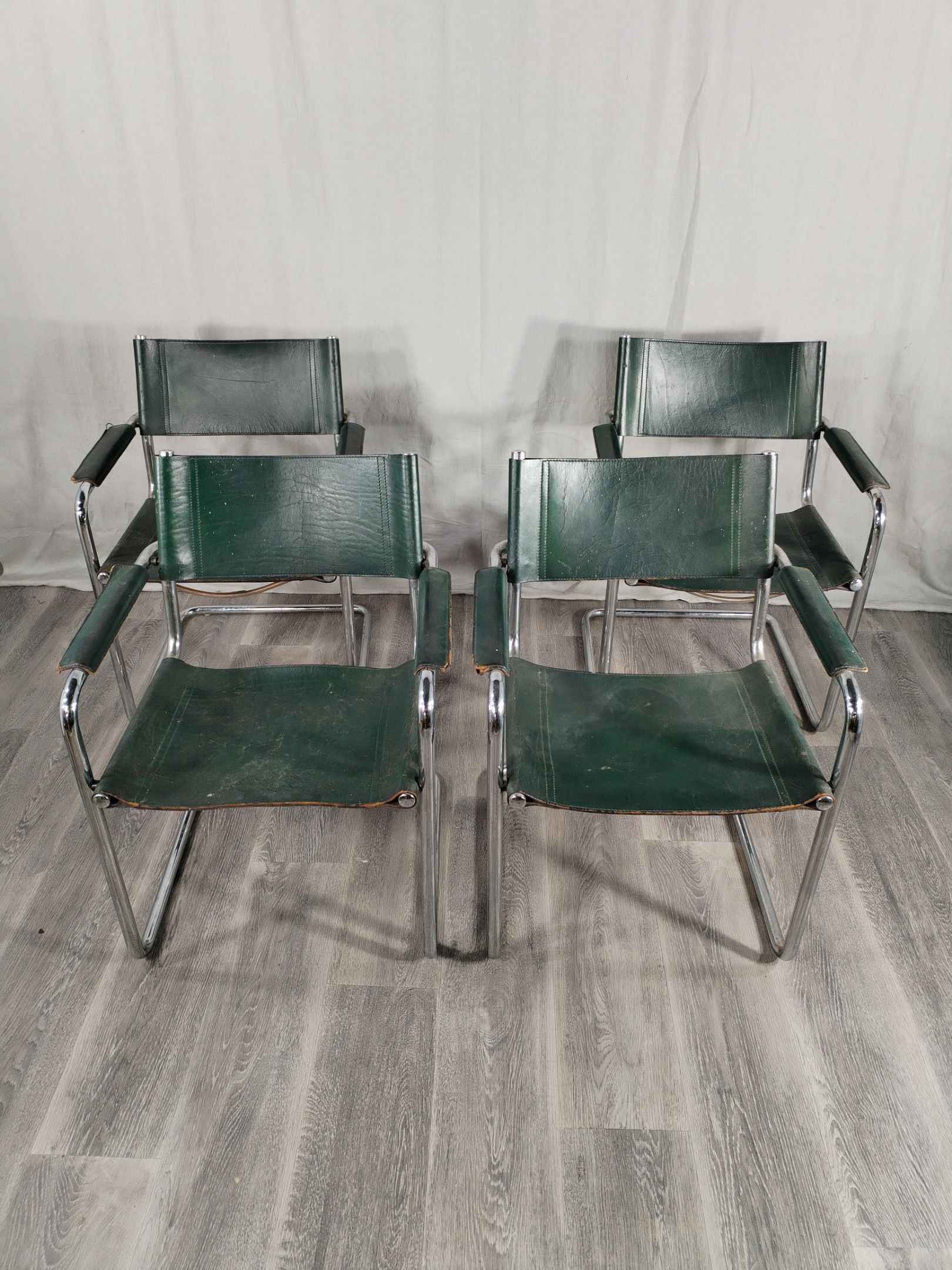 Suite of 4 chromed iron armchairs with saddle-stitched green leather upholstery.