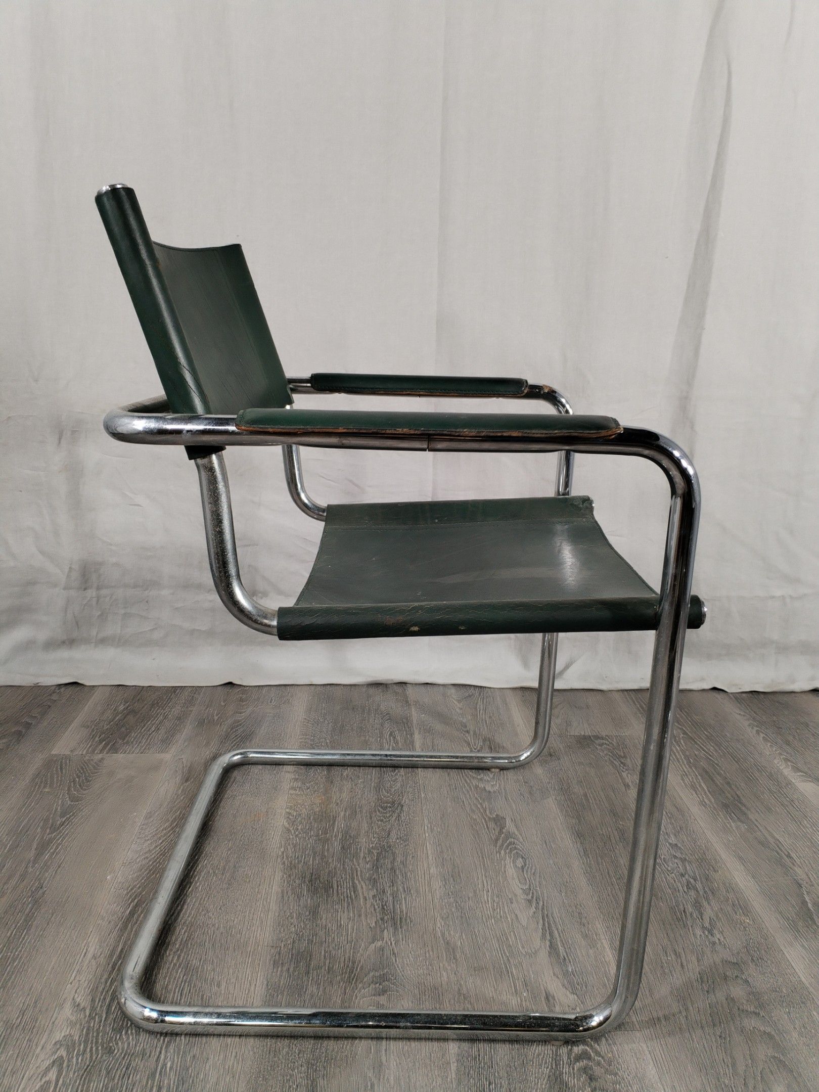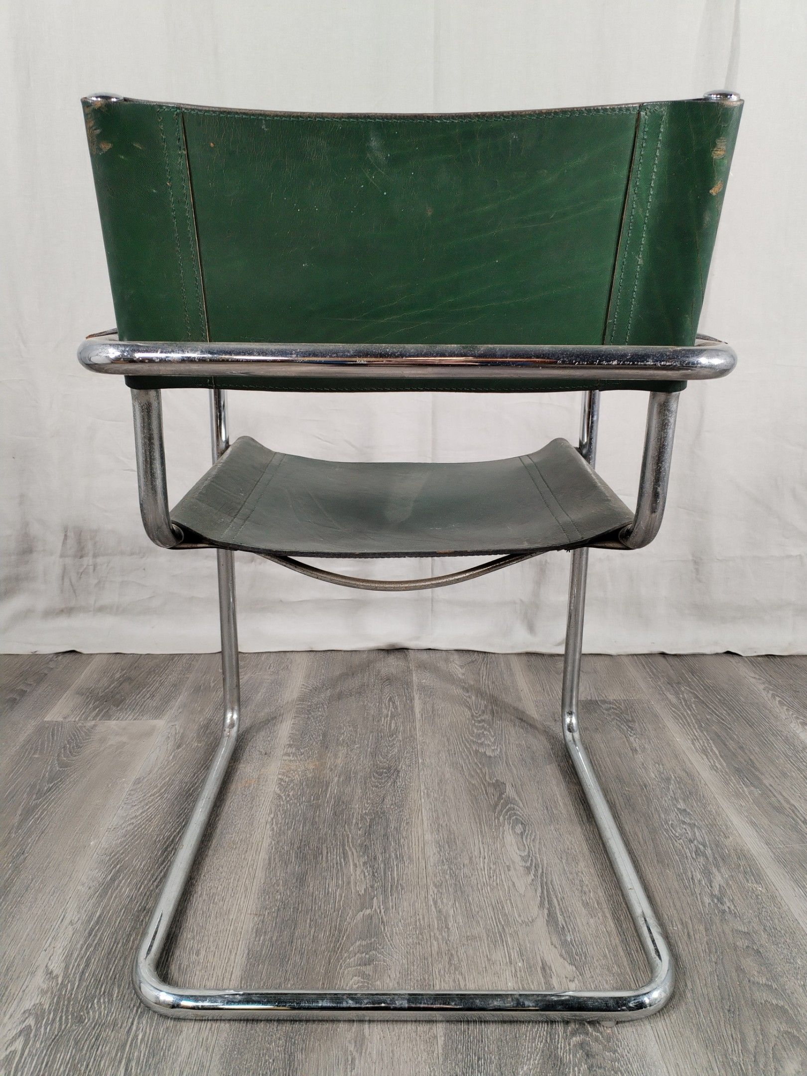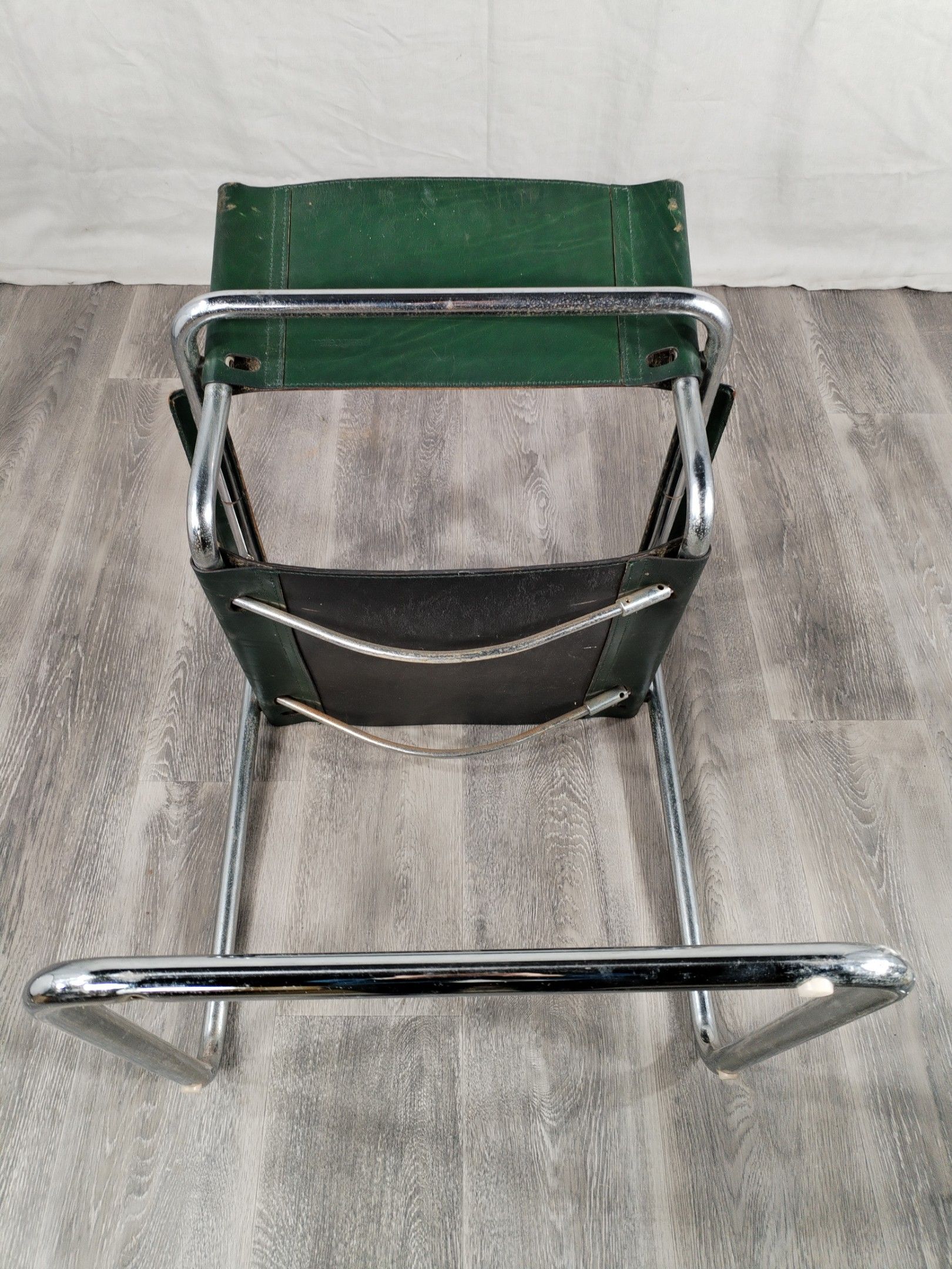 Suite of 4 chromed iron armchairs with saddle-stitched green leather upholstery.