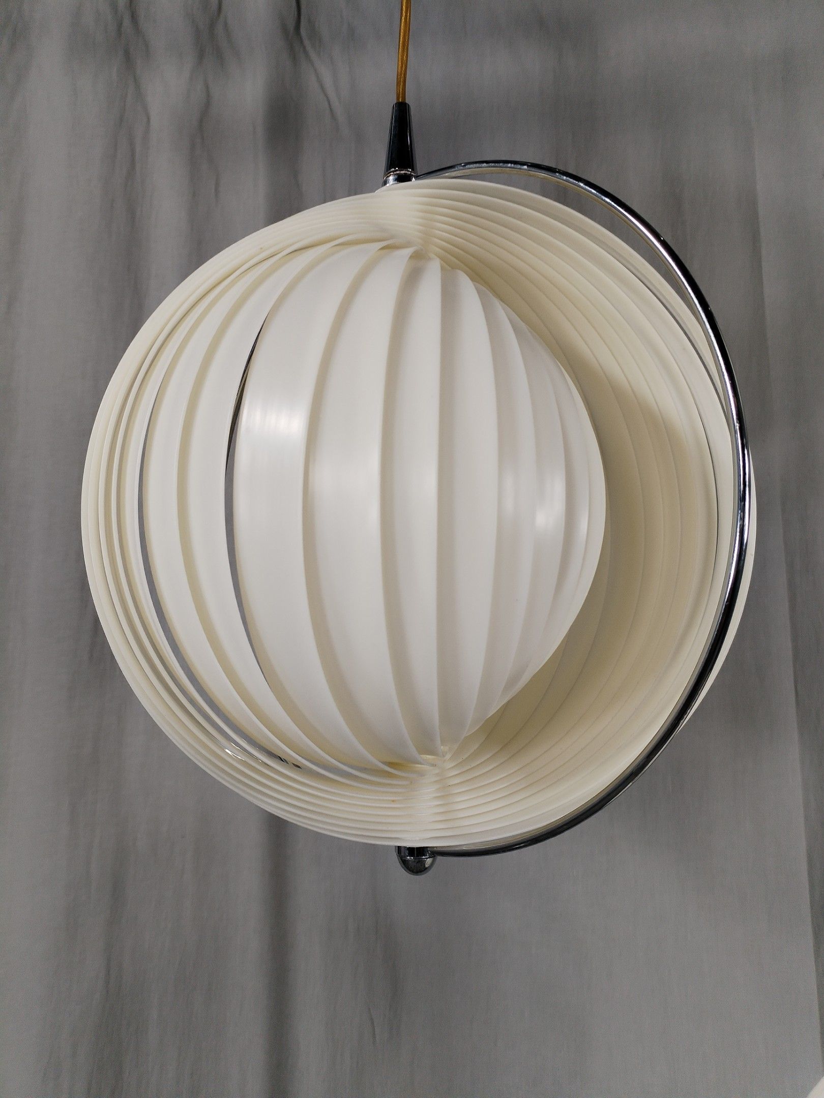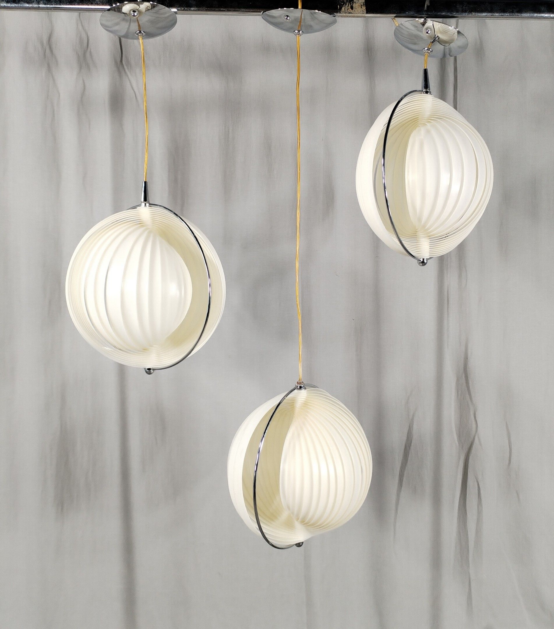 Suite of 3 chromed iron and white PVC chandeliers with articulated slats forming a globe.