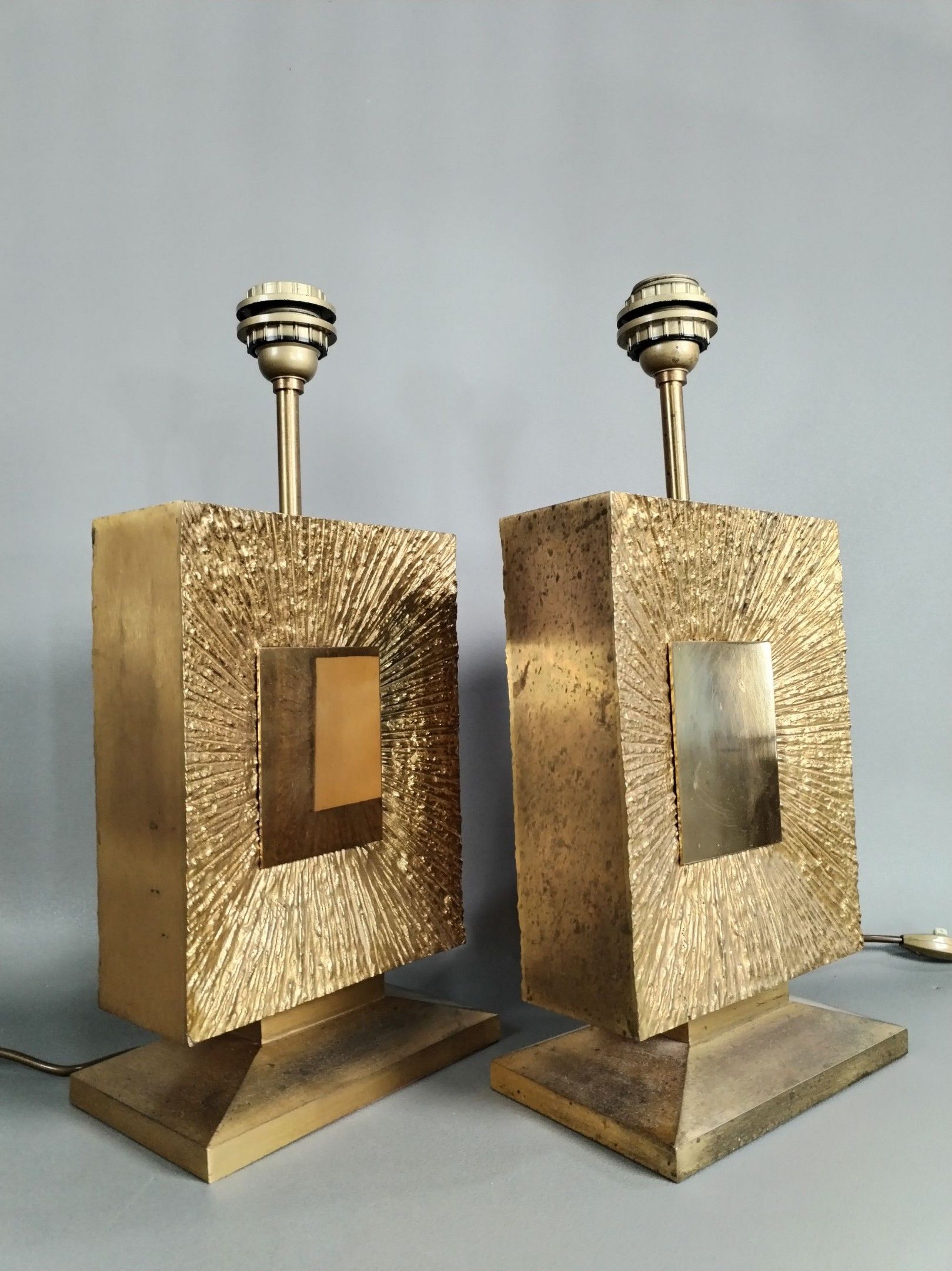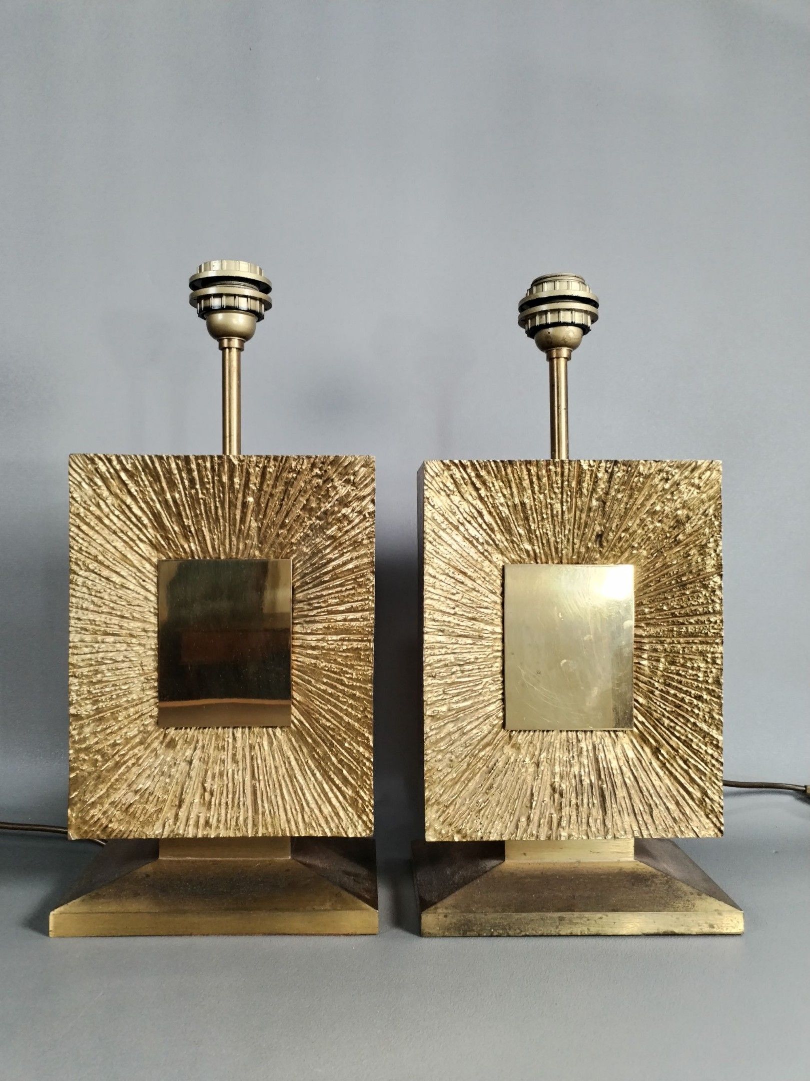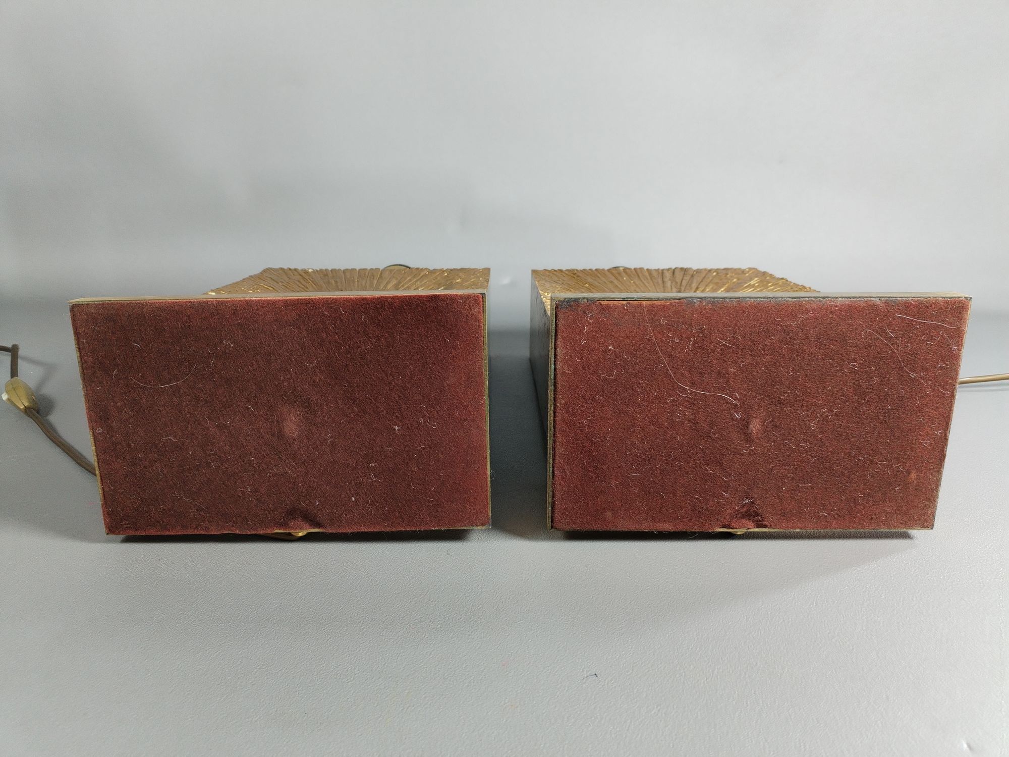 A pair of rectangular ormolu lounge lamps with a mirror surrounded by bas-relief rays. Attributed to BAGUES.