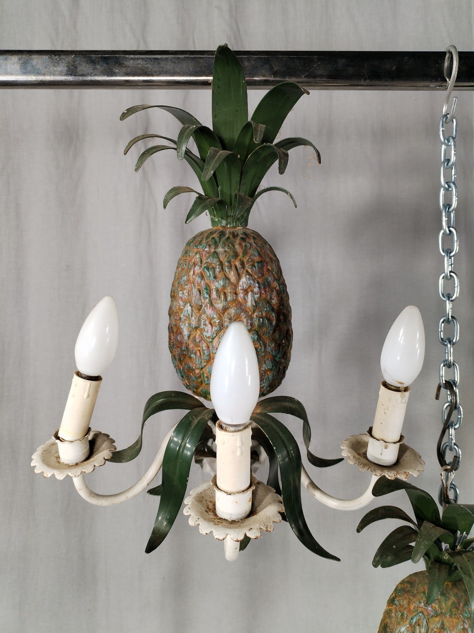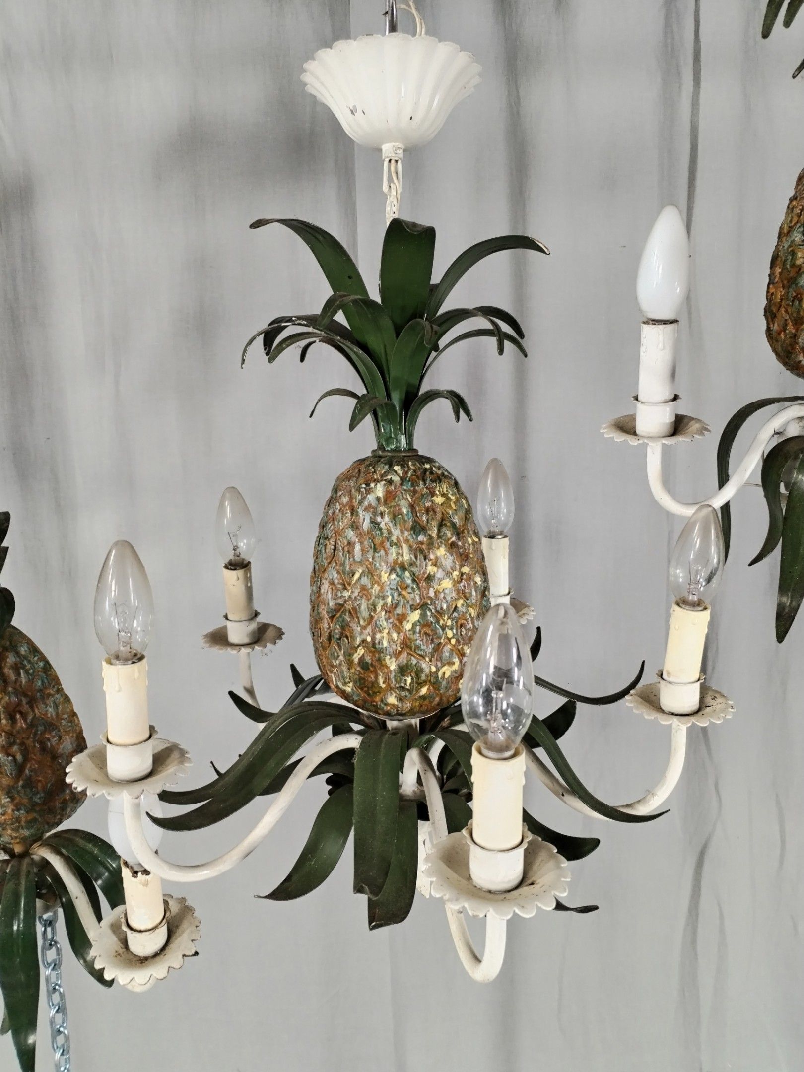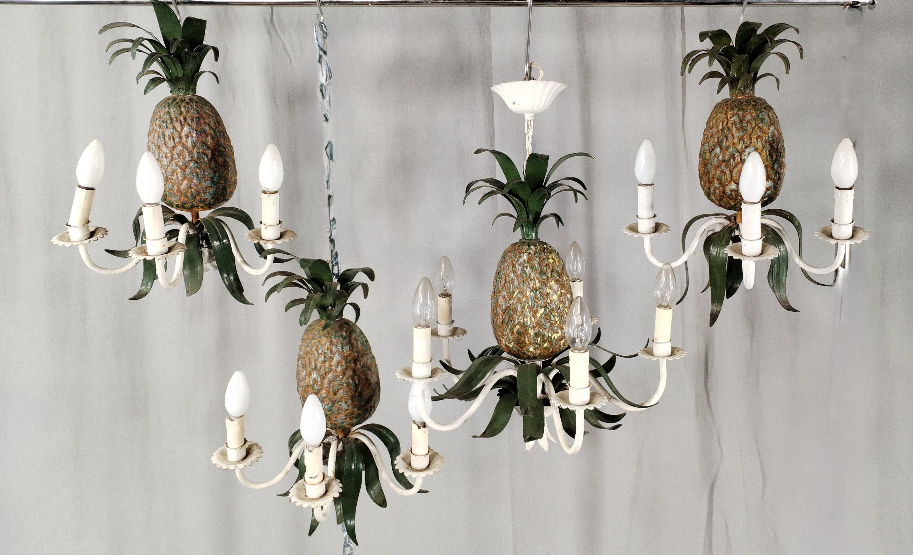 Suite of: a chandelier and 3 sconces in lacquered iron depicting pineapples supporting 3 arms of light.