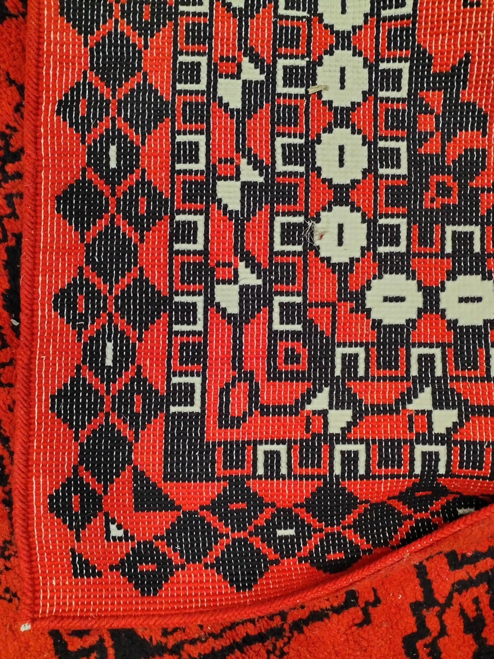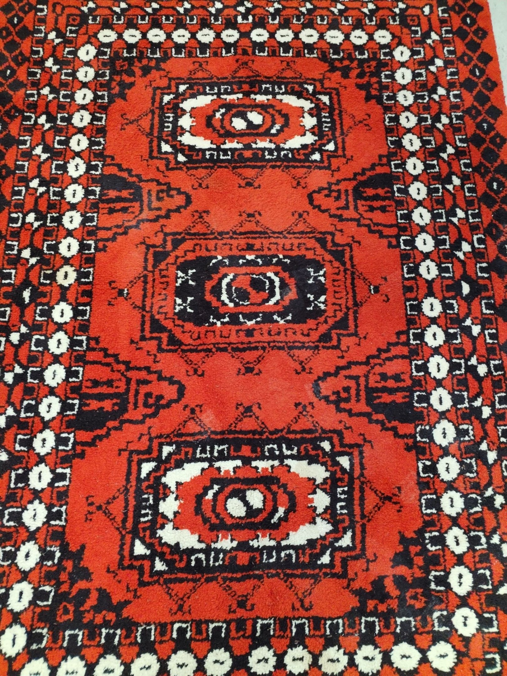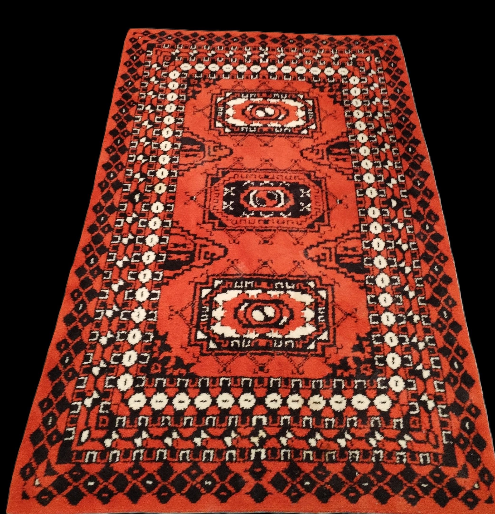 Large wool carpet with diamond pattern on a tomato background.