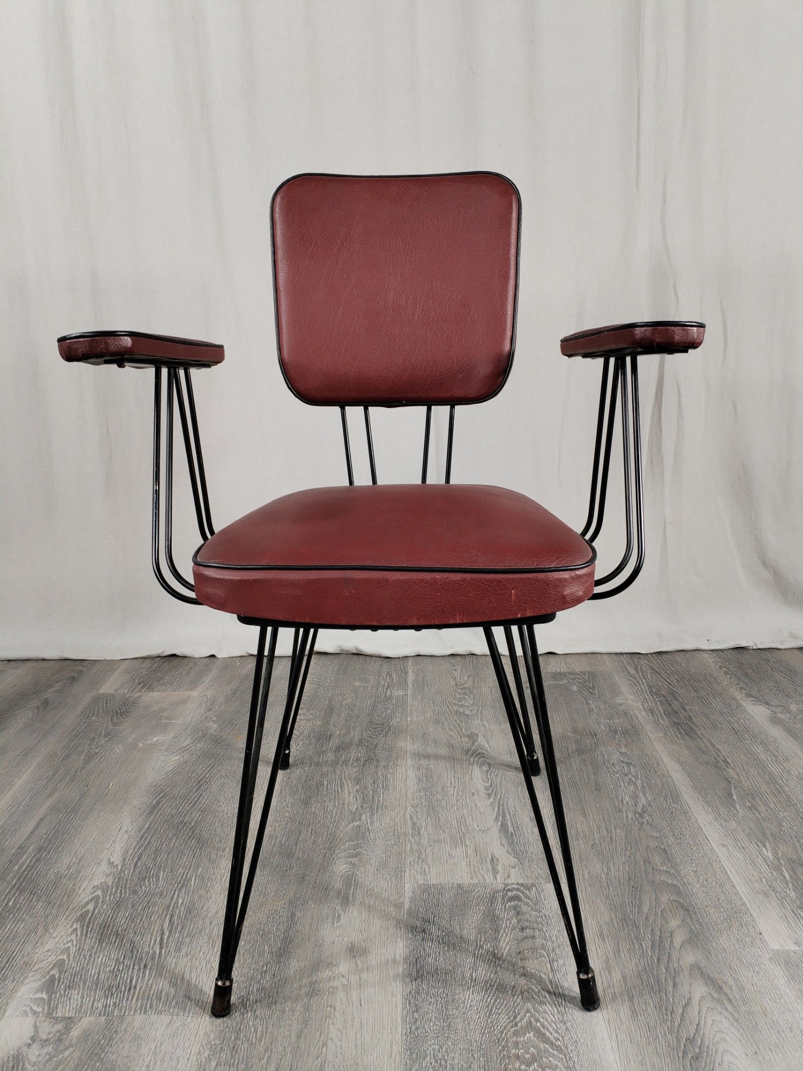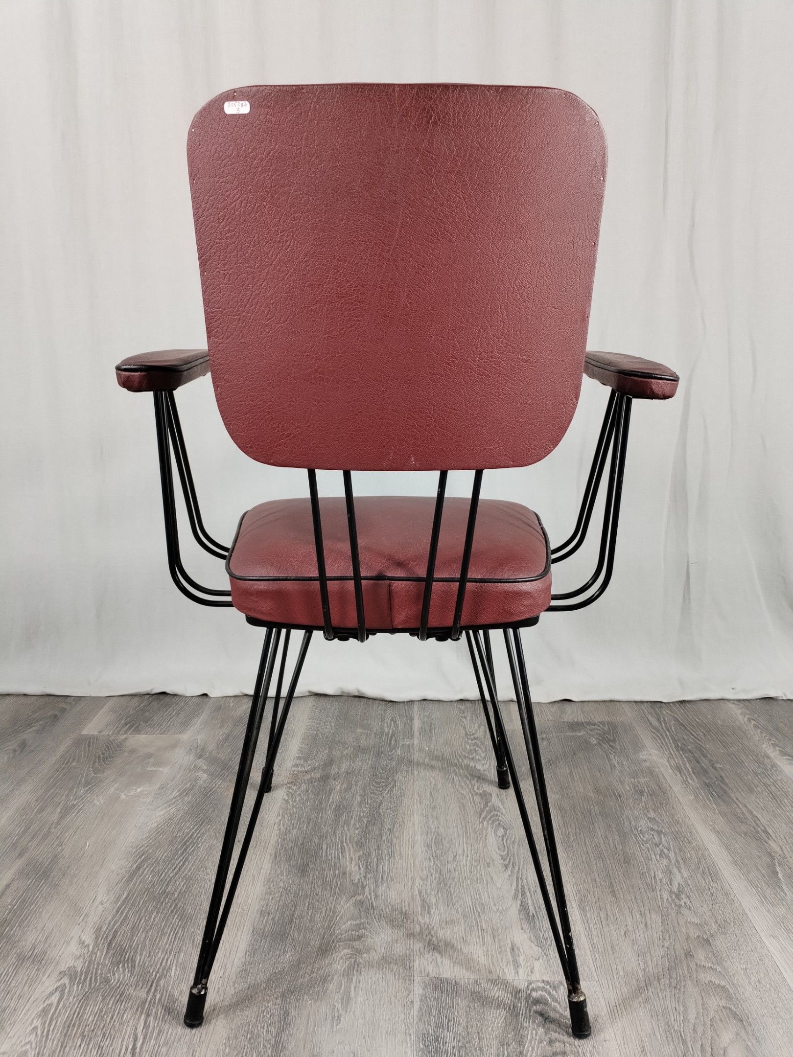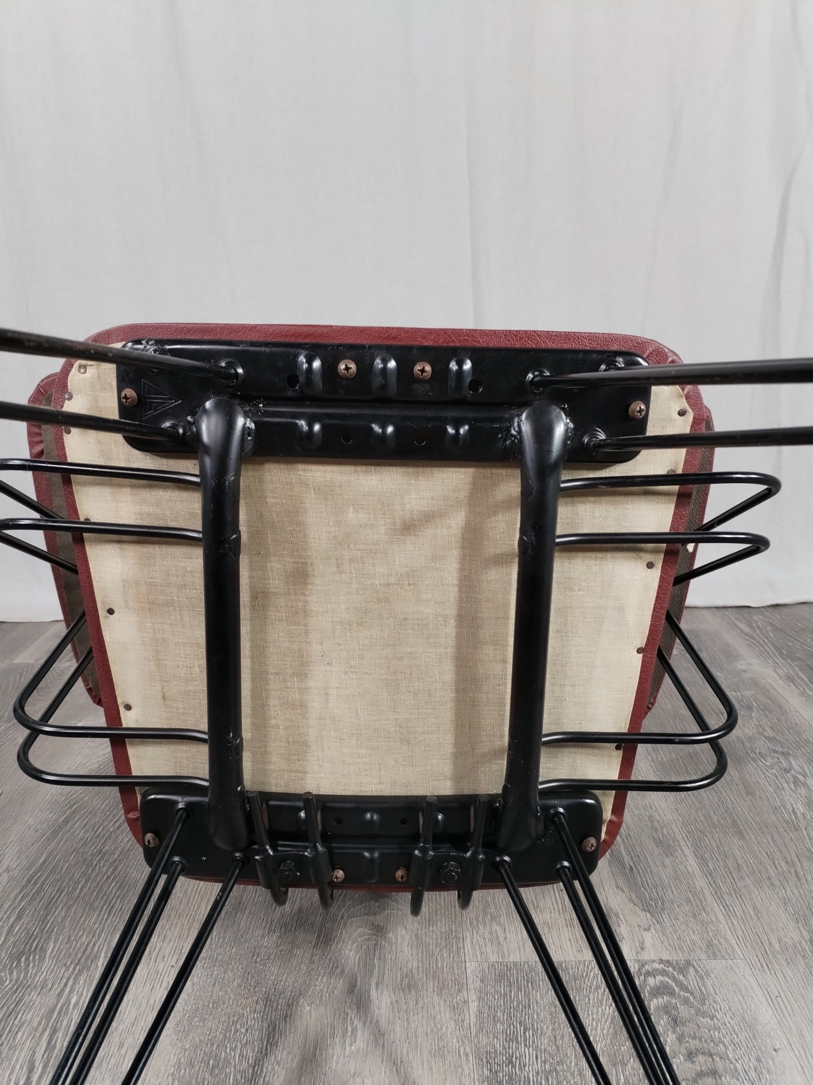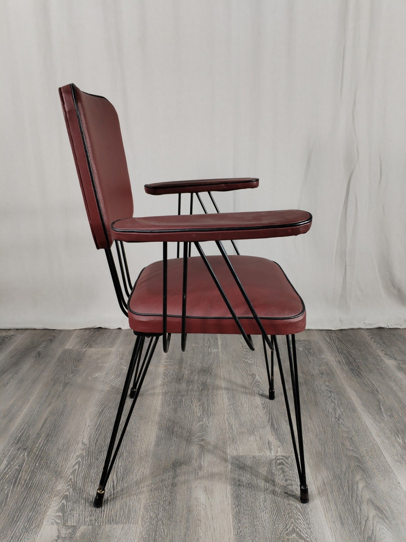 Eiffel Tower-style armchair with black lacquered steel wire frame, upholstered in wine-coloured imitation leather.