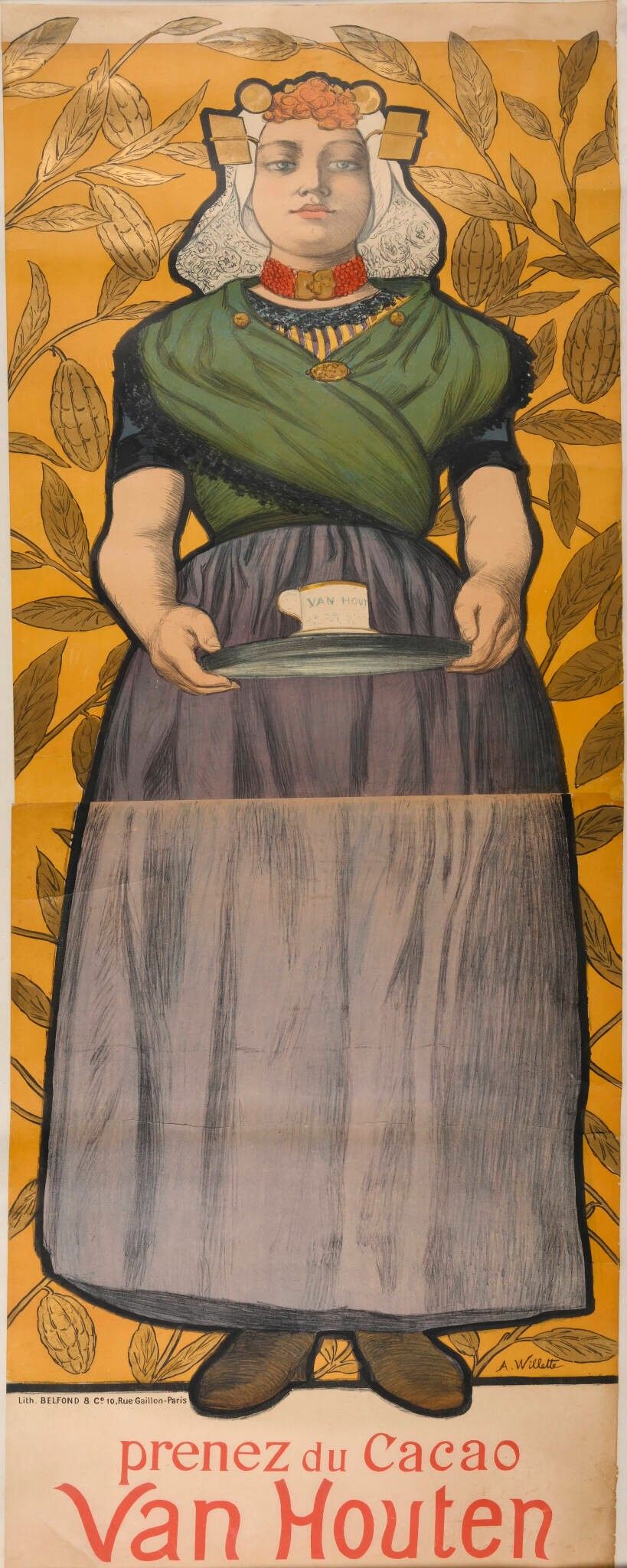 WILLETTE Adolphe. Van Houten cocoa. 1896. Lithographic poster in two sheets. Lith. Belfond & Co Paris. Folded, fairly good condition: addition of an upper band along the foliage (repainted), breaks in the paper, restored tear crossing the poster in the lower sheet, restored tears and lacks in the margins. Bright, fresh colours. 193 x 66.5 cm