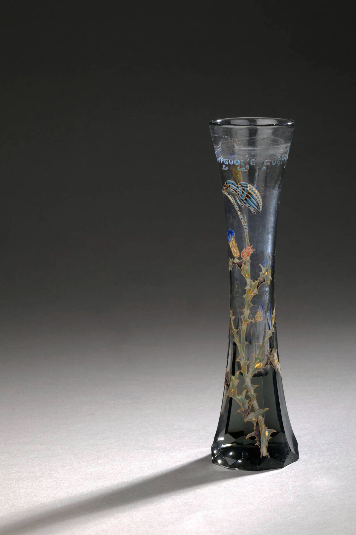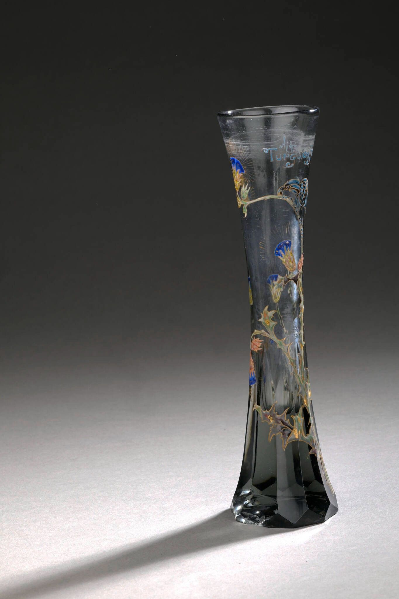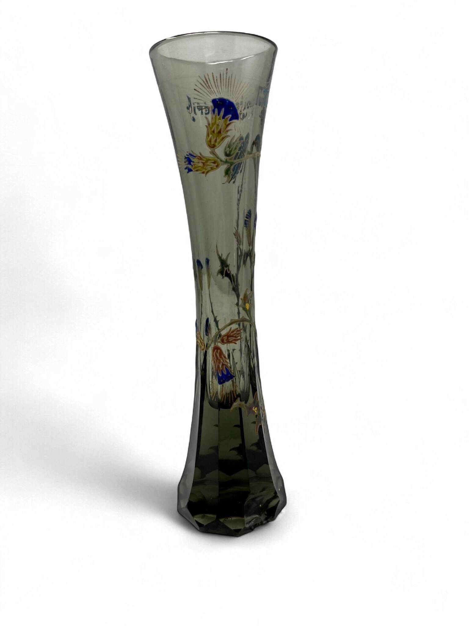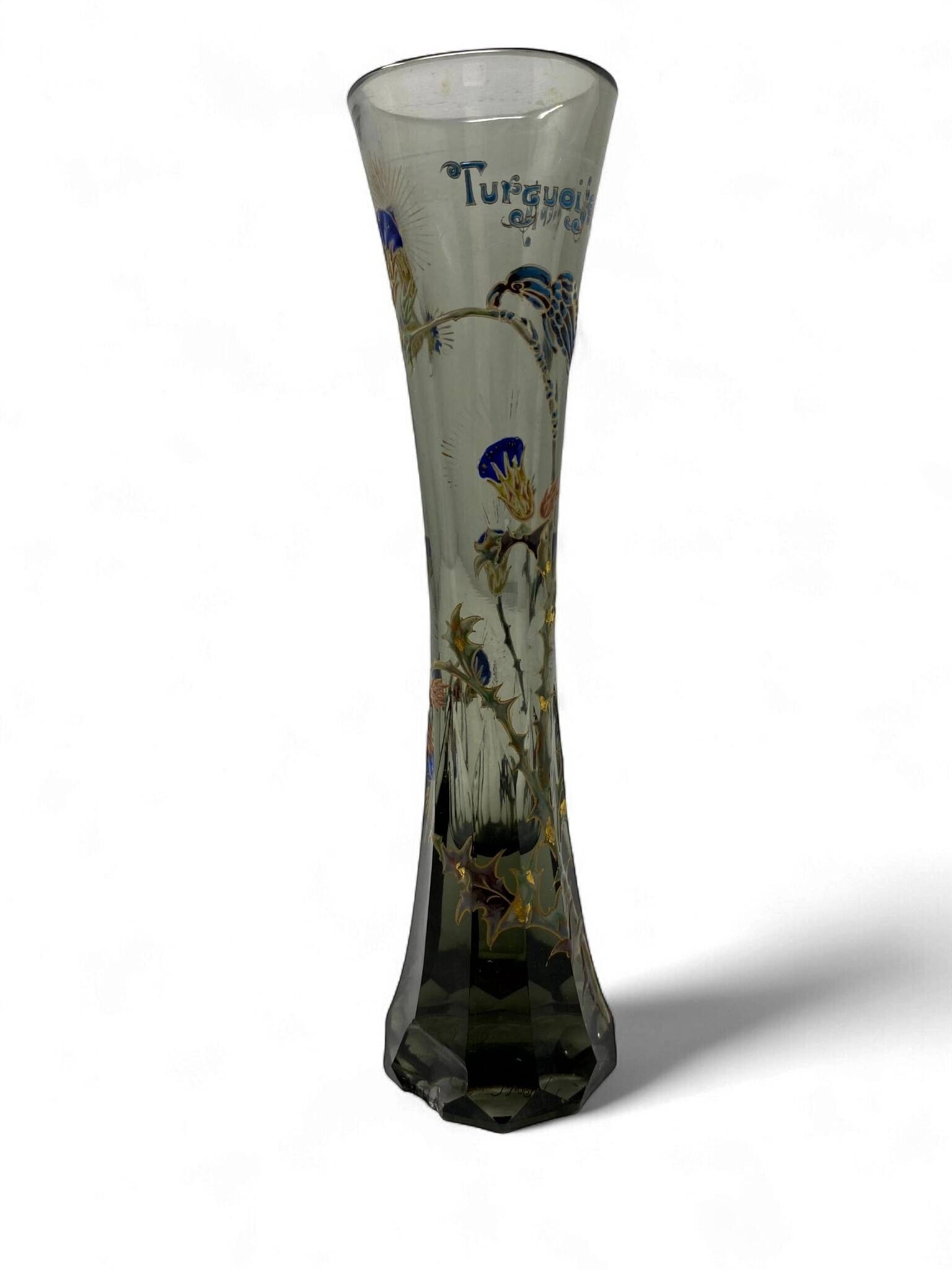 "Turquoise heals. Smoked glass diabolo vase with a body entirely cut with facets in the lower part. Enamelled decoration of Lorraine thistles and a thistle weevil in polychrome enamels highlighted with gold. Titled on the neck (chip at bottom).
