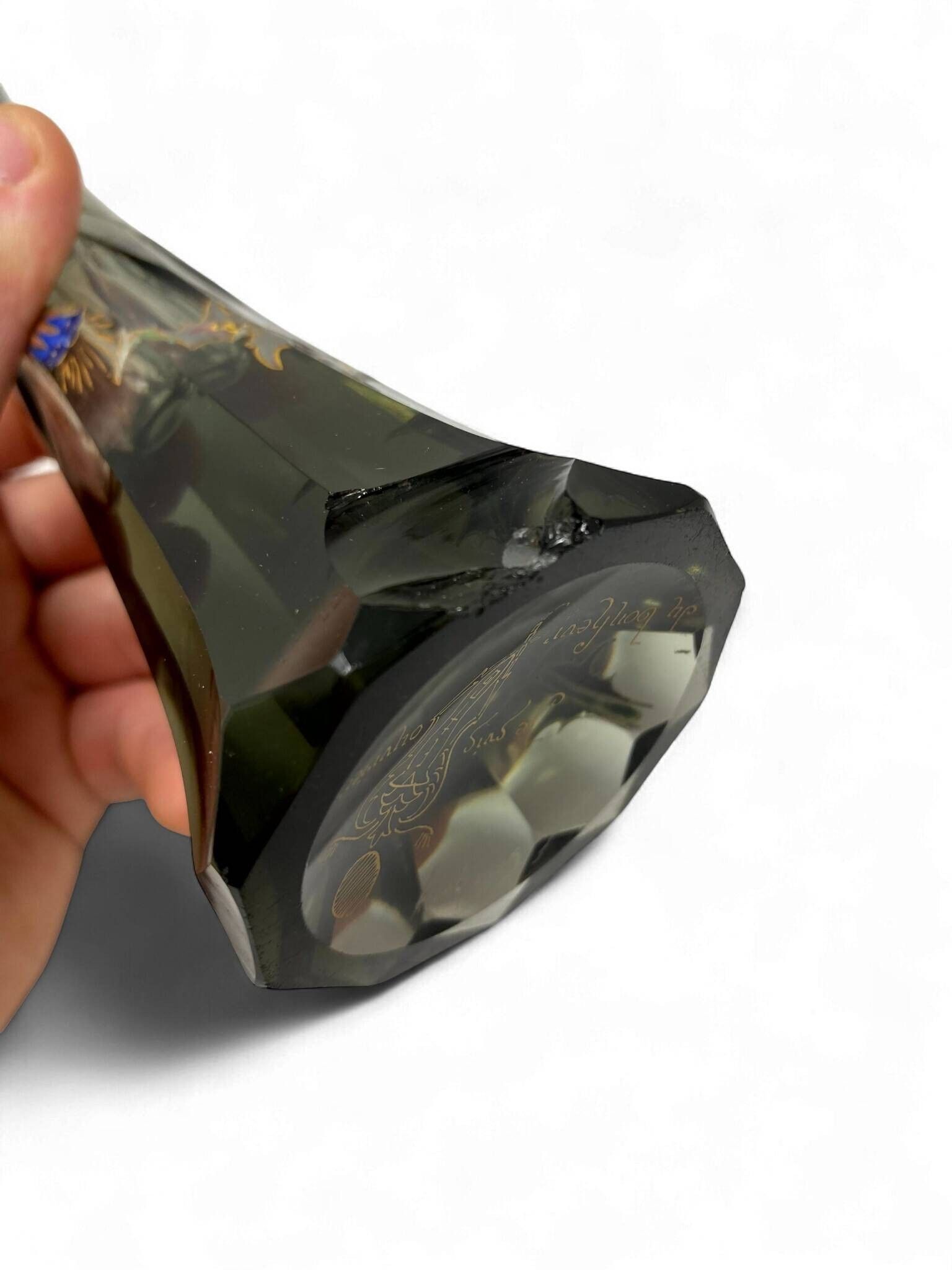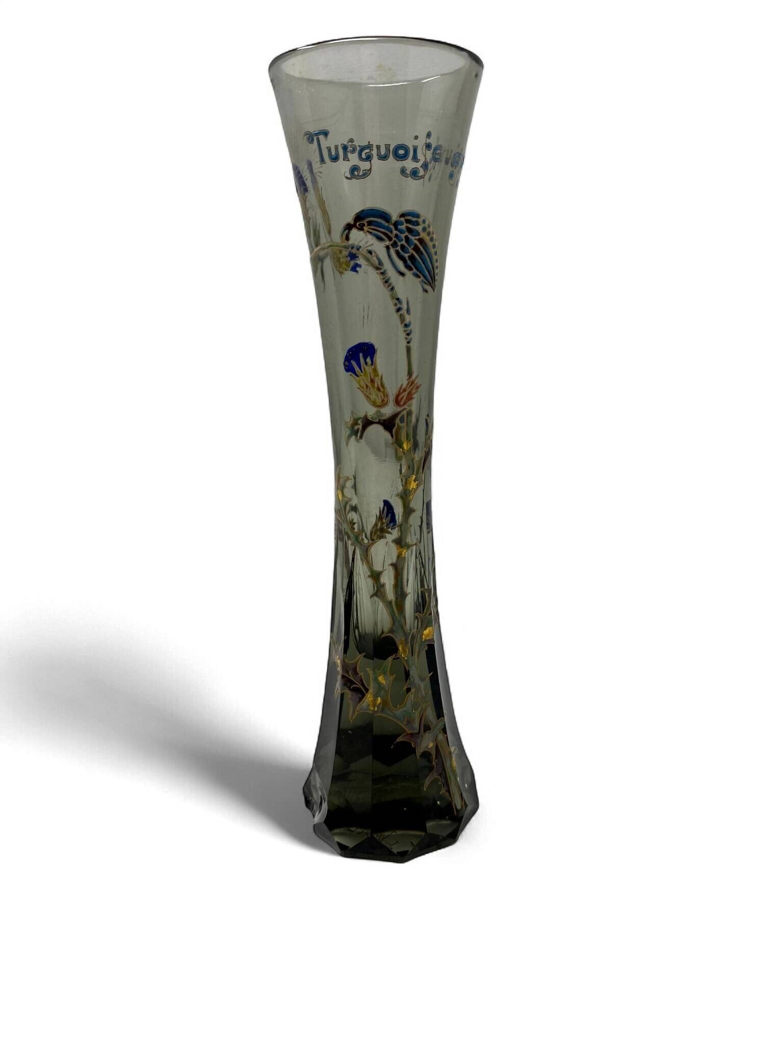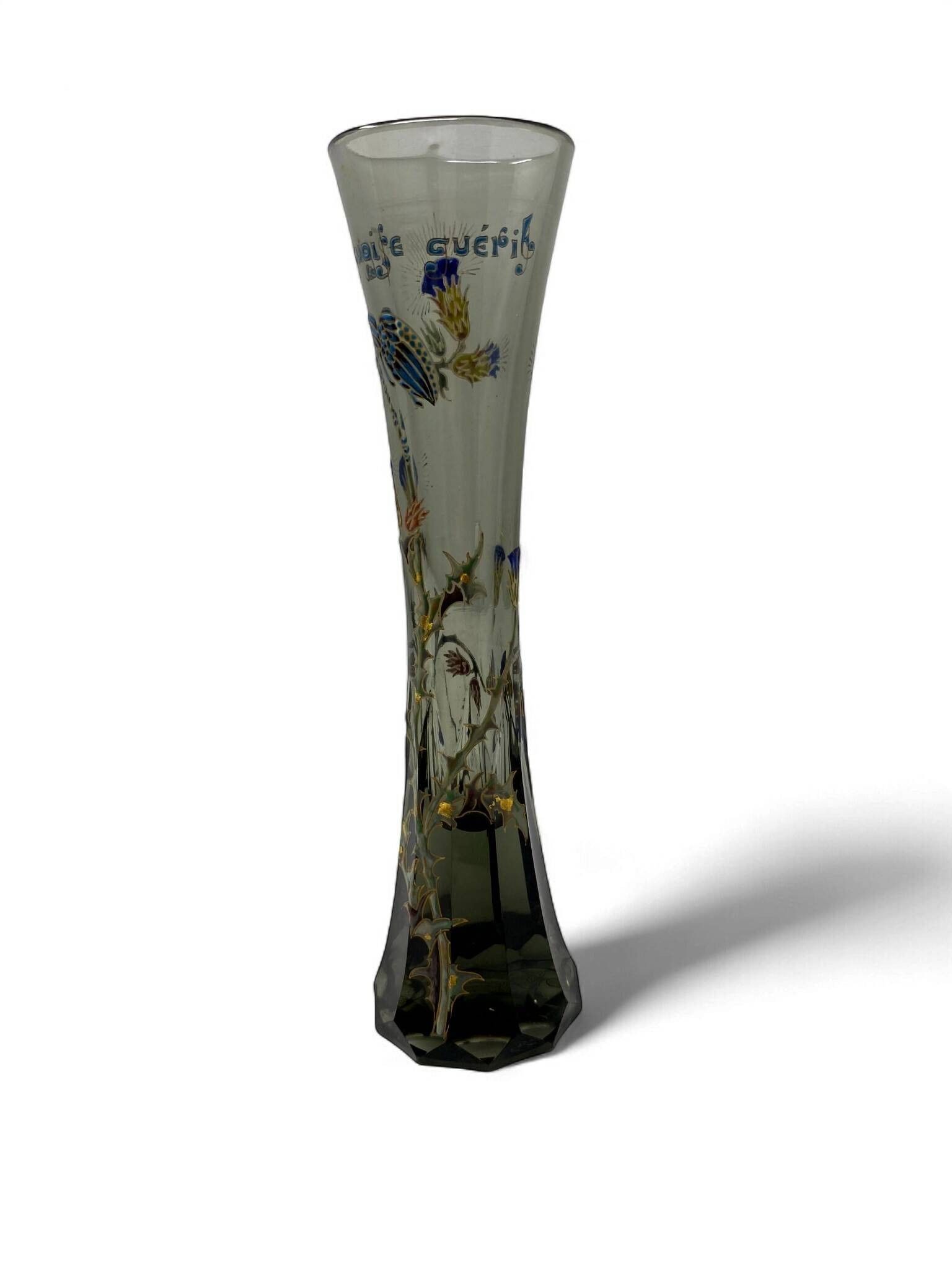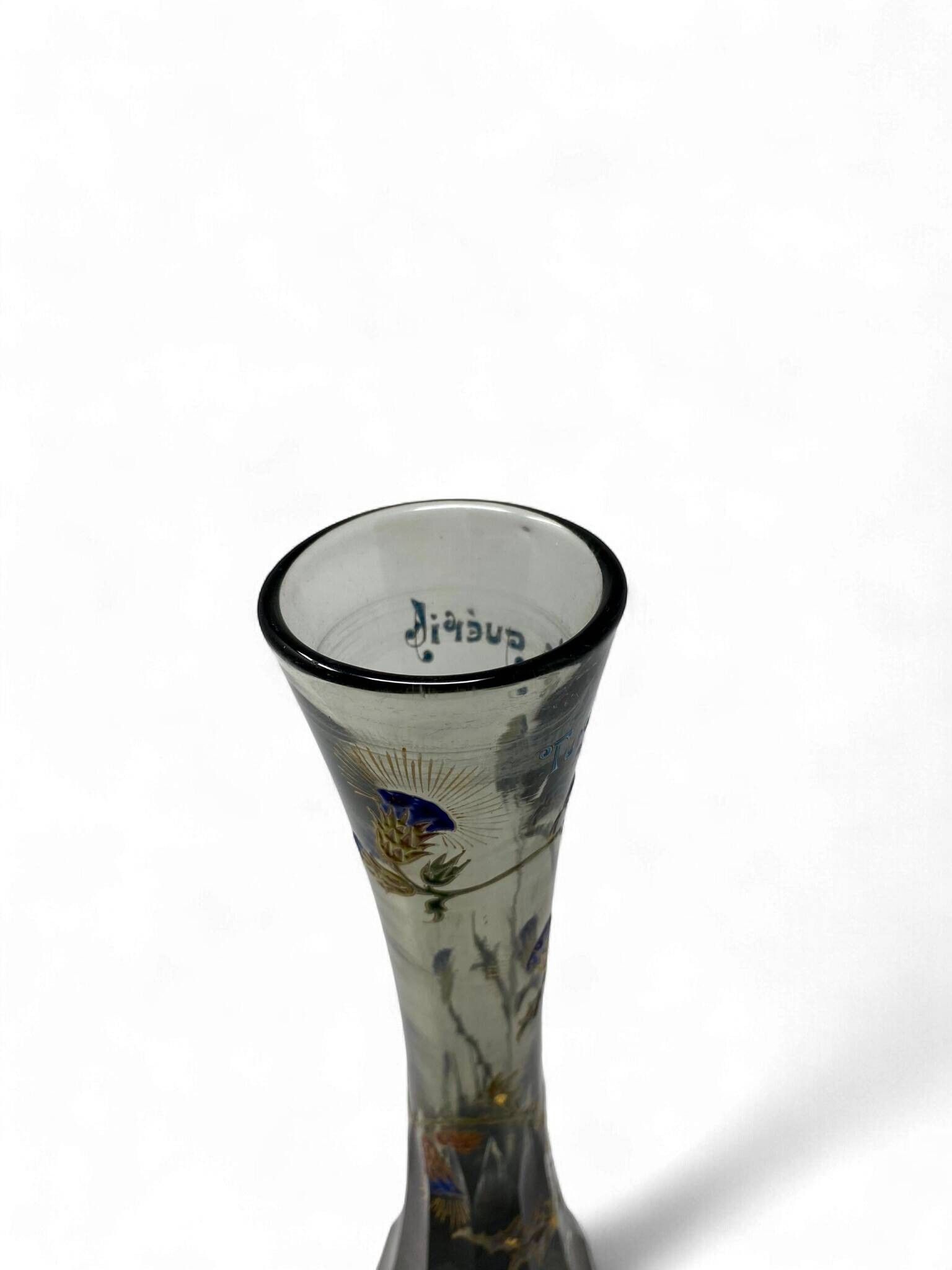 "Turquoise heals. Smoked glass diabolo vase with a body entirely cut with facets in the lower part. Enamelled decoration of Lorraine thistles and a thistle weevil in polychrome enamels highlighted with gold. Titled on the neck (chip at bottom).