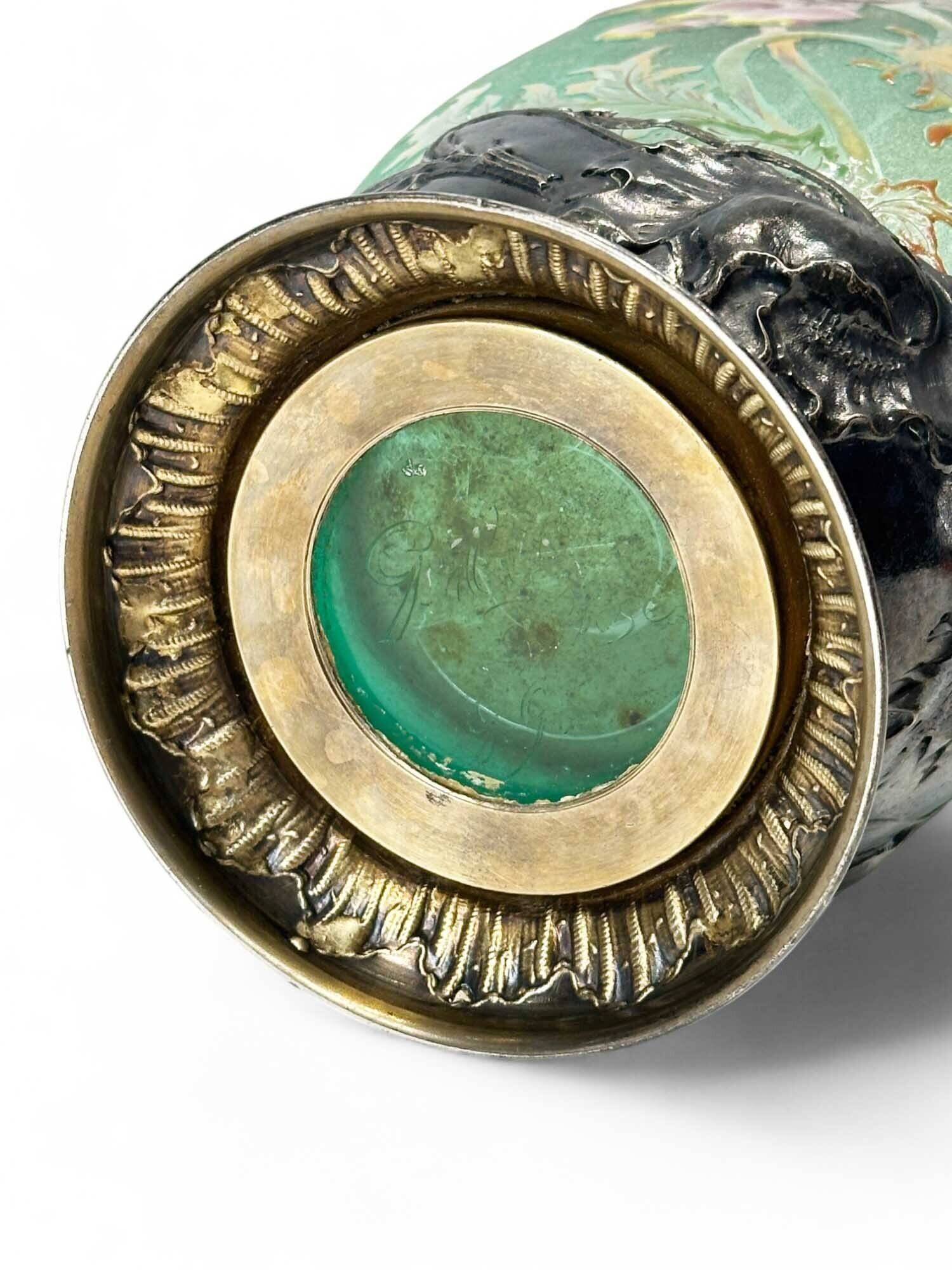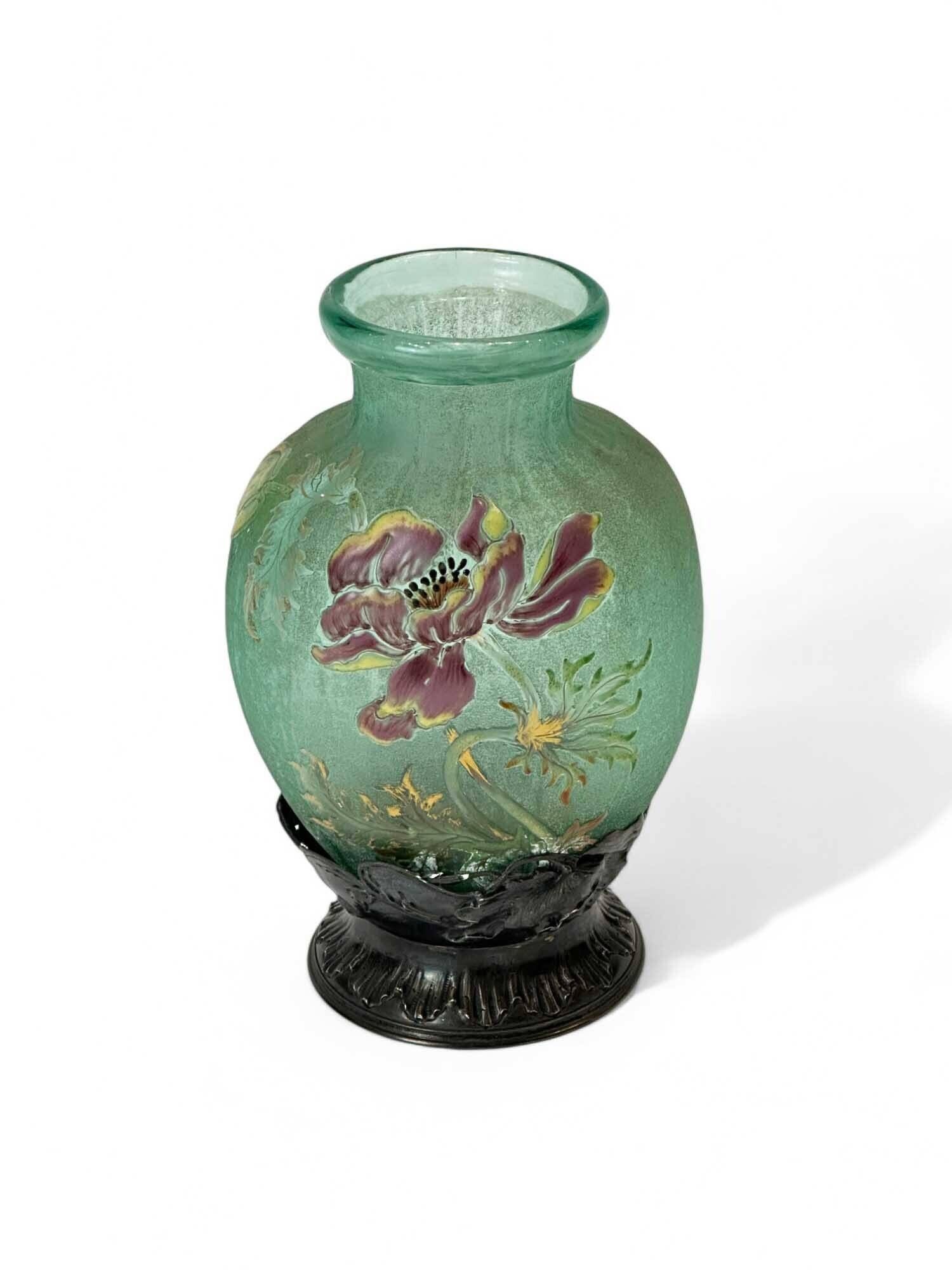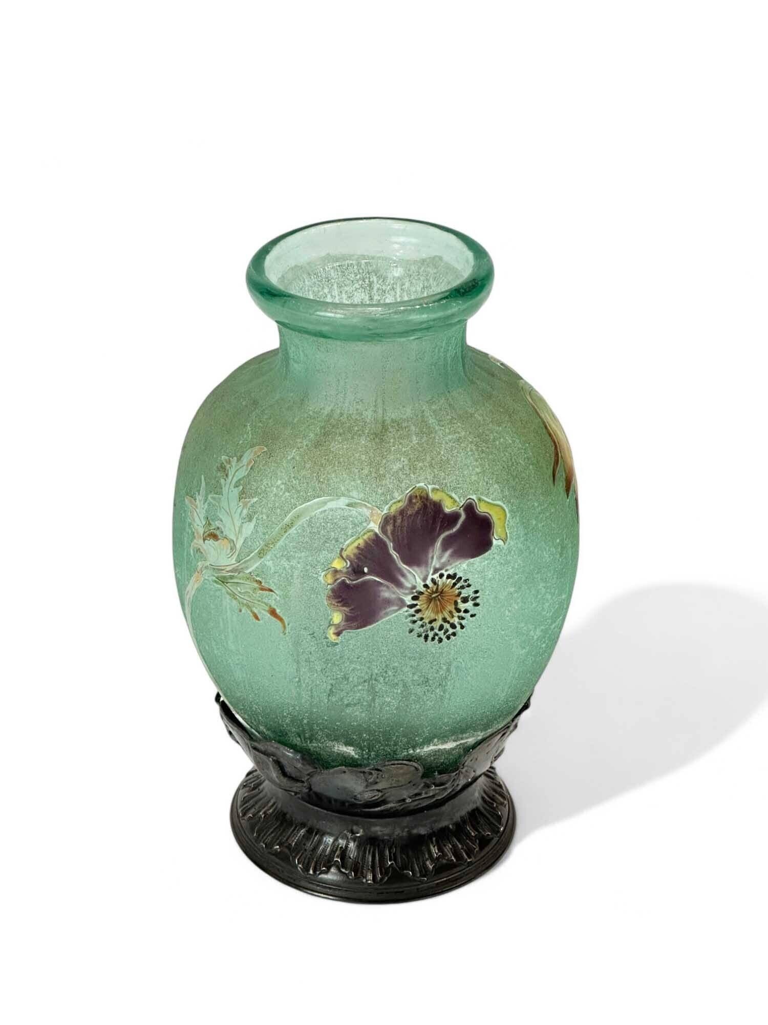 Vase with ovoid body and hemmed neck. Proof in light green glass. Acid-etched anemone design entirely enhanced with natural polychrome enamels and gilding on a frosted background. The lower part of the mounting is in silver with an anemone motif in light relief and partially cut out.