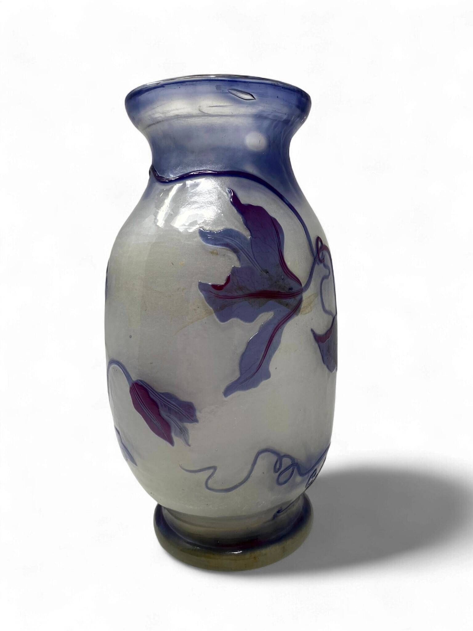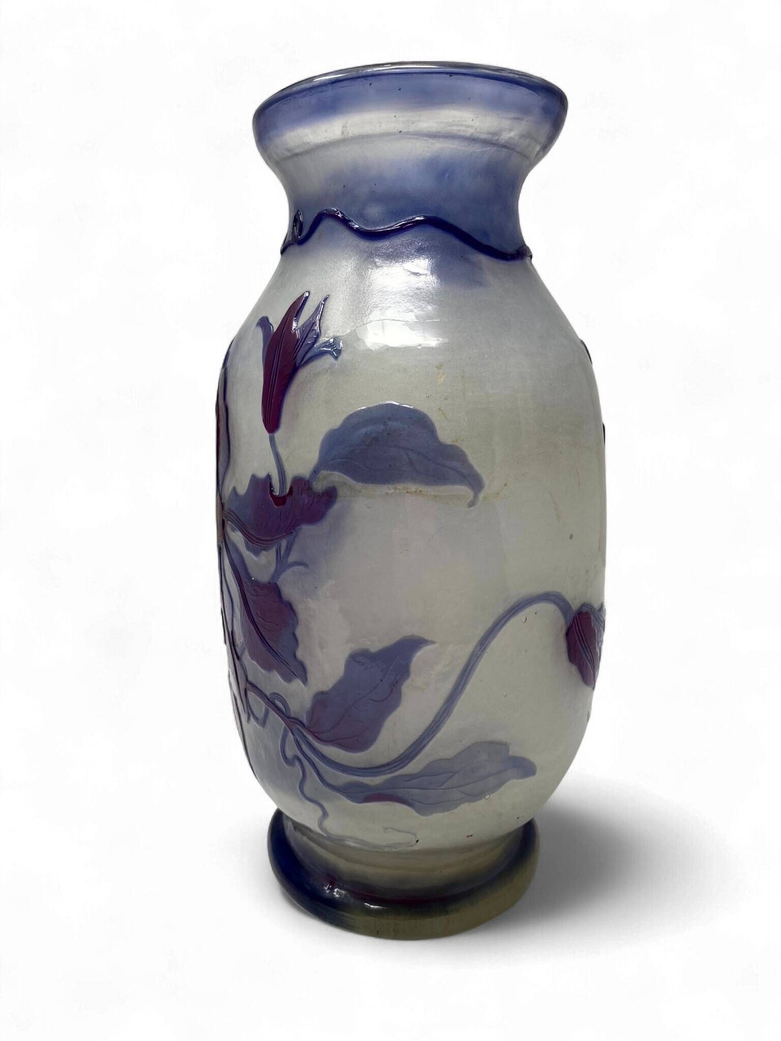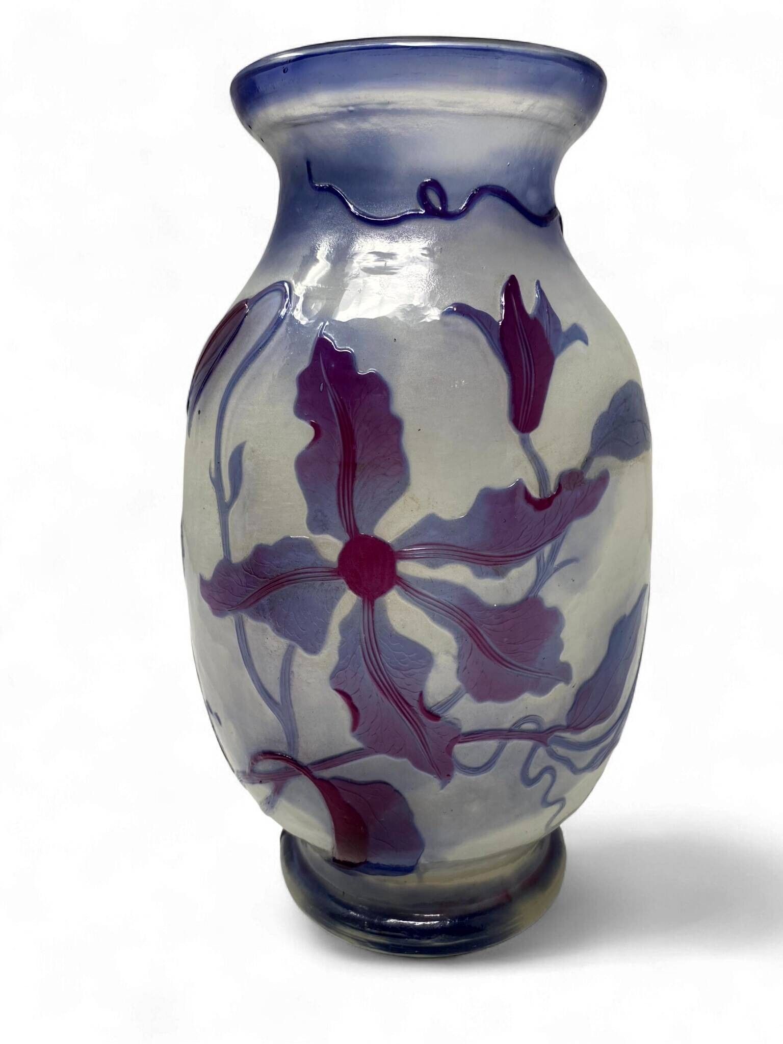 Ovoid vase with shoulder and conical neck on a slightly recessed ring heel. Violet and pink glass on a whitish ground. Cameo engraved with clematis.