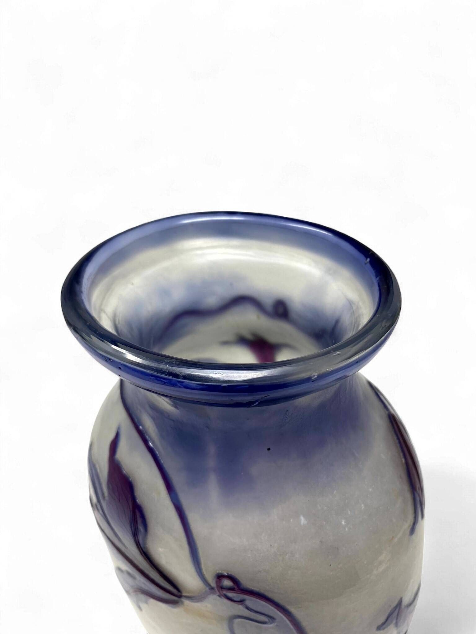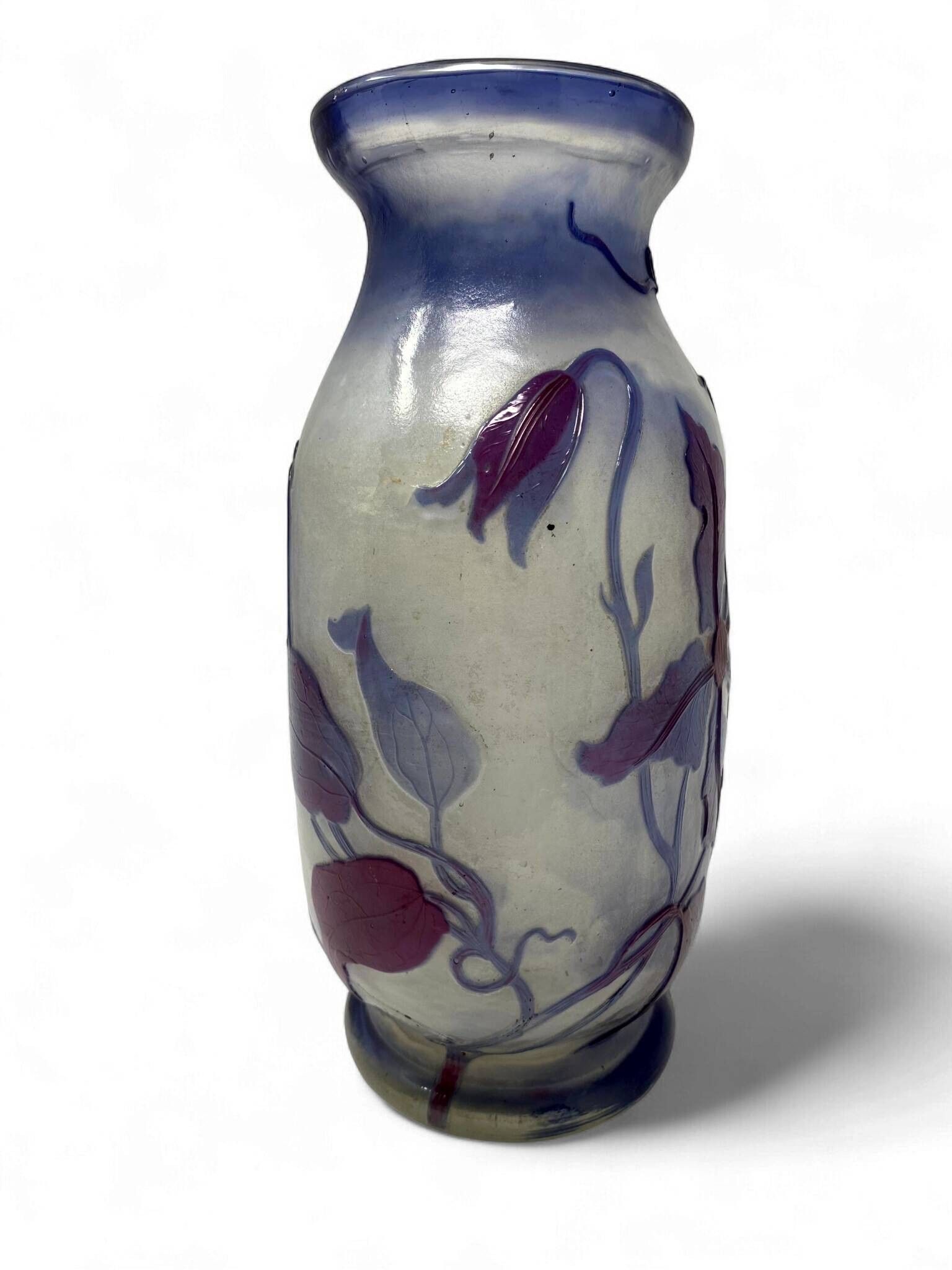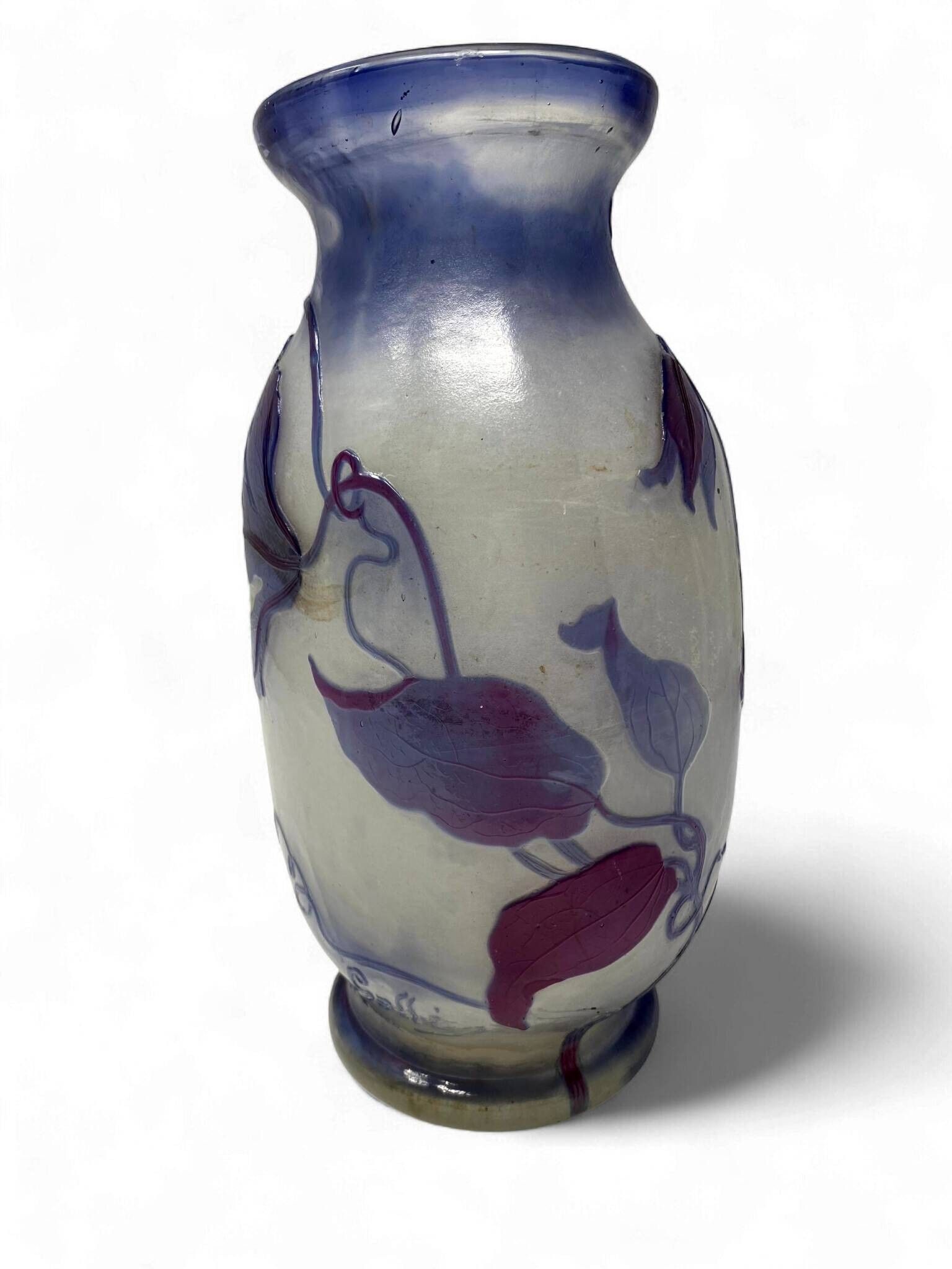 Ovoid vase with shoulder and conical neck on a slightly recessed ring heel. Violet and pink glass on a whitish ground. Cameo engraved with clematis.