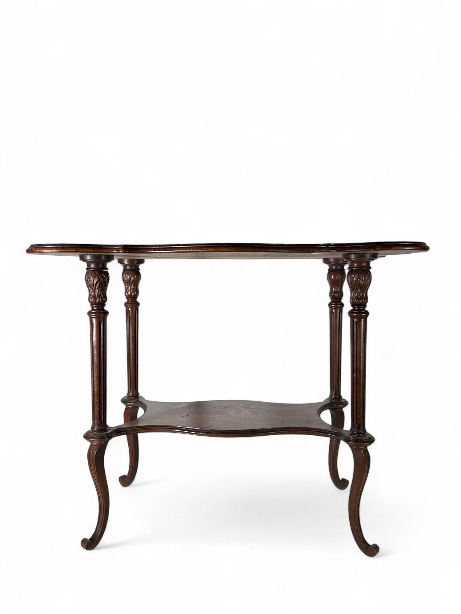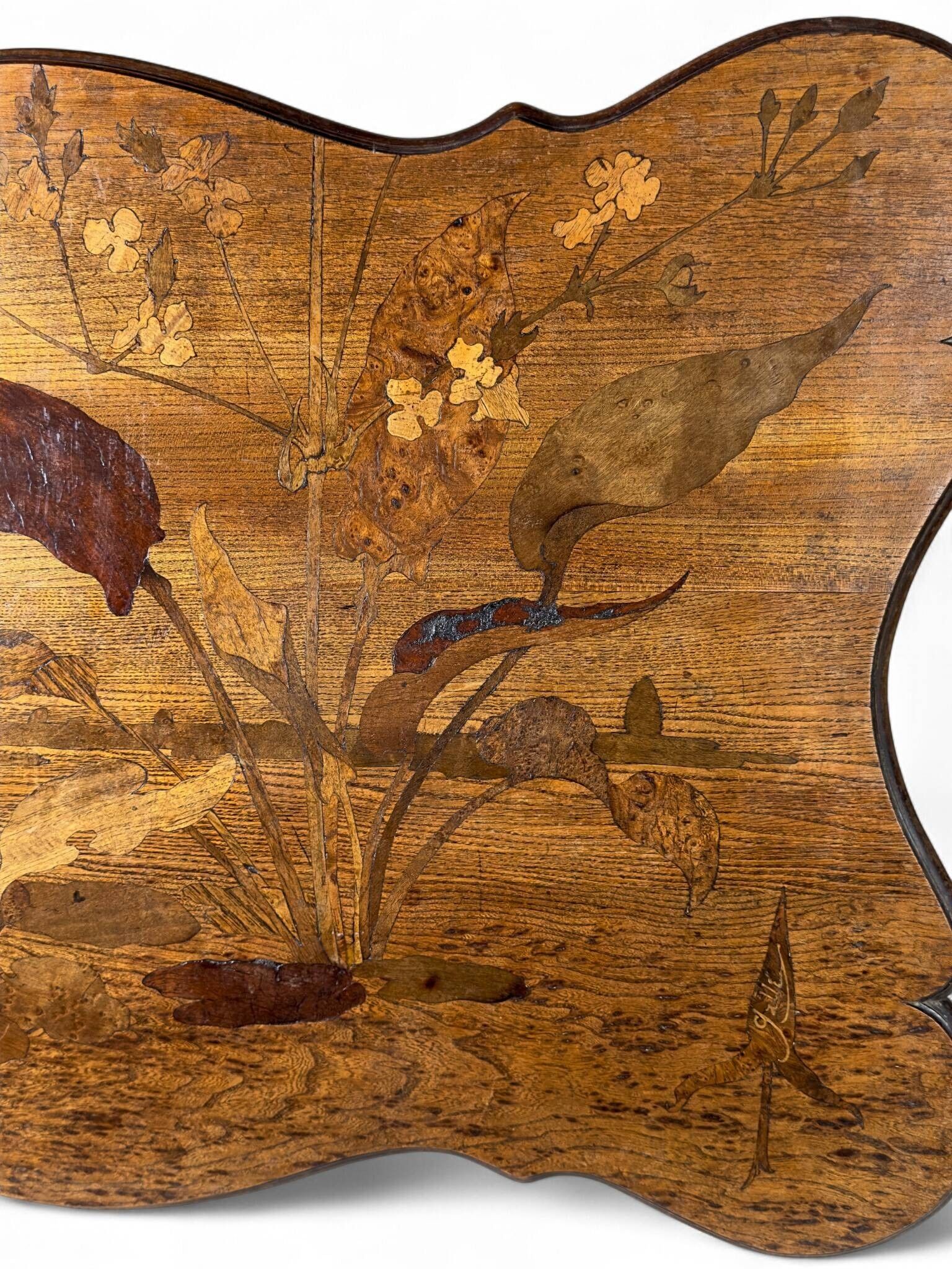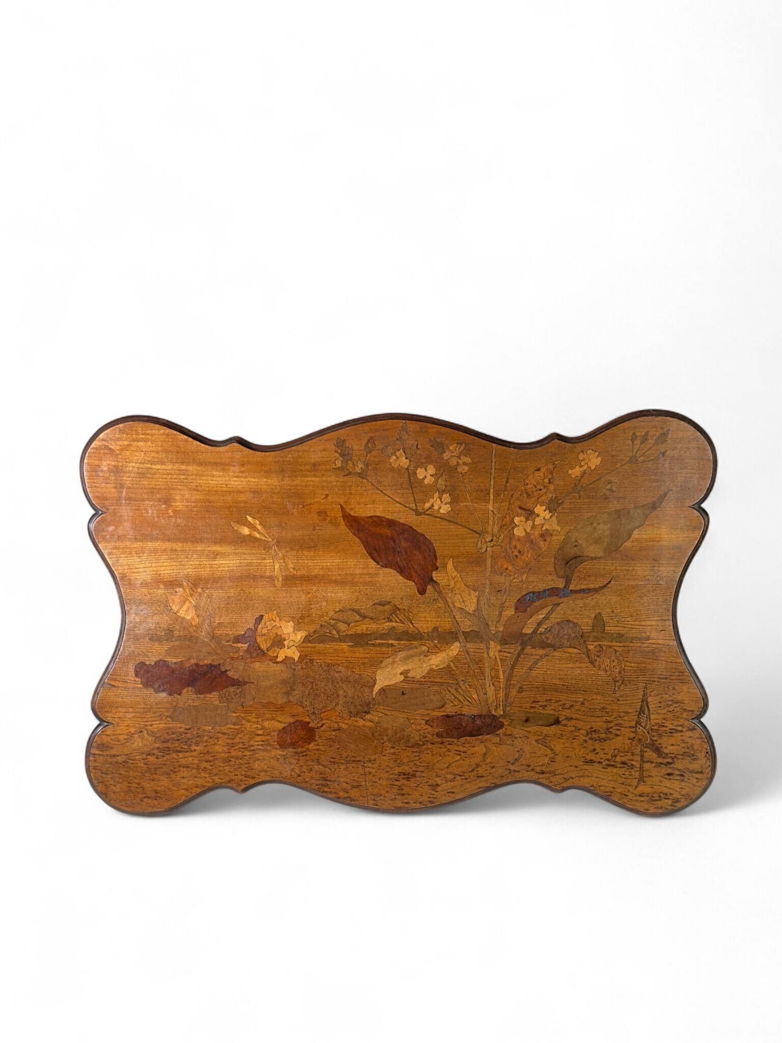 Carved moulded walnut tea table with two multi-lobed rectangular tops in marquetry of different woods, decorated with a dragonfly and marsh flowers on the first top and water lily buds on the second top. Corner legs with grooved and ringed tubular legs ending in curved feet (scratches, stains).
