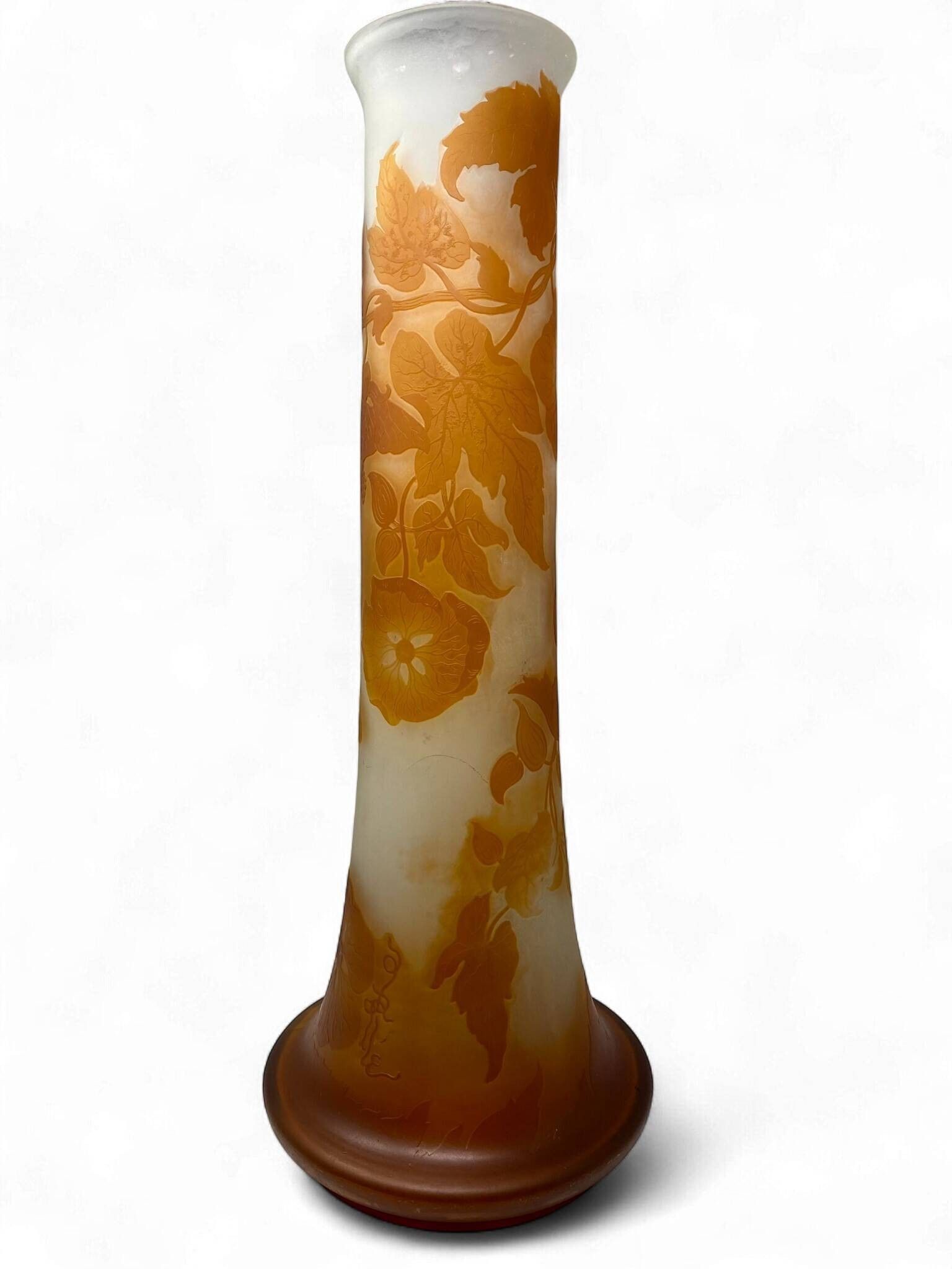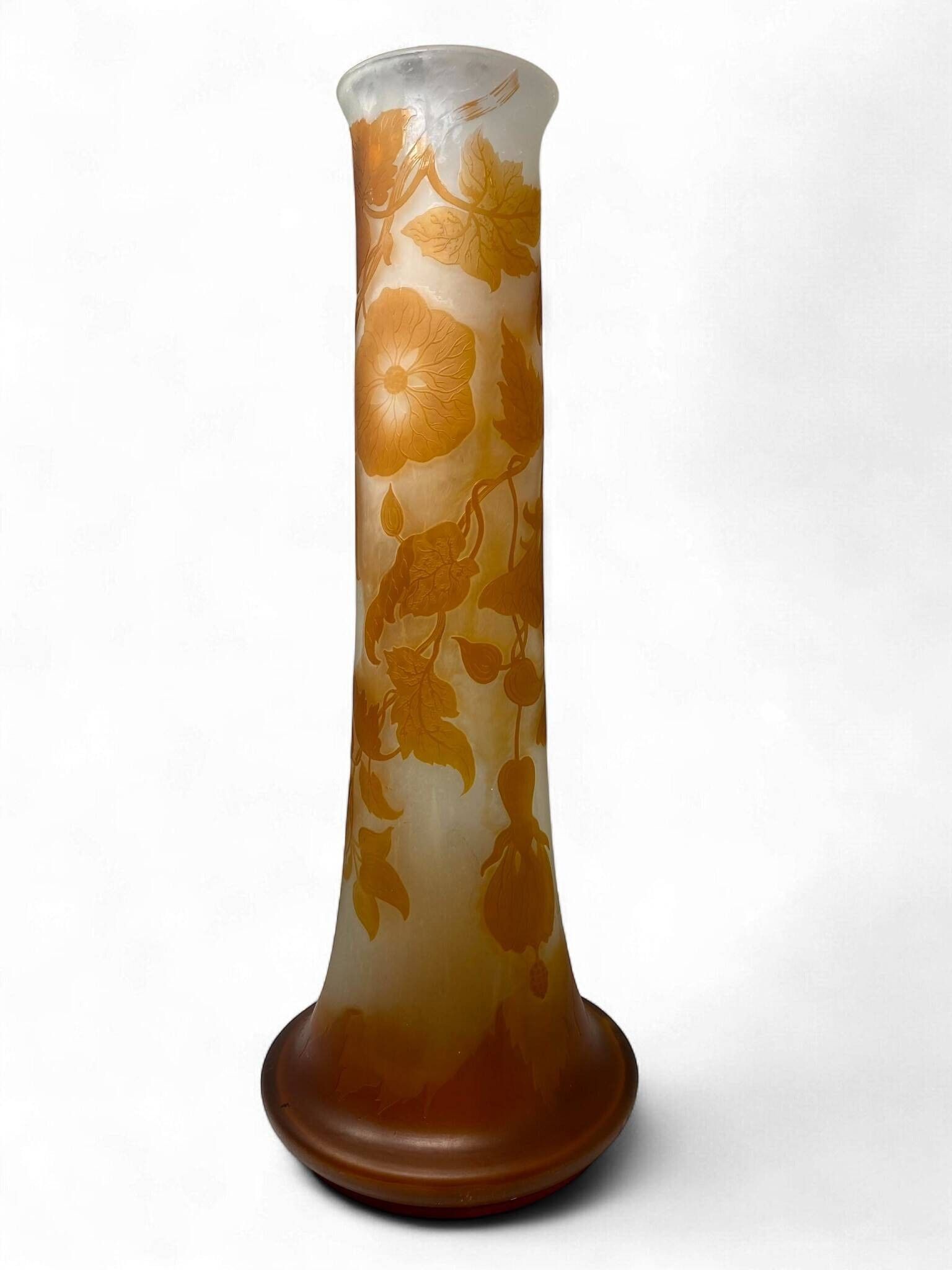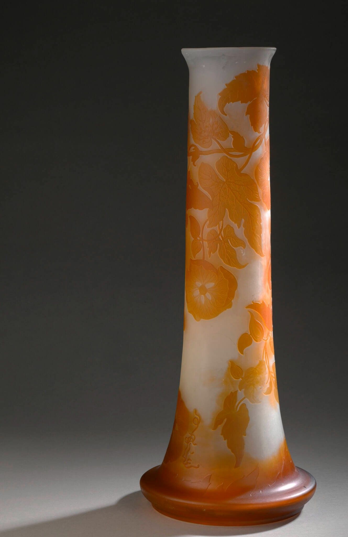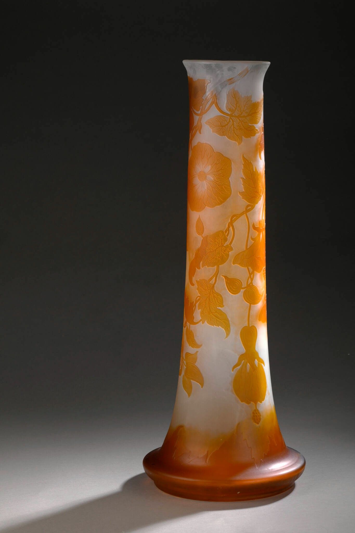 Large, slightly conical tubular vase on a swollen base with a slightly recessed ring foot. Proof in lined orange glass on a whitish ground. Décor of abutilon engraved in cameo with acid (small defects of matter).