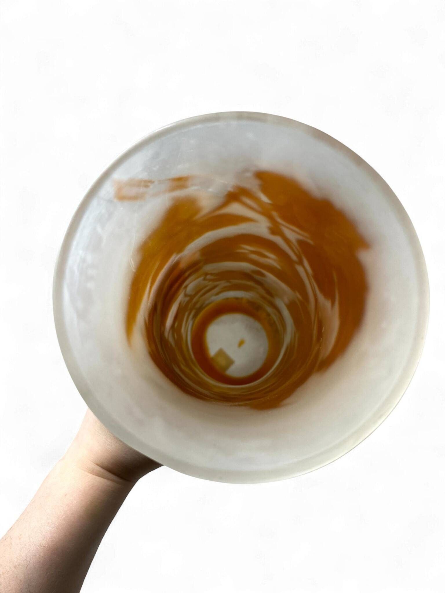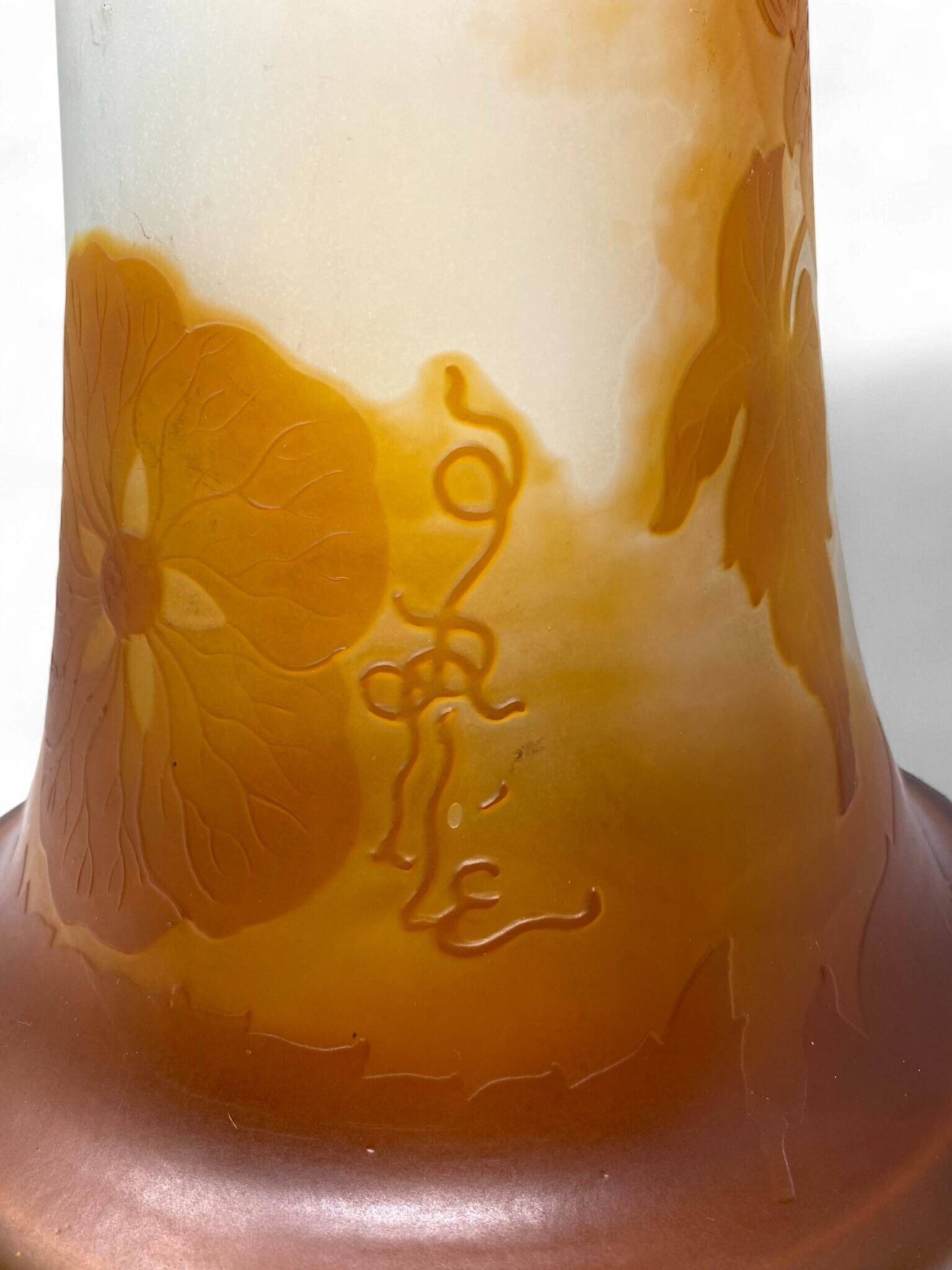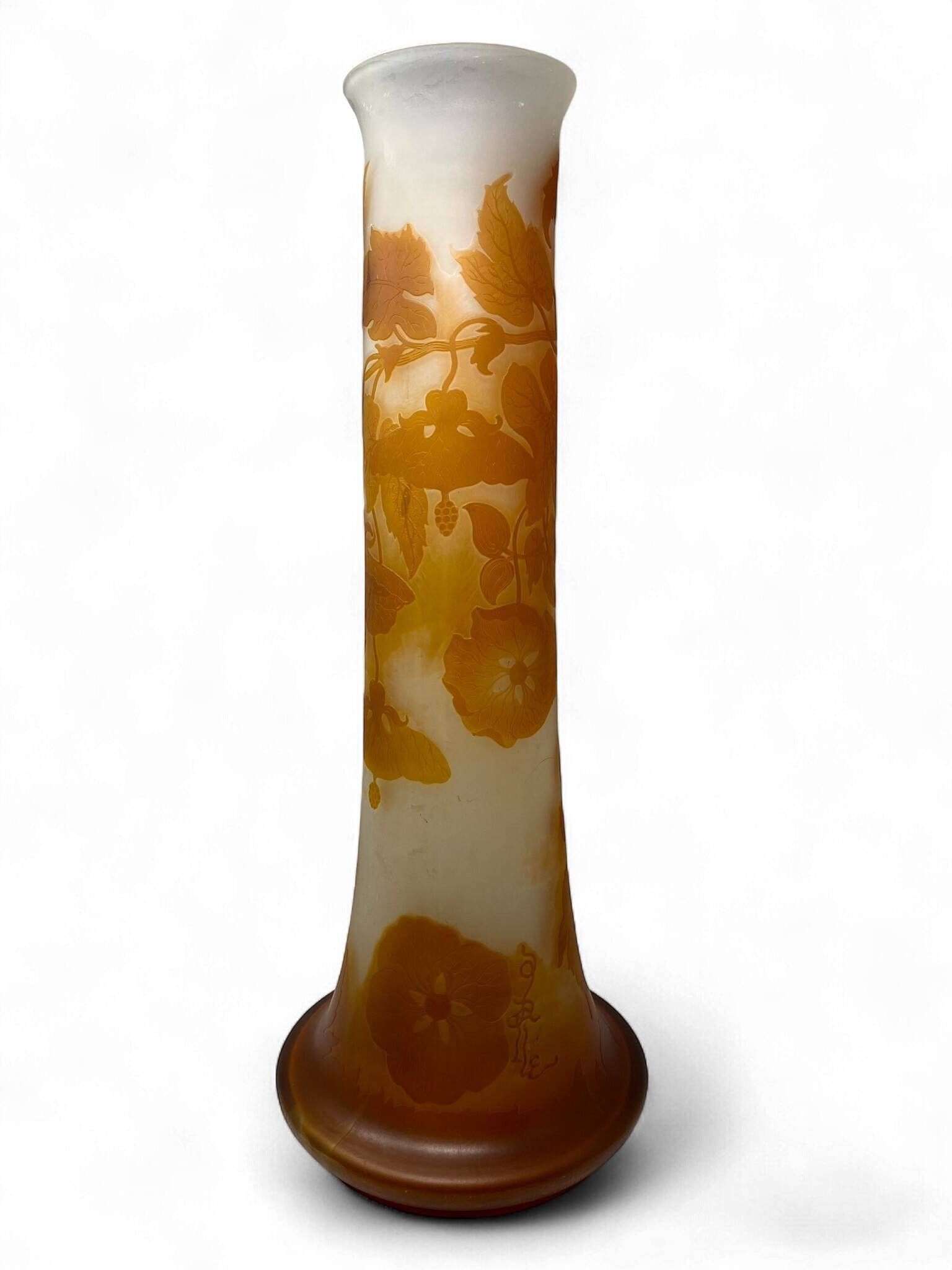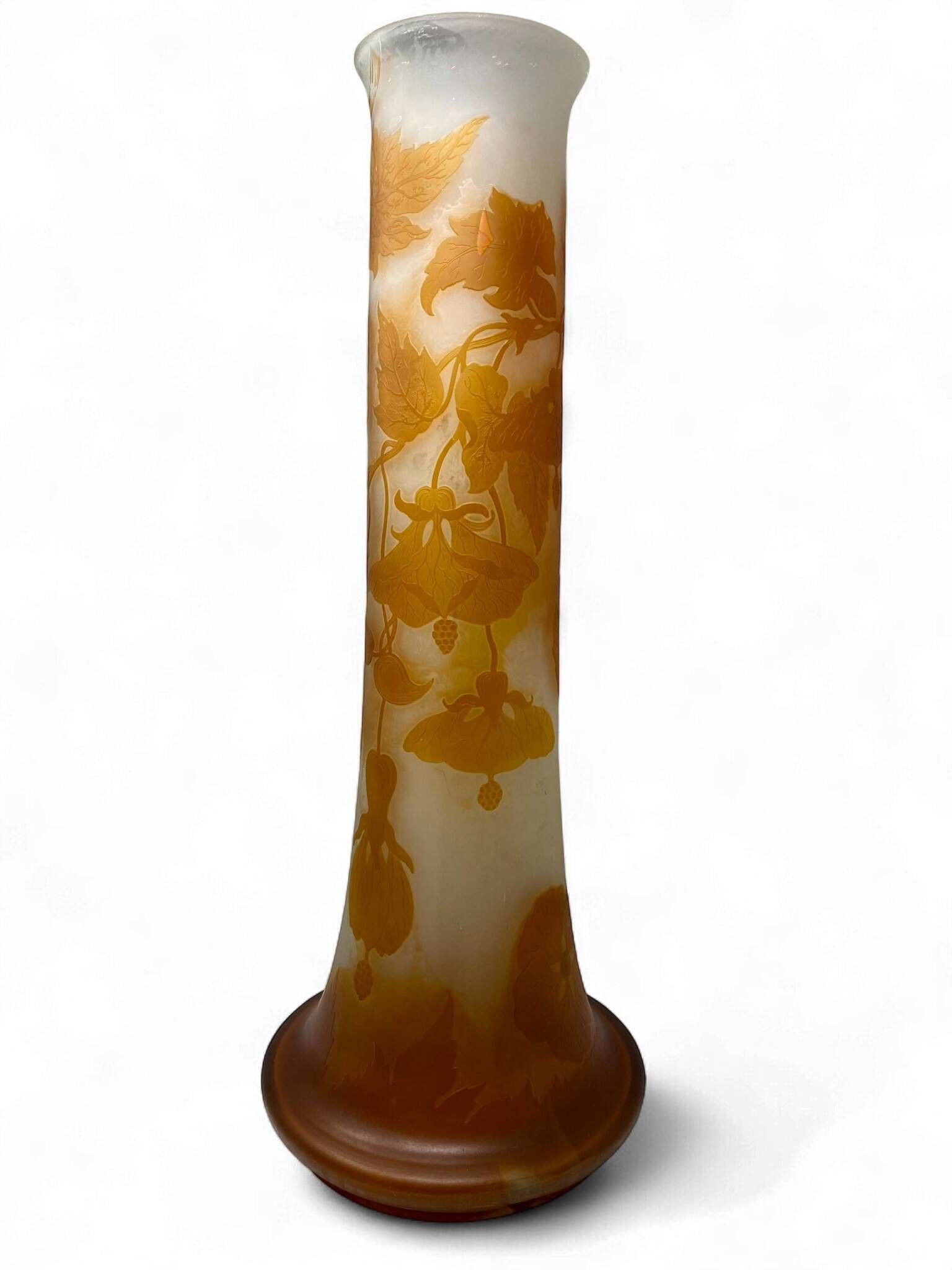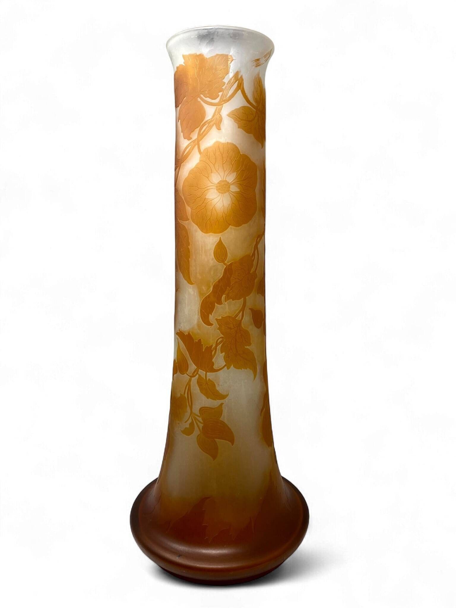 Large, slightly conical tubular vase on a swollen base with a slightly recessed ring foot. Proof in lined orange glass on a whitish ground. Décor of abutilon engraved in cameo with acid (small defects of matter).