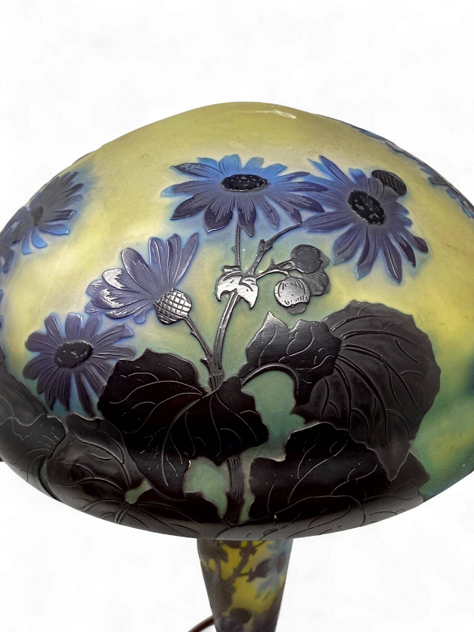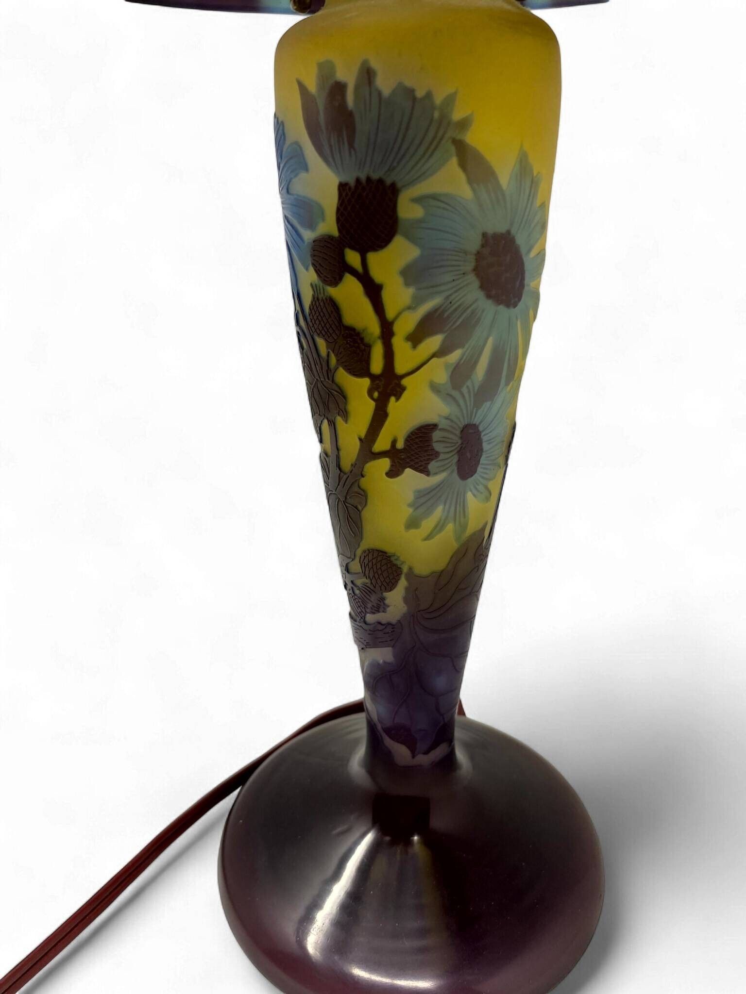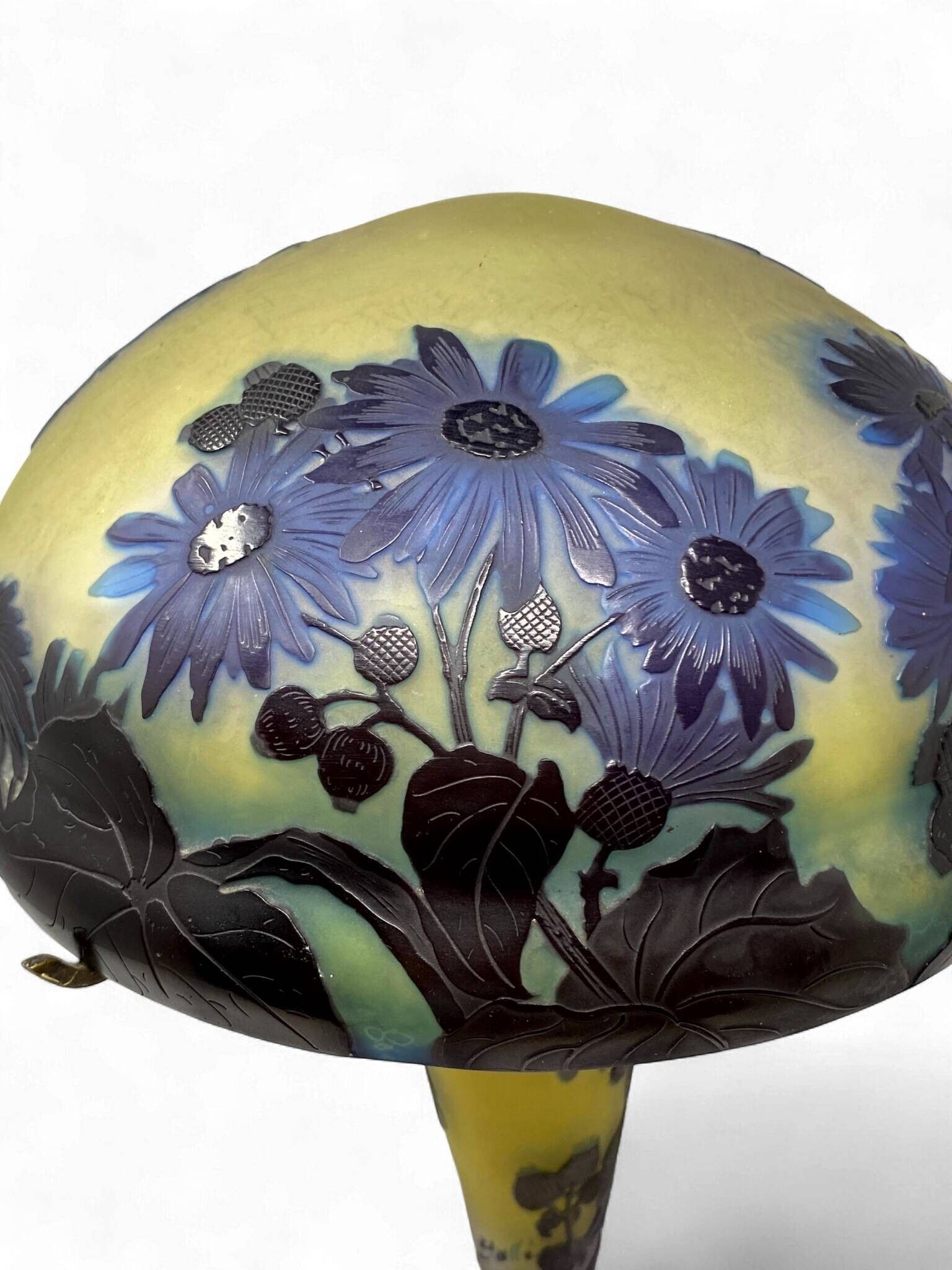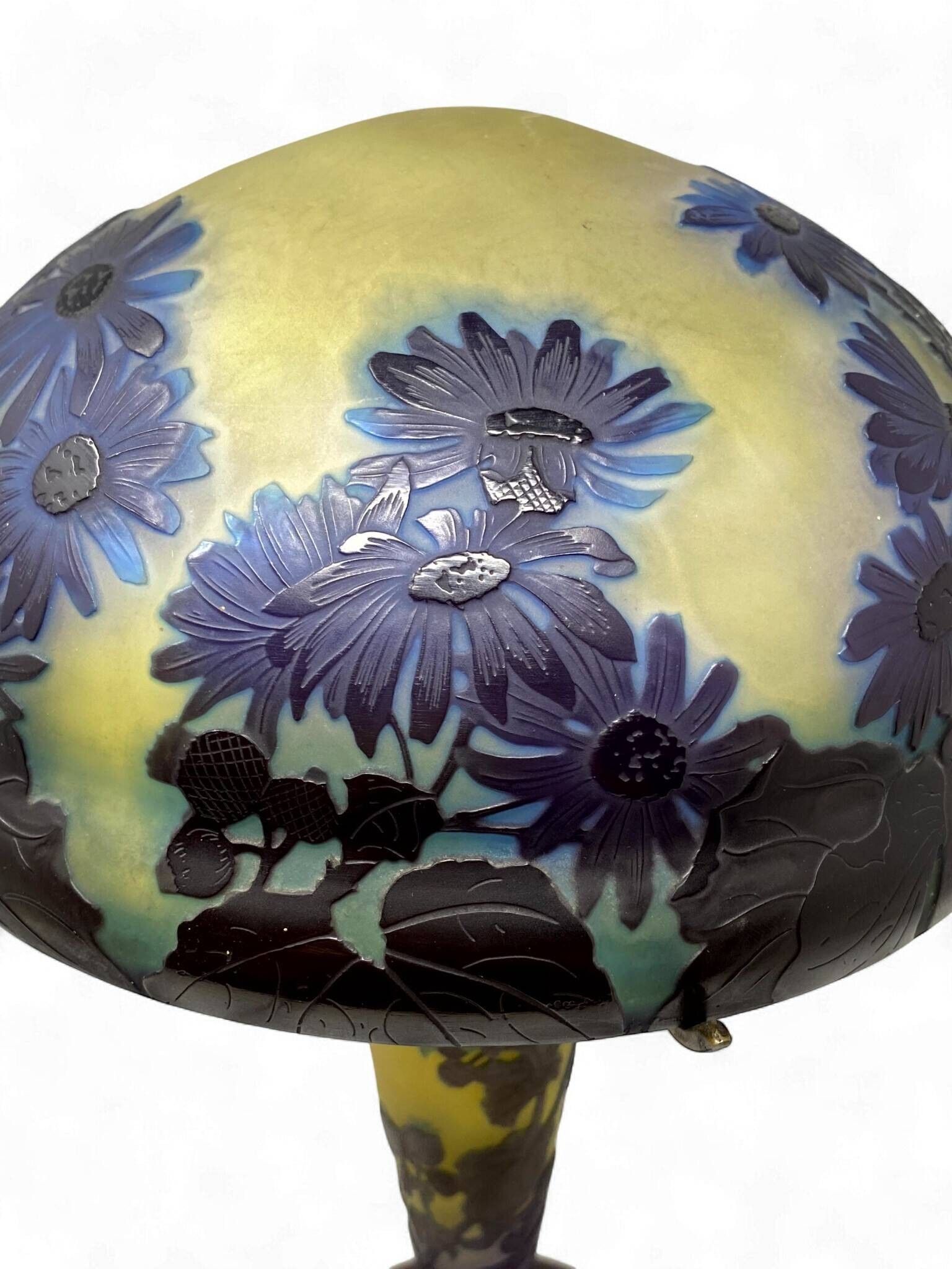 Table lamp with shouldered conical foot on circular base and mushroom shade. Violet and blue glass on a yellow background. Acid-etched gerbera design. Three-arm brass system (small chips on the neck).