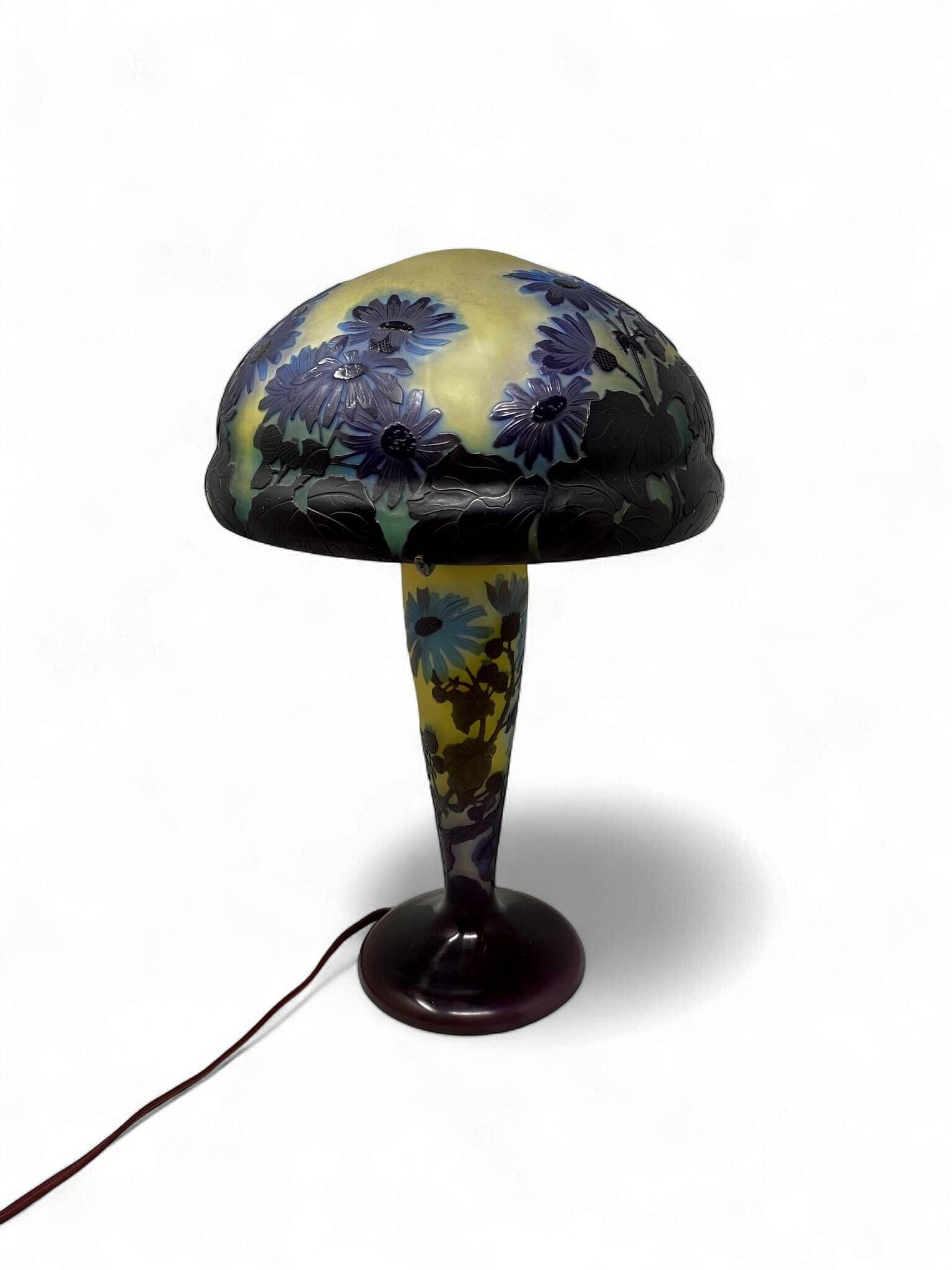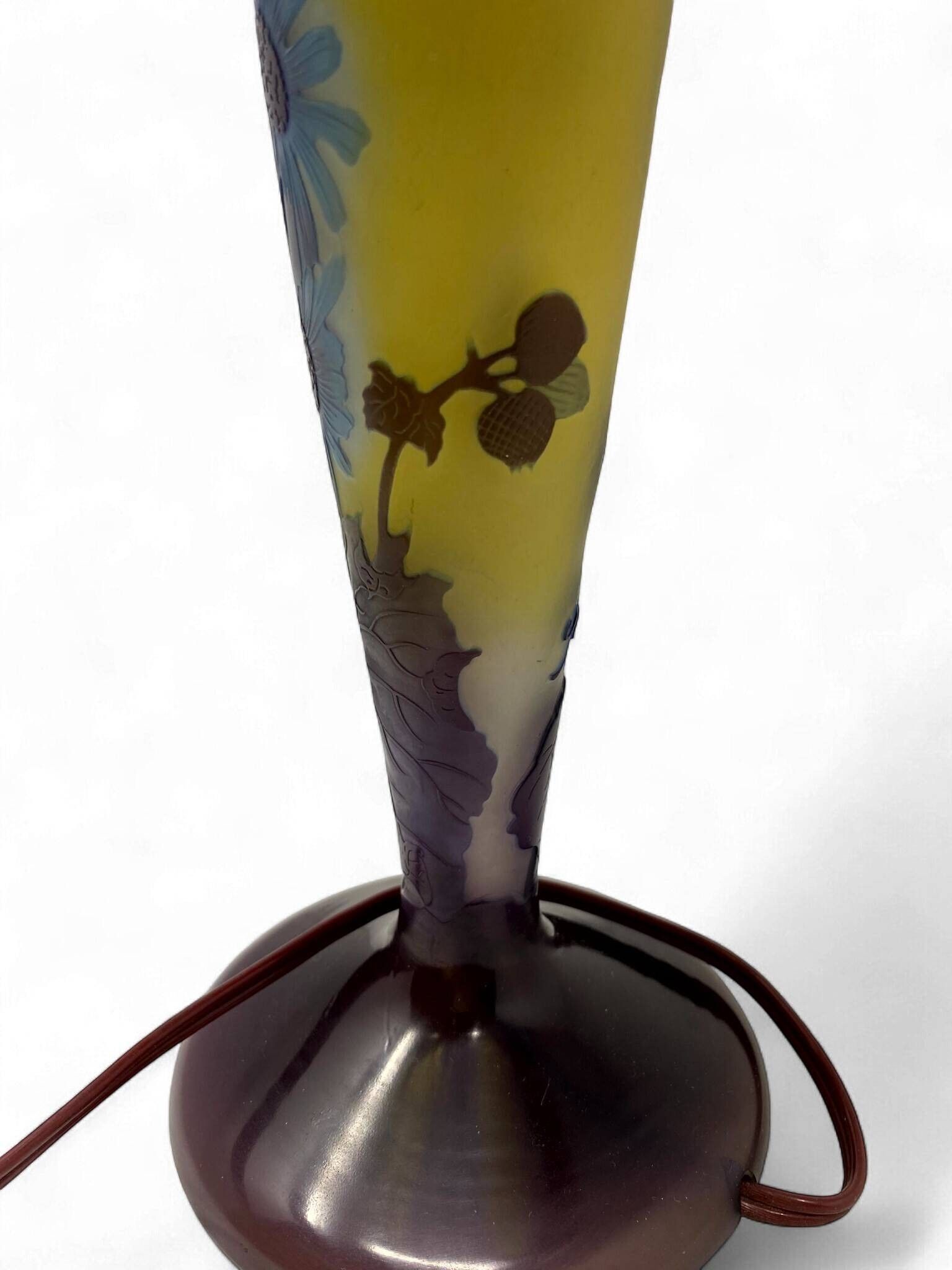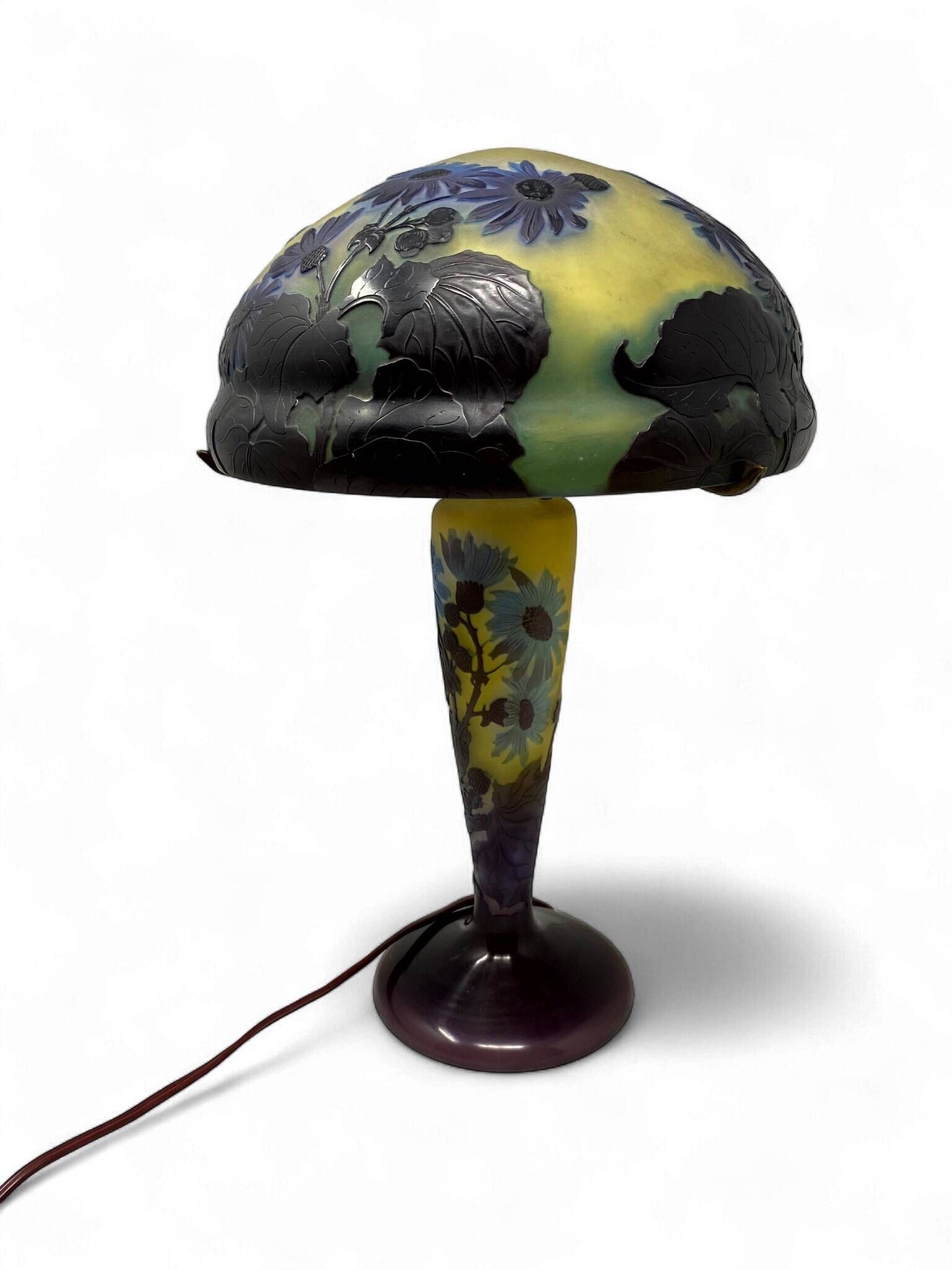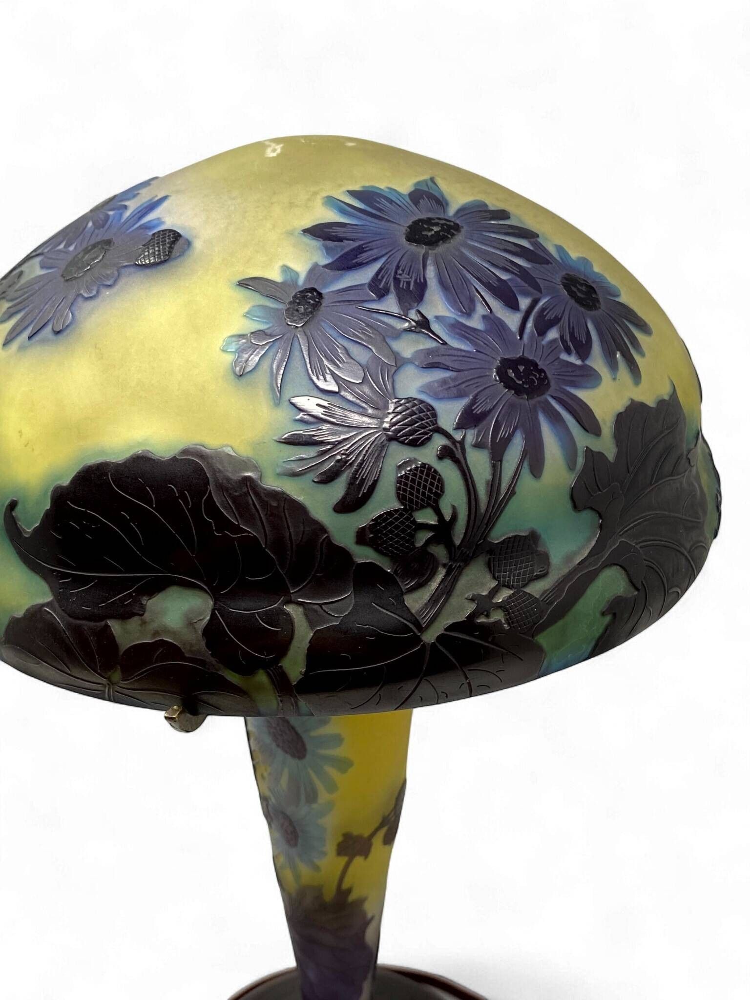 Table lamp with shouldered conical foot on circular base and mushroom shade. Violet and blue glass on a yellow background. Acid-etched gerbera design. Three-arm brass system (small chips on the neck).