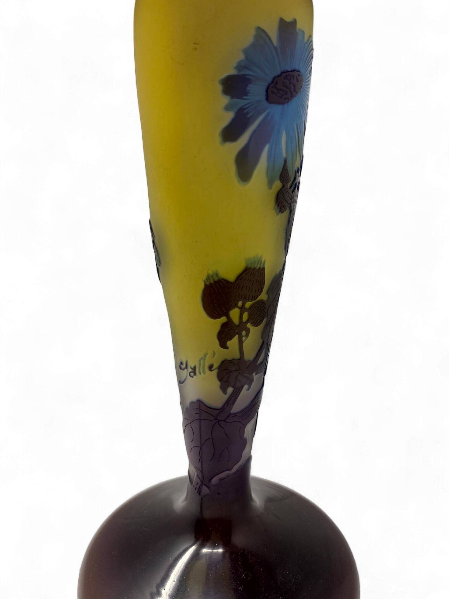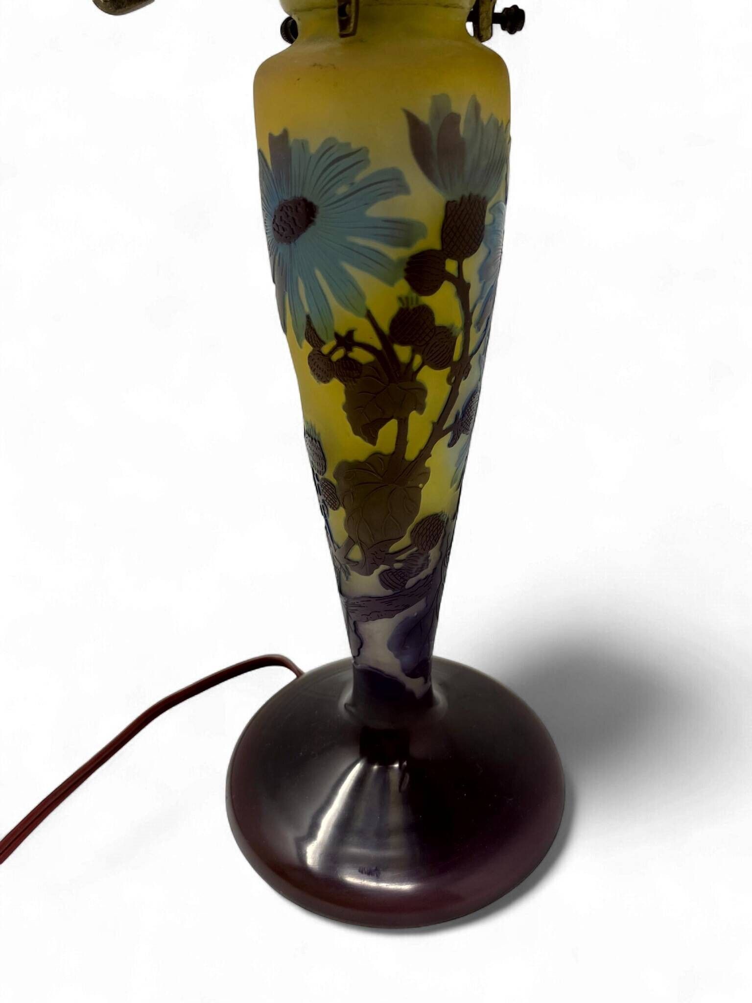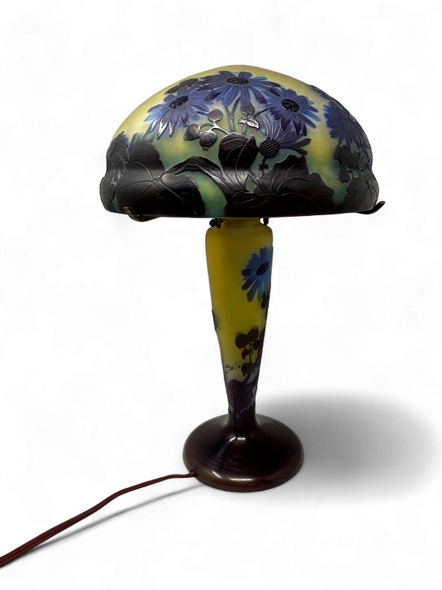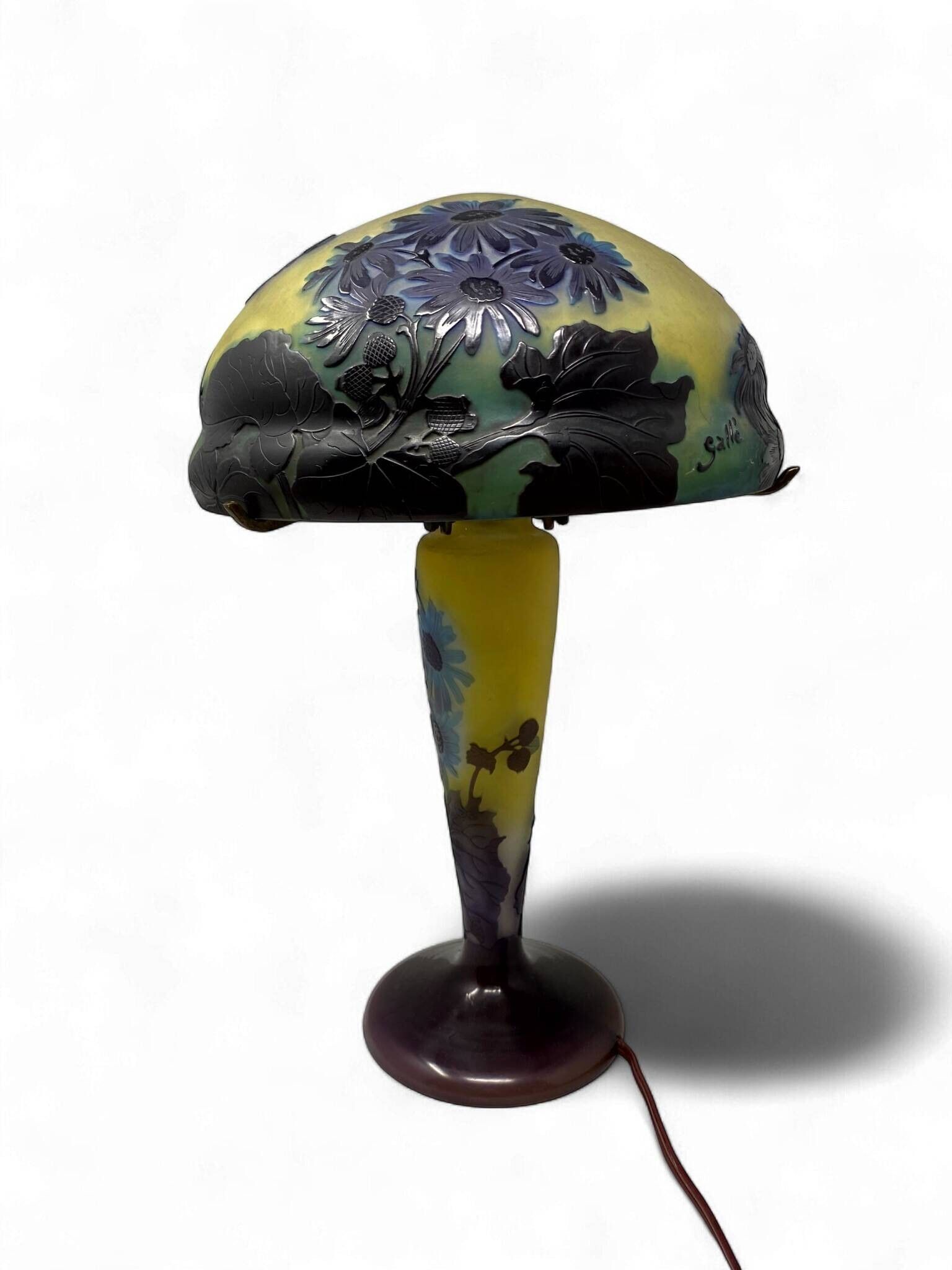 Table lamp with shouldered conical foot on circular base and mushroom shade. Violet and blue glass on a yellow background. Acid-etched gerbera design. Three-arm brass system (small chips on the neck).
