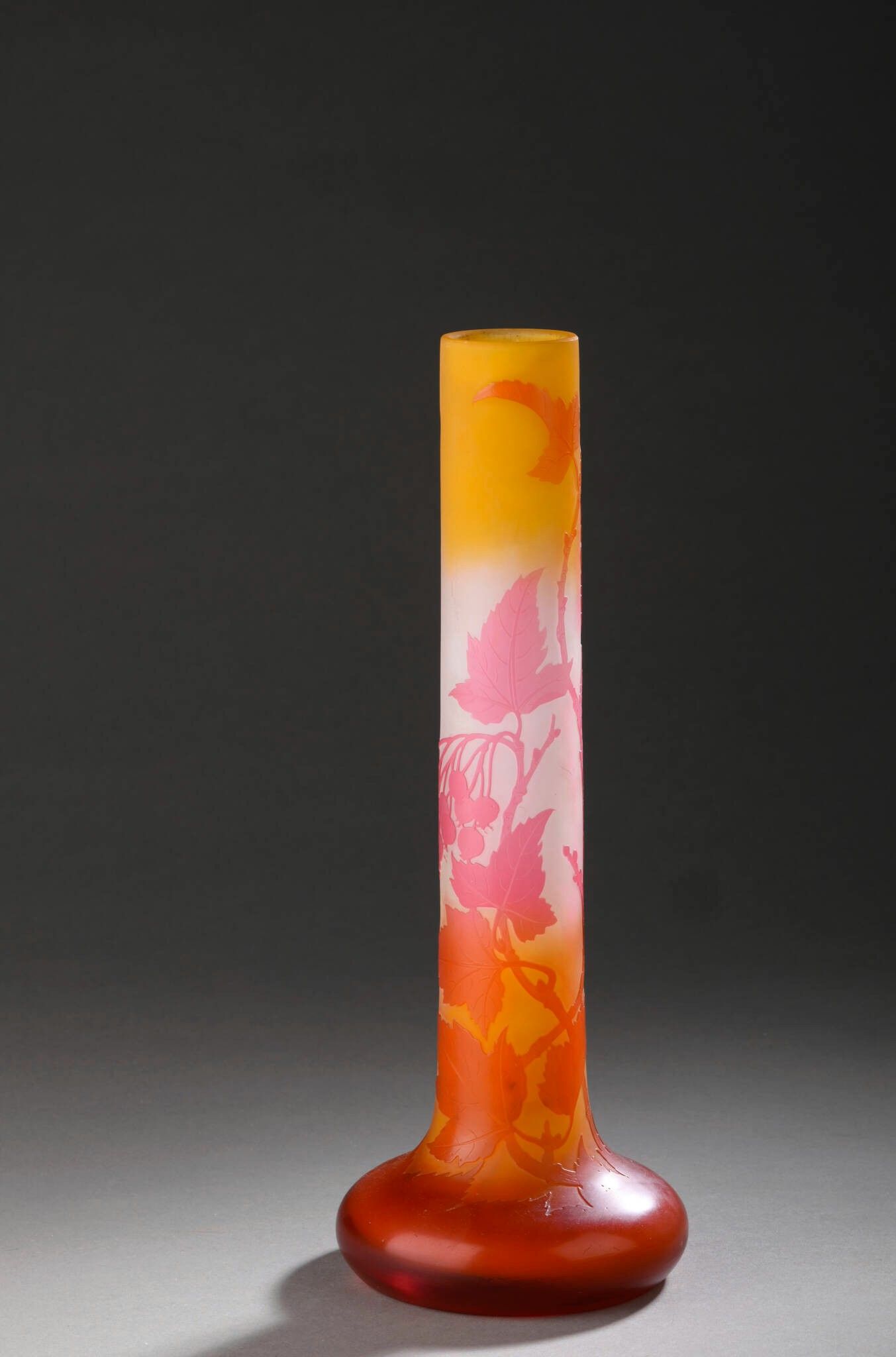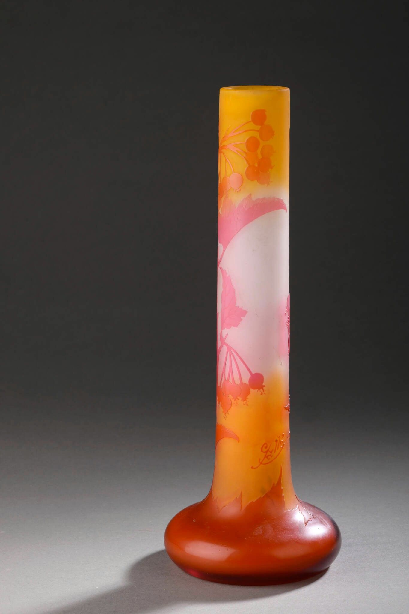 Soliflore with long tubular neck on flattened ovoid base. Pink and orange multi-layered glass on a whitish-orange ground. Acid-etched cameo of berries and leaves.