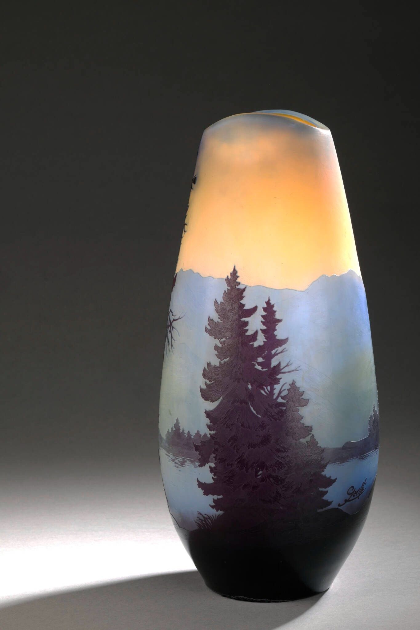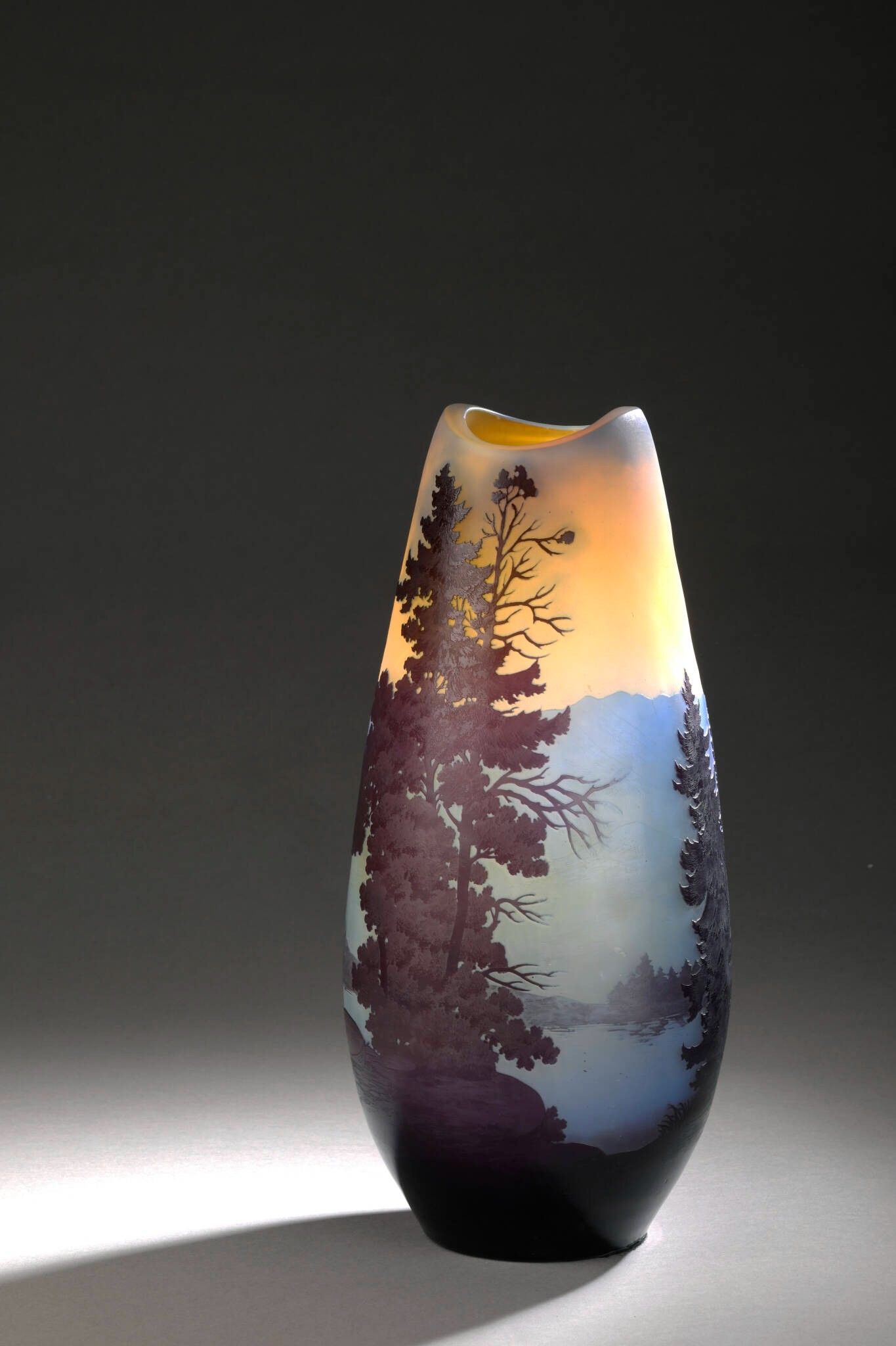 An ovoid vase with a poly-lobed neck on a slight ring heel. Violet and blue multi-layered glass on a yellow ground. Acid-etched cameo of a lakeside forest landscape (slightly ground neck, tiny chips on inner rim).