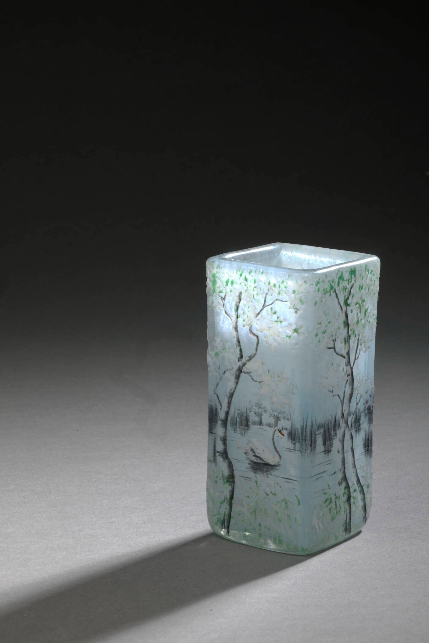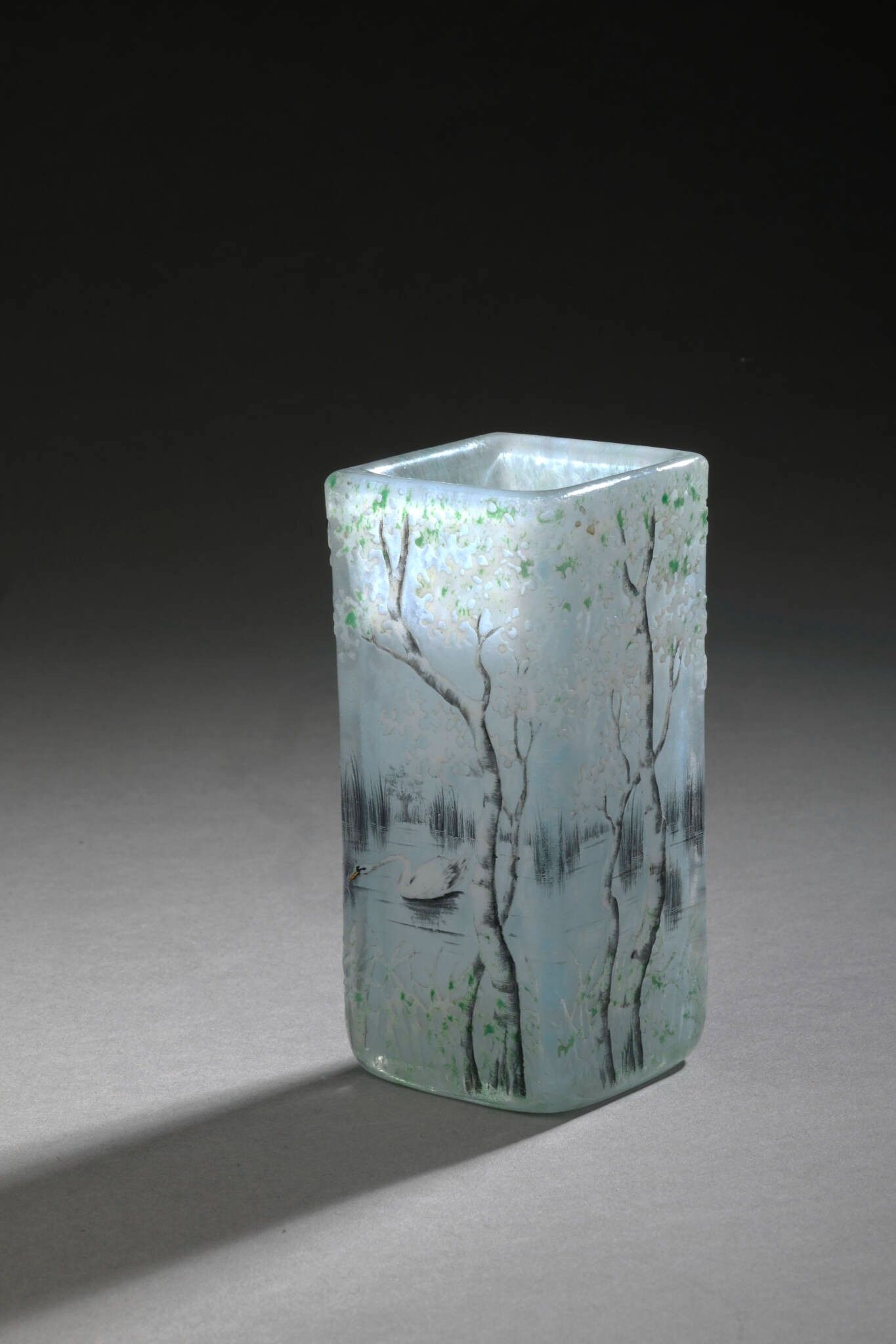 Vase with square body. Proof in bluish-white marbled glass. Décor of swans in a lakeside landscape, acid-etched in reserve and enhanced with polychrome enamels and grisaille on a frosted background.