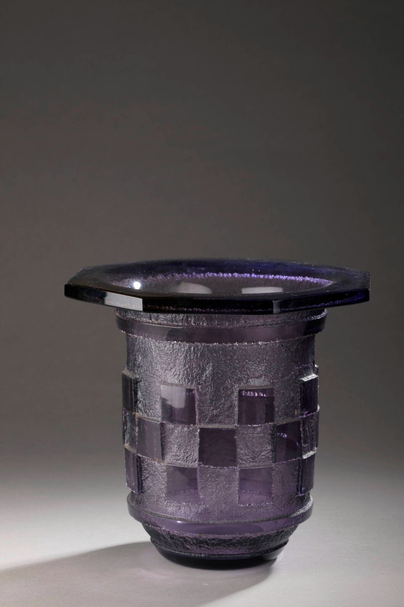 Tubular vase with a wide open octagonal neck on a stepped conical base. Violet crystal proof. Décor of deeply etched squares on a frosted background (chip to the neck).