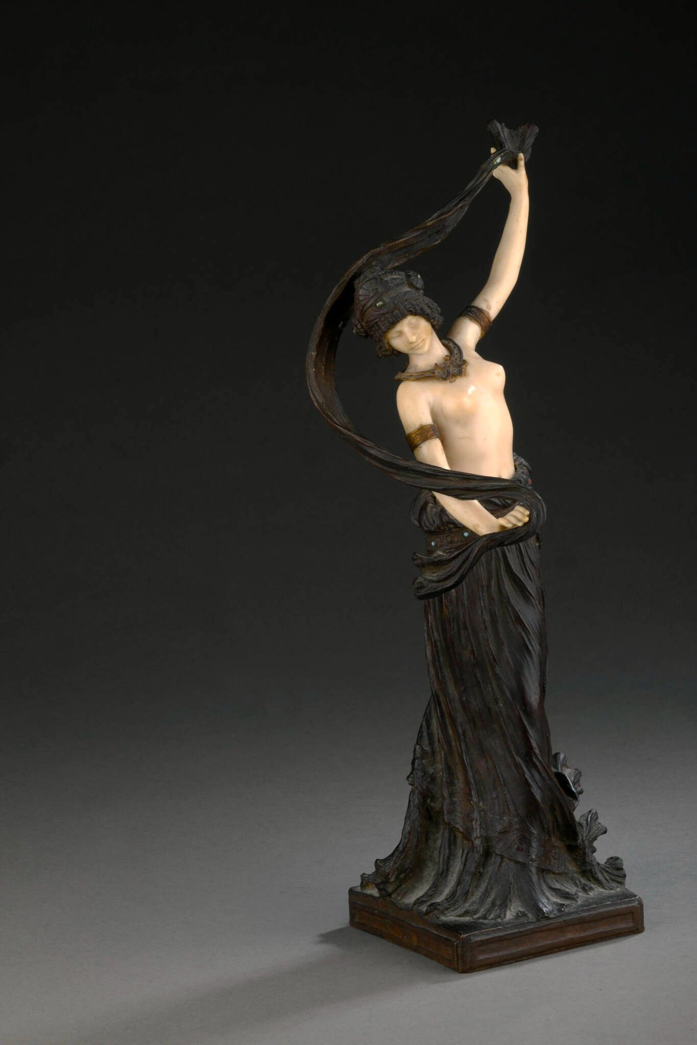 A chryselephantine proof with an antique medal patina, partially gilded and enhanced with coloured enamel cabochons, the upper part of the body carved from elephant ivory (Elephas maximus, Loxodonta africana or Loxodonta cyclotis).