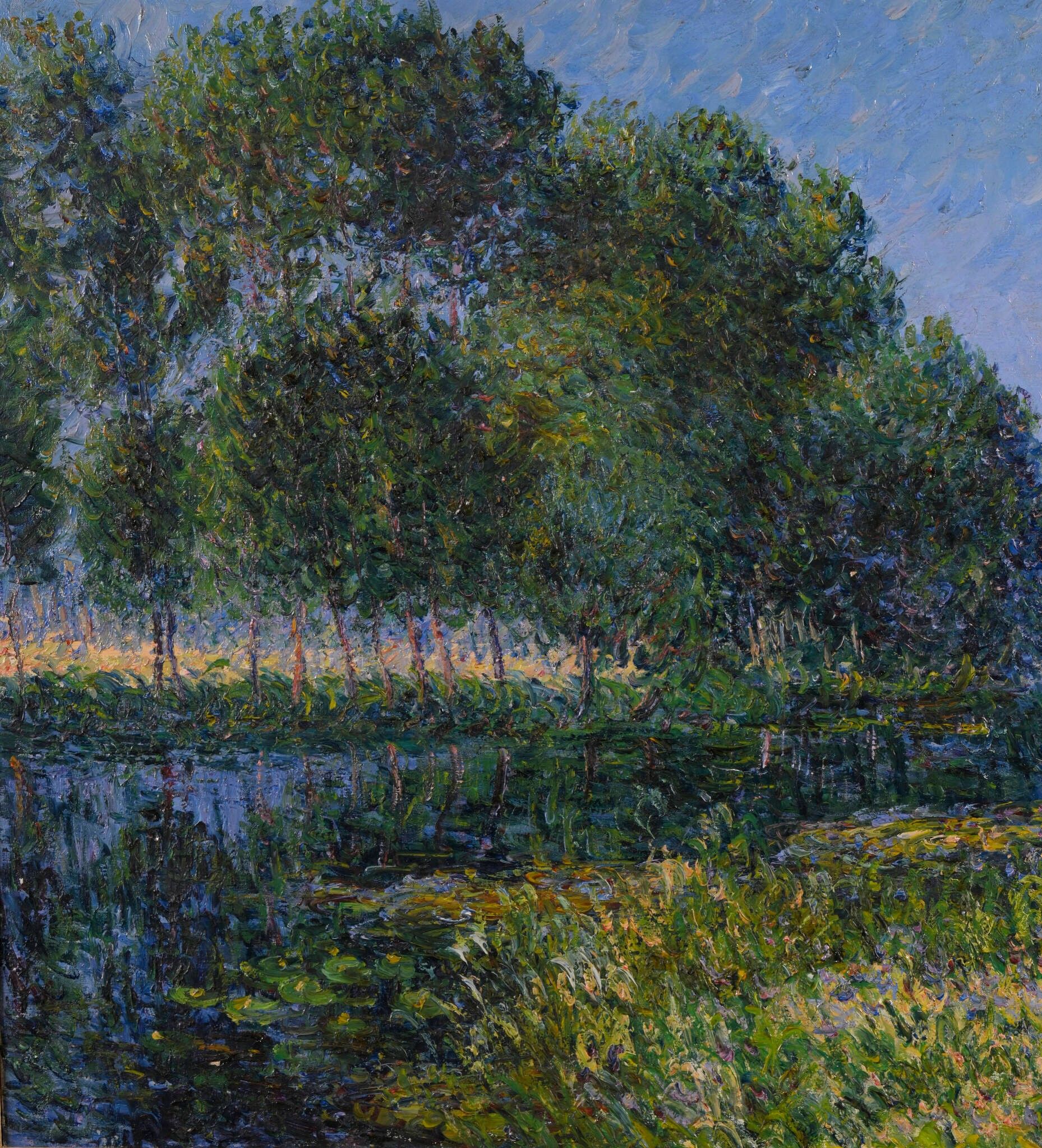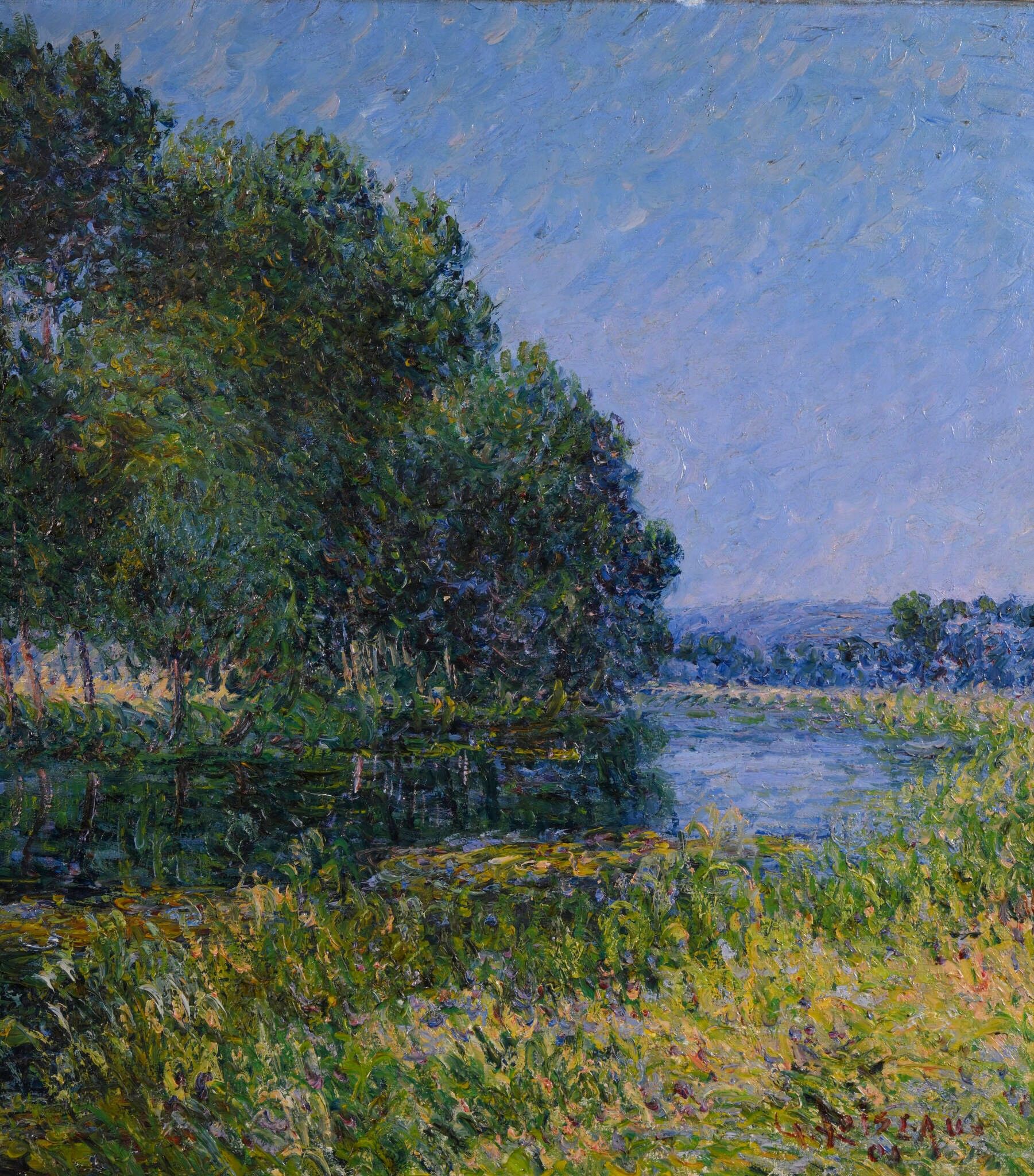 The meandering river runs through the composition, mirroring the reflections of the sky and the foliage, which are occasionally enriched by touches of pure colour. The bright yellows of the foreground resonate in counterpoint with the deep blue-greens of the grove of trees.