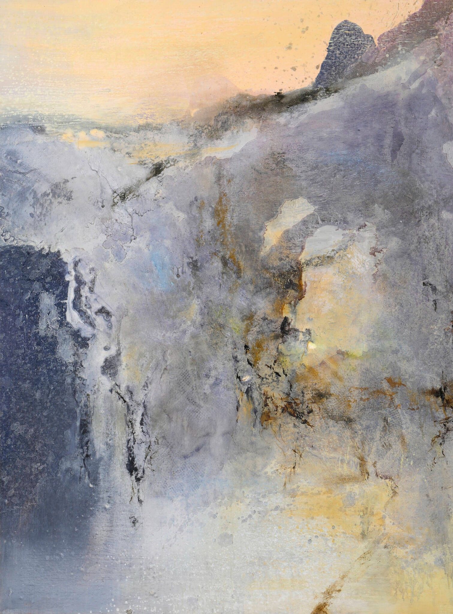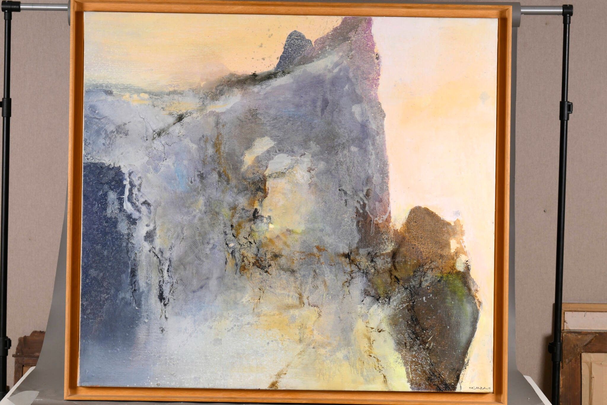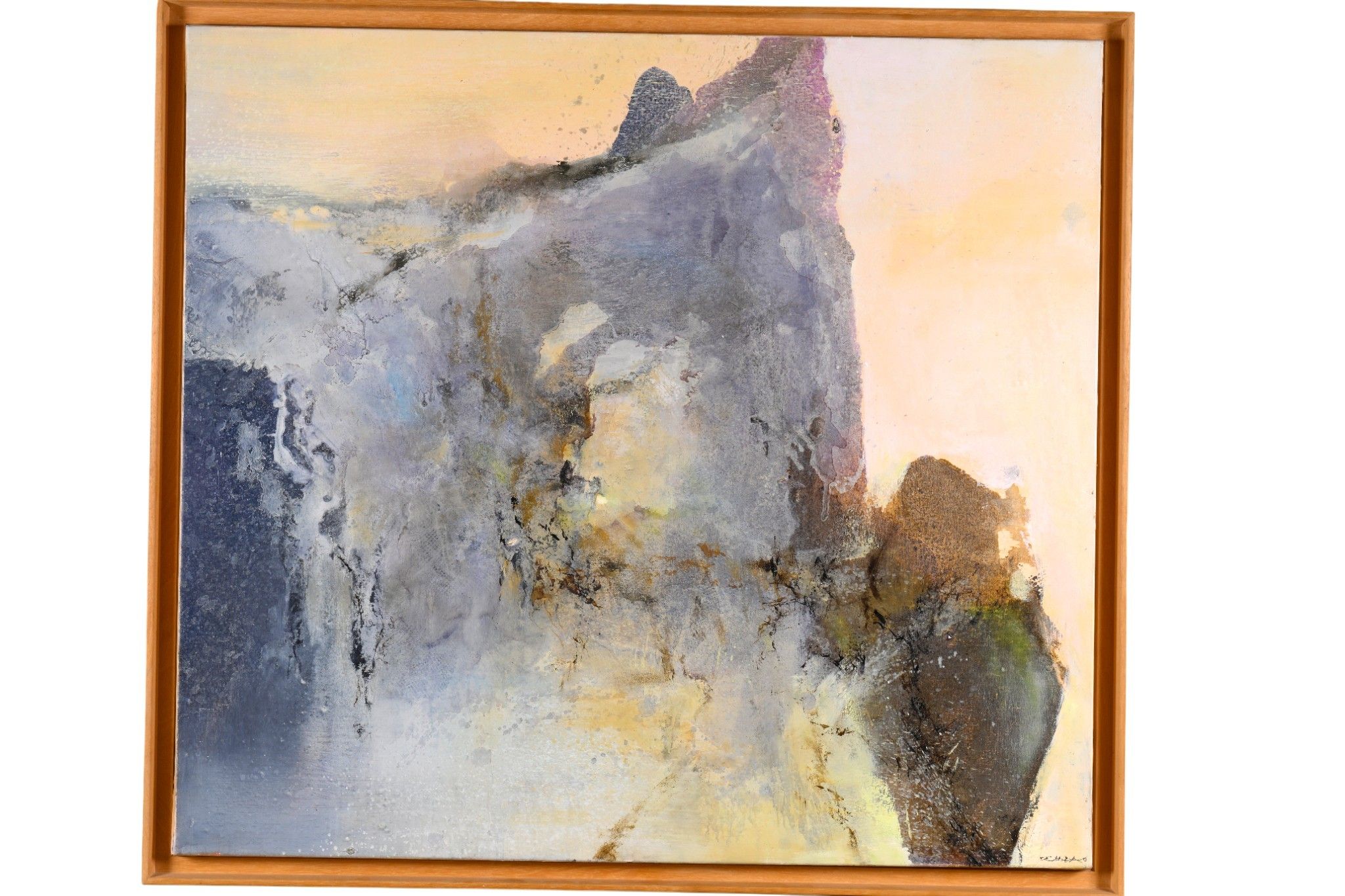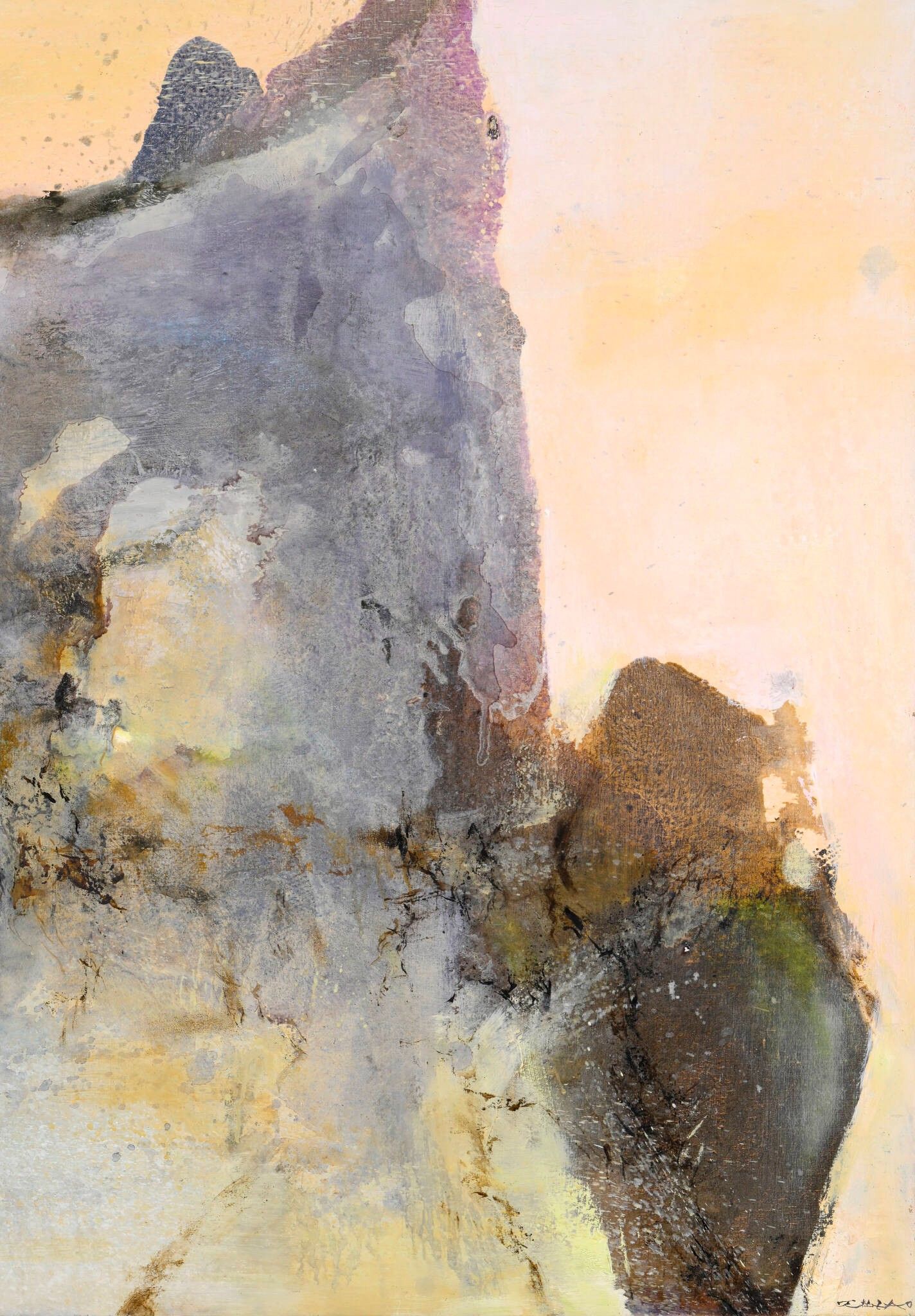 Our 1992 canvas evokes a mountain landscape, lost in the clouds, in subtle harmonies of yellows, blues, oranges, pinks and a multitude of half-tones further enriched by transparencies and material effects. A halo of warm light seems to envelop this lithic wall. The painting becomes in turn stone, light, water, atmosphere, an object of contemplation and meditation, an elemental world reflecting the painter's thoughts, where the viewer can project his or her imagination.