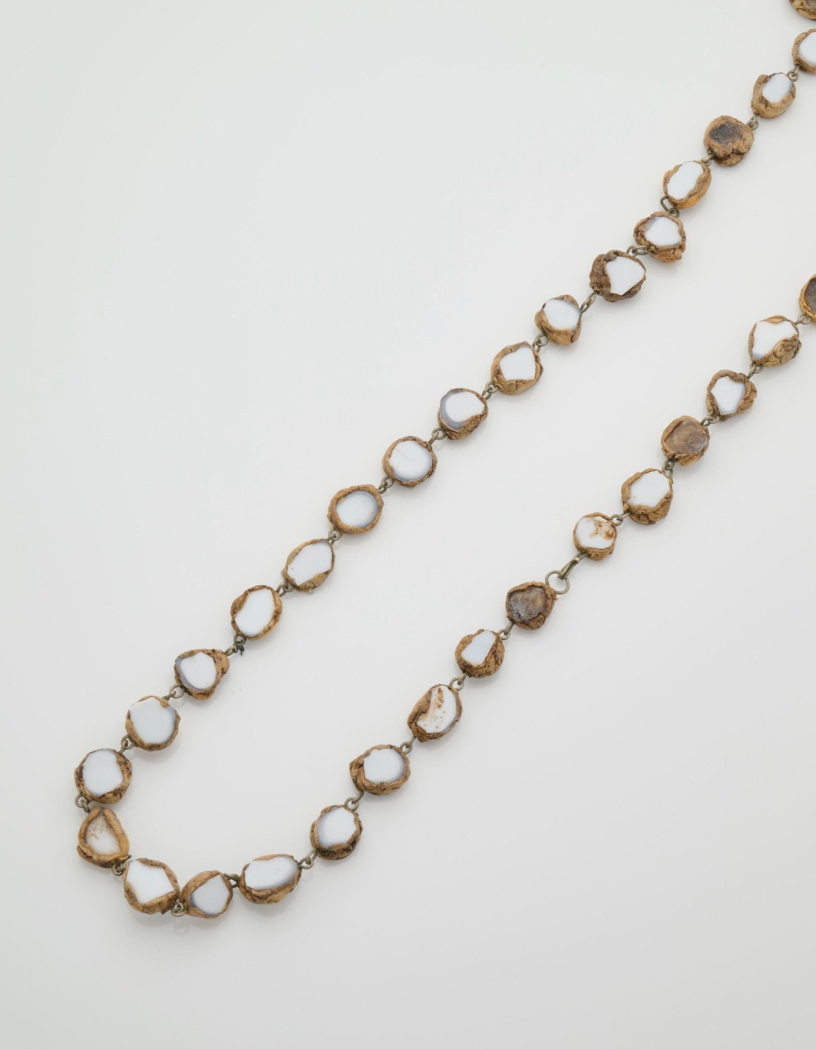 Long necklace, circa 1960, made of beige talosel pendants with opaque white mirror inclusions.