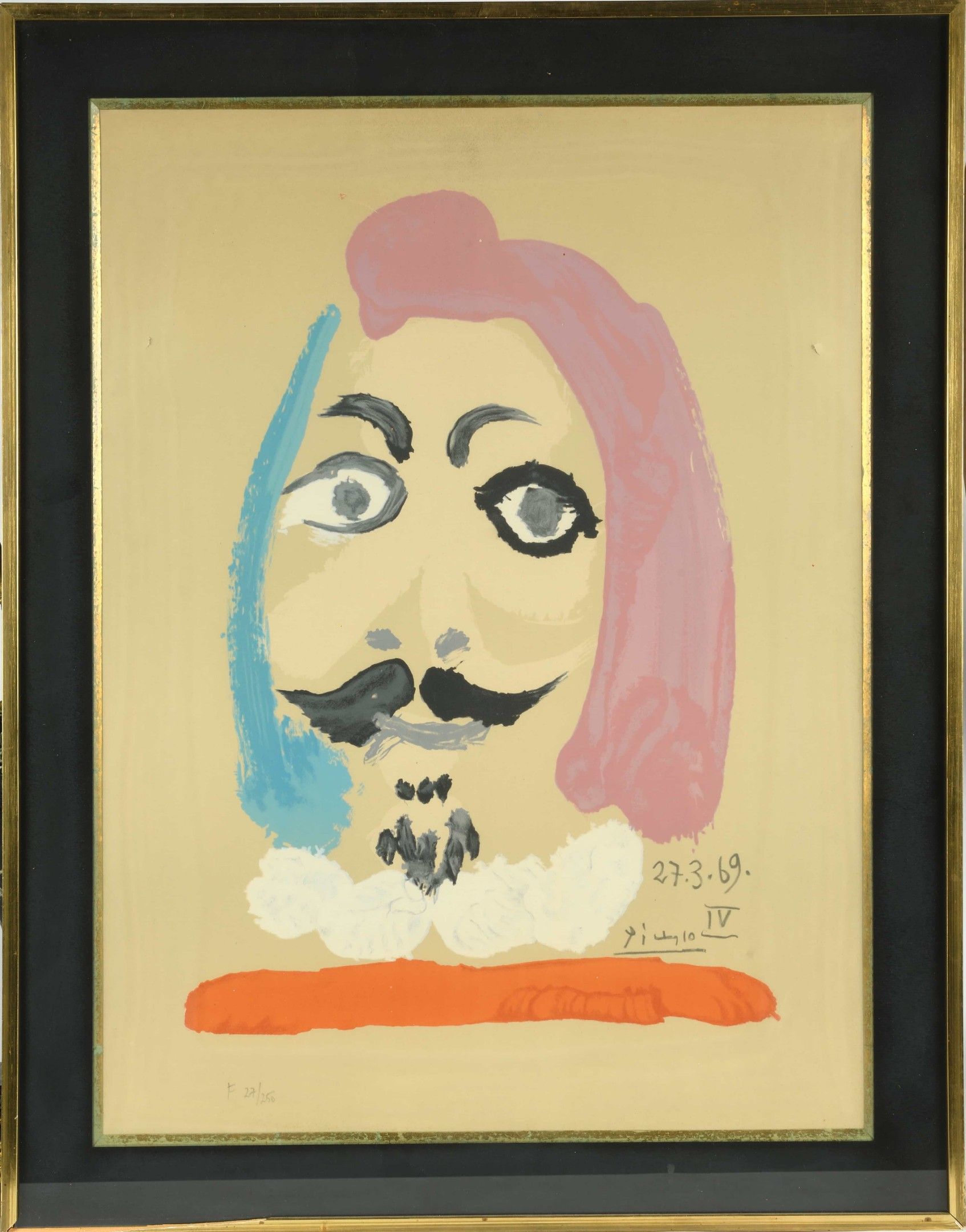 Pablo PICASSO (1881 - 1973) after Tête d'homme, from the Portraits Imaginaires series. Lithograph in colours by Salinas, signature and date 27.3.69 IV in the plate. Numbered F 27/ 250. Two small accidents at the top left and right. Framed. 51.5 x 38 cm. Sheet: 63.5 x 49 cm