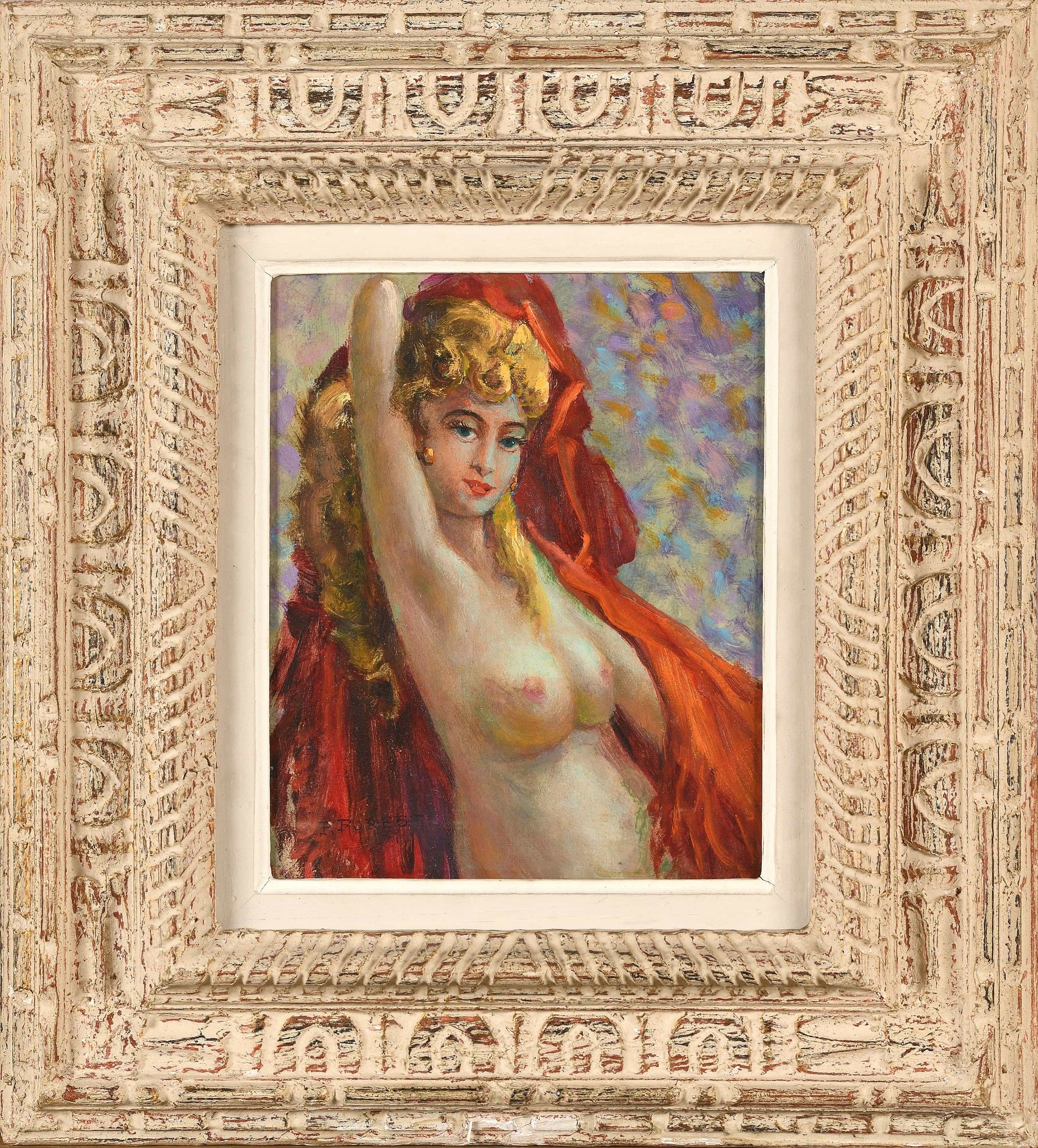 Pierre FOREST (1881-1971) Bare-breasted Dancer with Red Veil Oil on panel. Signed lower right. 27.5 x 22 cm Provenance: - Galerie Les Singuliers, Paris - Collection Léon-Lef Forster