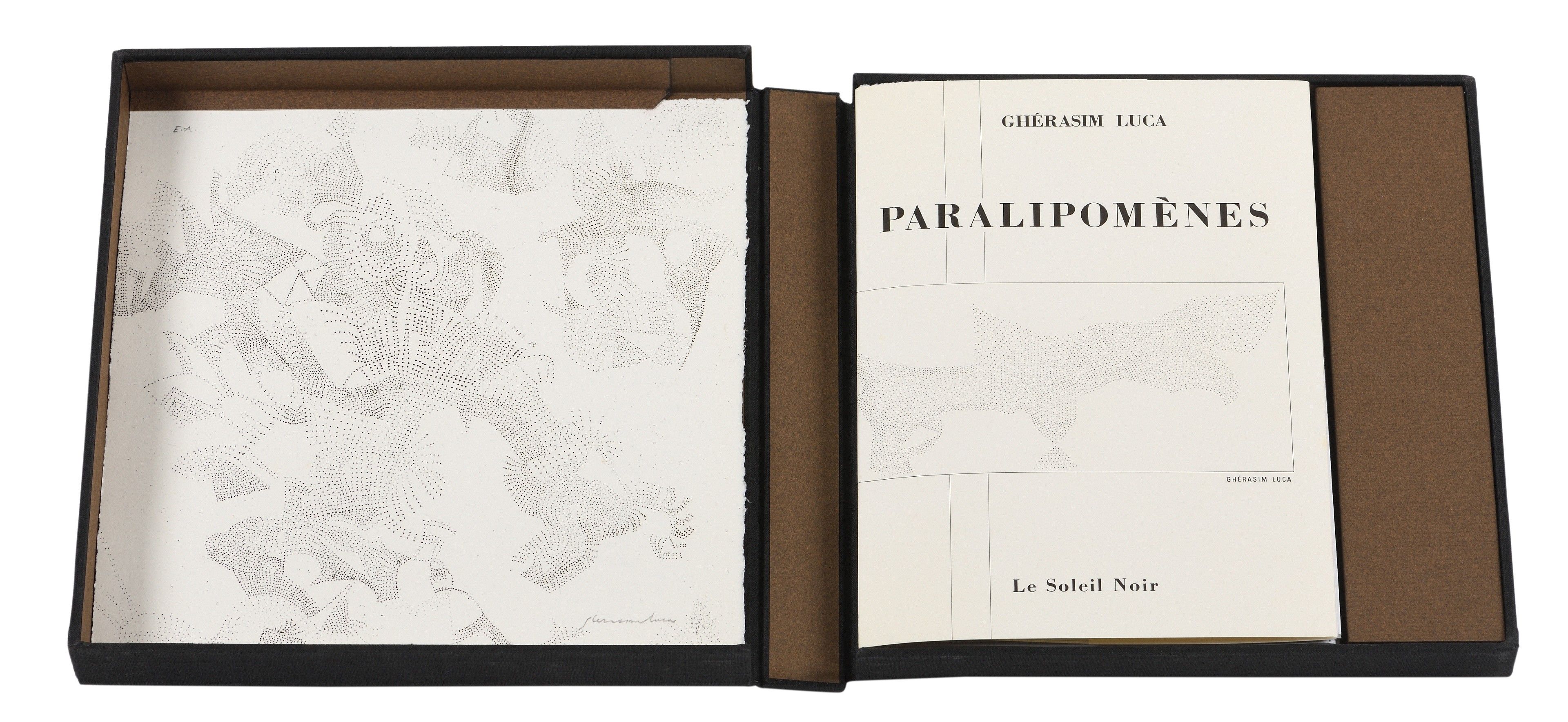 Lucas GHERASIM Paralipomènes. Paris, le Soleil noir, 1976. In-12 (19,1 x 14,1 cm), paperback, pages uncut, (except the last one), illustrated cover, box. First edition, illustrated with 3 drawings by the author, one of which is on the cover. Edition of 1830 numbered copies; this one justified E.A., in a binder's slipcase containing an original signed etching and, on the upper cover of the slipcase, a cubomanie by Ghérasim Provenance: - Collection Léon-Lef Forster