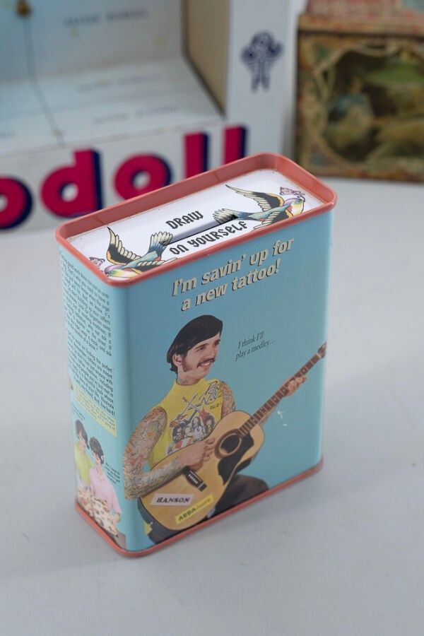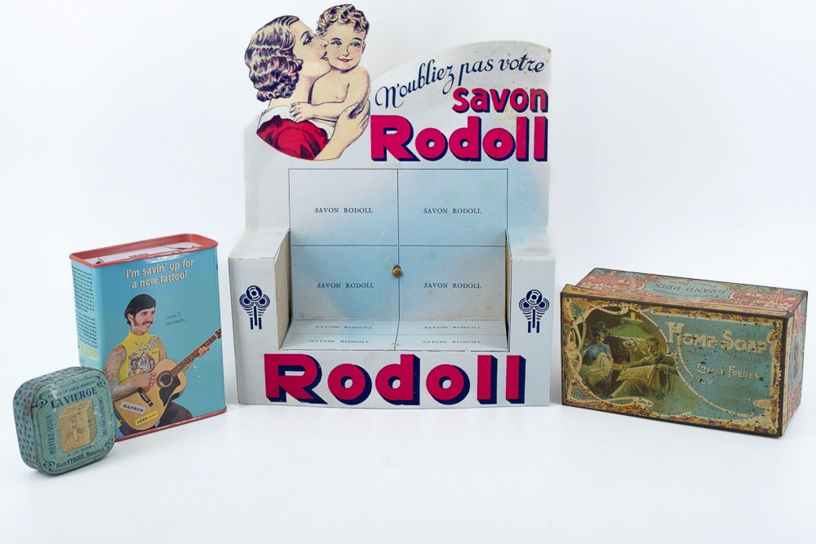 La vierge soap - Félix Eydoux Marseille, Home soap Gellé frères, rodoll soap display (circa 1940), tattoo money box (contemporary)