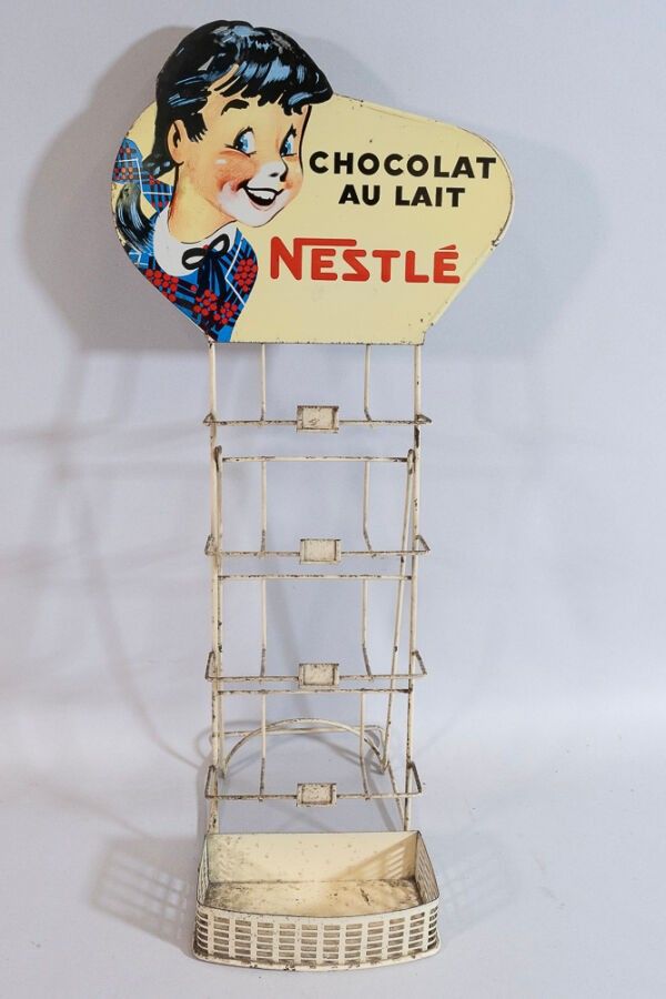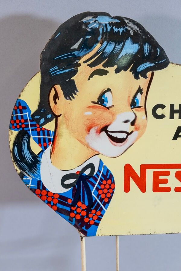 NESTLÉ "LA FILLE" milk chocolate - rare tin bar display. Circa 1954. Good condition, good colours, a slight fold at the head. After Pierre Couronne (not mentioned) 68,5 x 31 cm . Nestlé's founder, the Swiss-German pharmacist Henri Nestlé, launched his milk flour (a flour with added milk) in Vevey, Switzerland. The story began in 1866, when the Anglo-Swiss Condensed Milk Company opened the first condensed milk factory in Europe in Switzerland. In 1867, Henri Nestlé developed an innovative infant food, and in 1904 Nestlé made its first foray into the chocolate market. In 1905, the company he founded merged with Anglo-Swiss. In 1929 Nestlé bought Peter-Cailler-Kohler, Switzerland's largest chocolate maker, which later became the Nestlé Group as we know it today (source: nestle.ch). PIERRE COURONNE: Pierre Couronne had a long career as a painter and publicist in Paris. Passionate about drawing and painting, this native of Salindrois (Gard, Occitanie) moved to Paris at a very young age (1946) to practise his talents, which he perfected by attending the Académie de la Grande Chaumière. A little later, he specialised in illustrations for advertisements, the most famous of which are for Bic ballpoint pens, Omo washing powder, luxury goods and many others, such as the national lottery, under the name Pierrot. He was an illustrator of children's books. At the end of the 1970s, he chose to return to live in his native Cévennes. (Source: bedetheque.com)