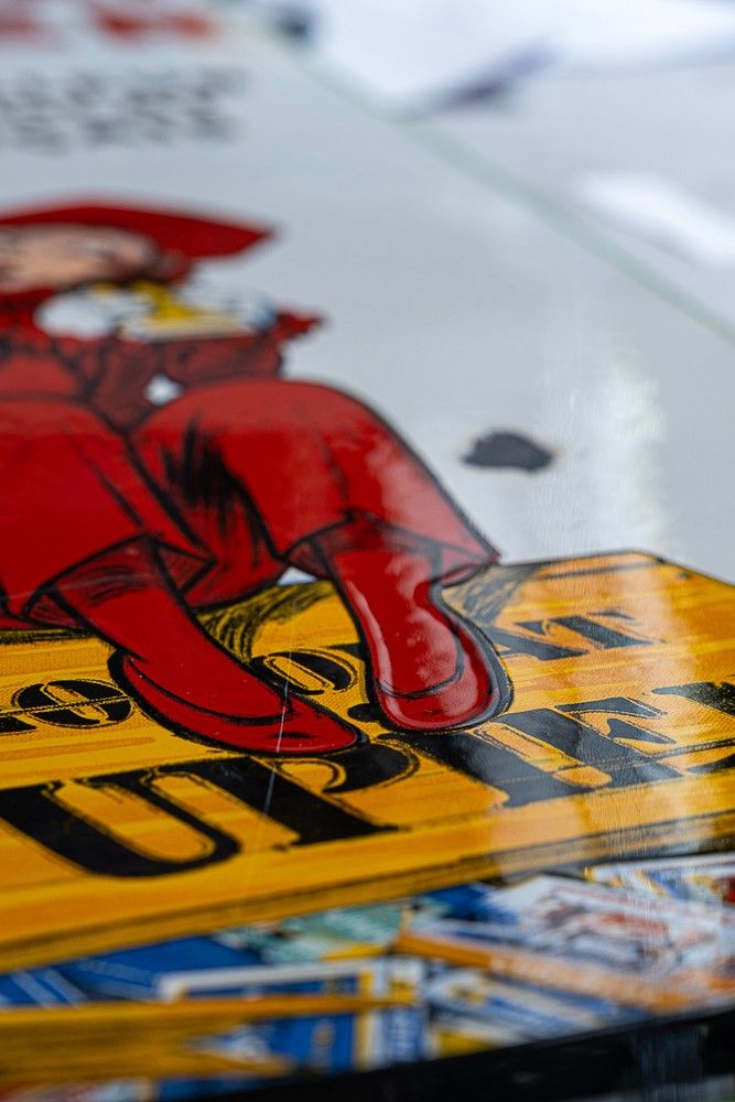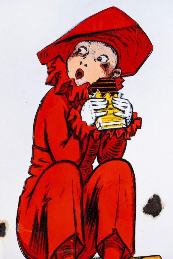 Depiction of his famous Pierrot who fears that the rise in temperature will melt his tablets.