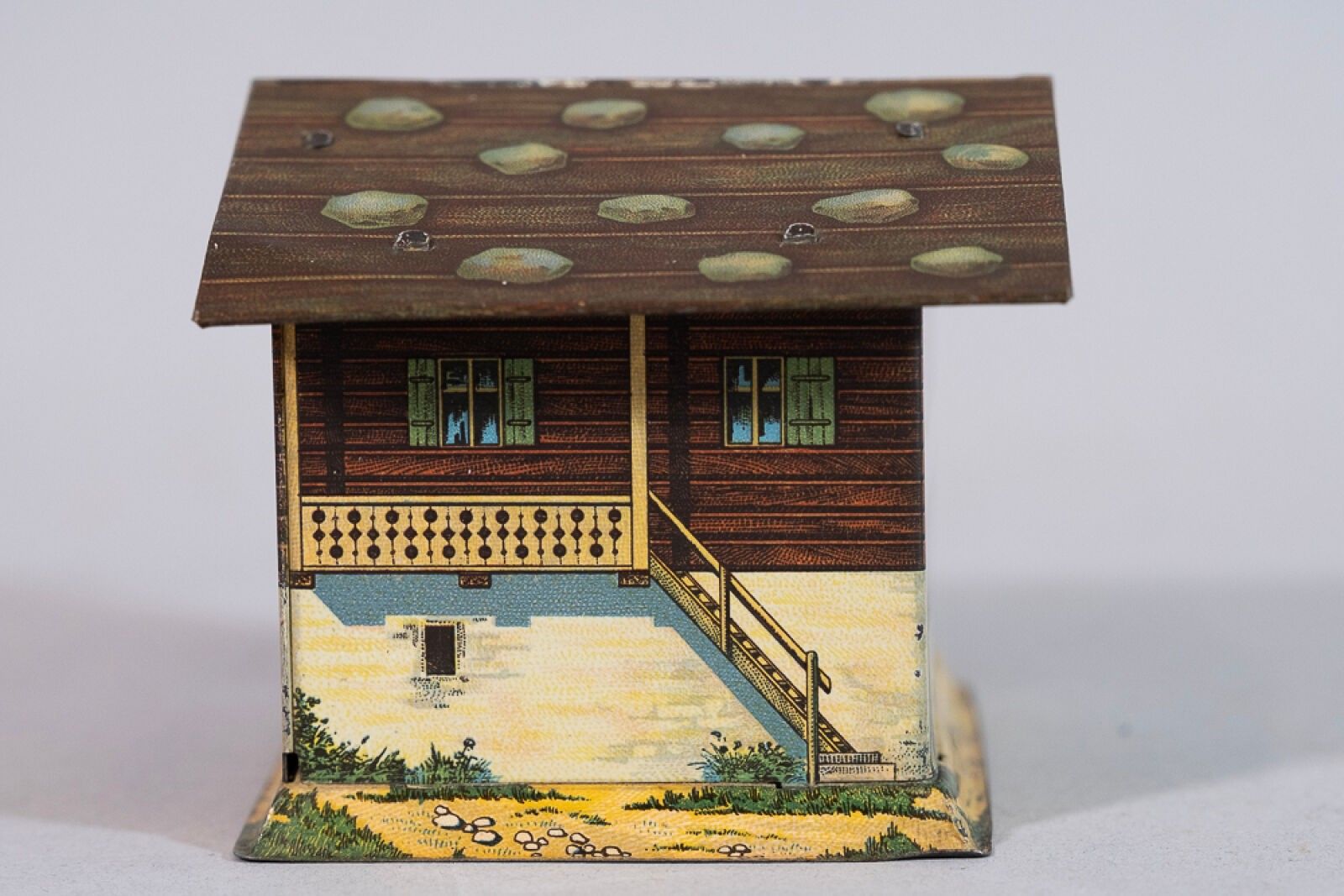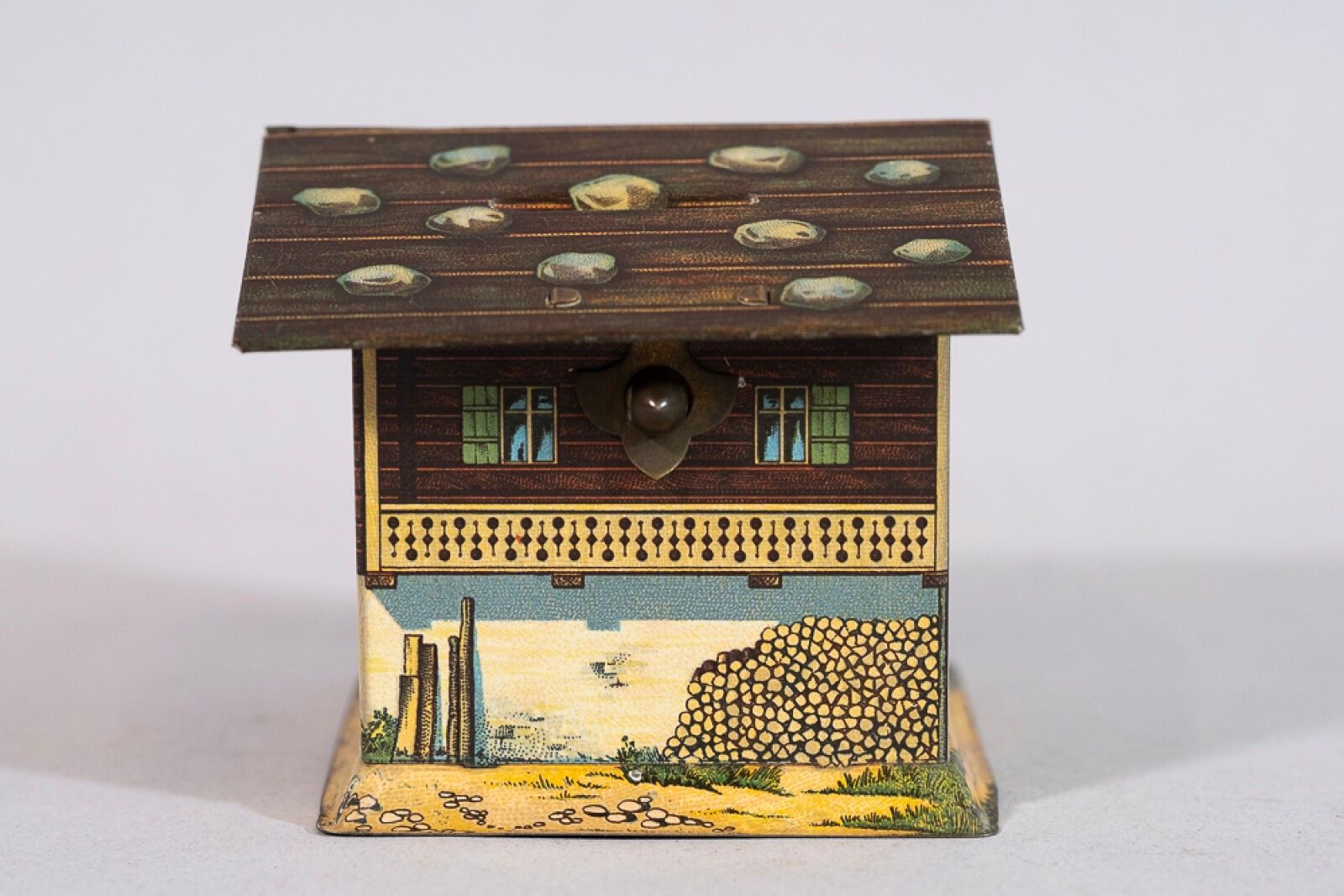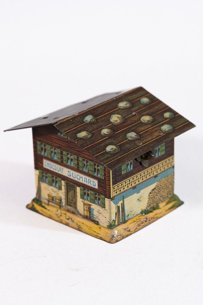 Rare lithographed tin money box in the shape of a chalet, circa 1910.