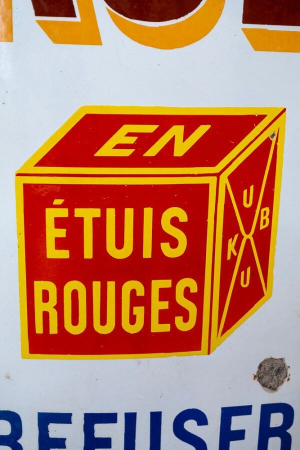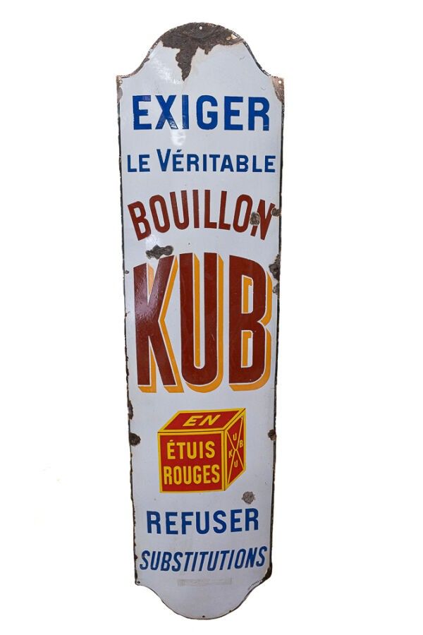 The "KUB bouillon" signs had been placed on house corners at crossroads from Germany. Believing them to be a German brand, rumour had it that they had been used as signposts to direct Germans (cabalistic numbers can be found on these plates, originally they were simply manufacturing reference numbers...) towards Paris during the First World War, to the extent that "Maggi" and "Kub" enamels were unscrewed in towns everywhere. (Sources: wikipédia, radiofrance.fr, livre émail & pub)