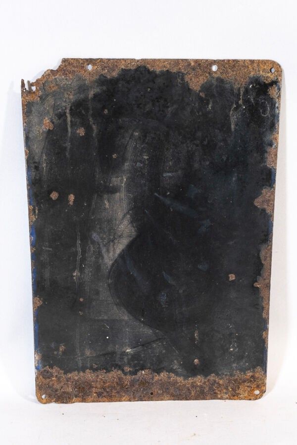 Embossed lettering. Chips around the edges, upper right corner heavily altered by rust.