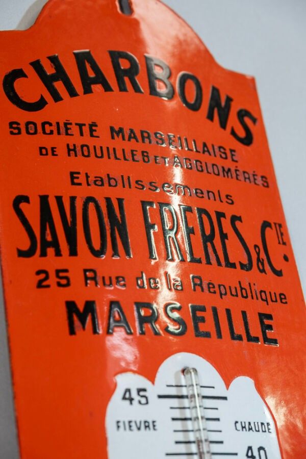 SAVON FRÈRES - COAL - Marseille. Enamelled thermometer circa 1930.