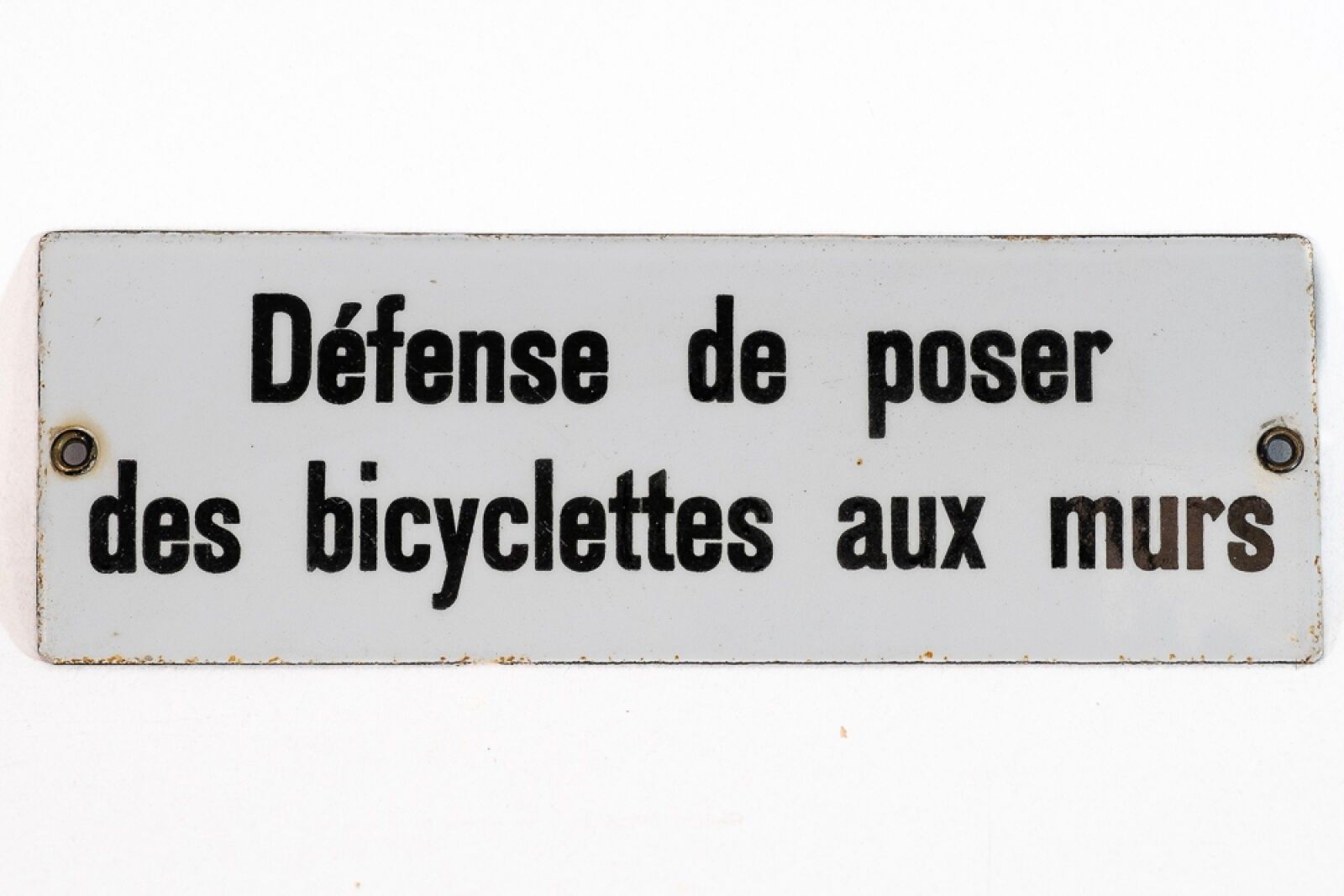 NO BICYCLES ALLOWED ON THE WALLS Enamelled utility plate. 23…