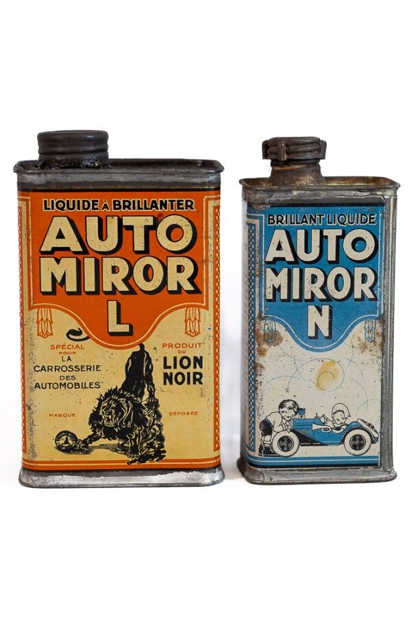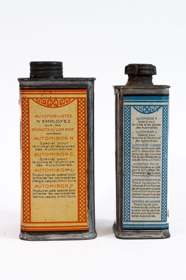 LION NOIR/AUTO MIROR - Two lithographed tin cans illustrated…