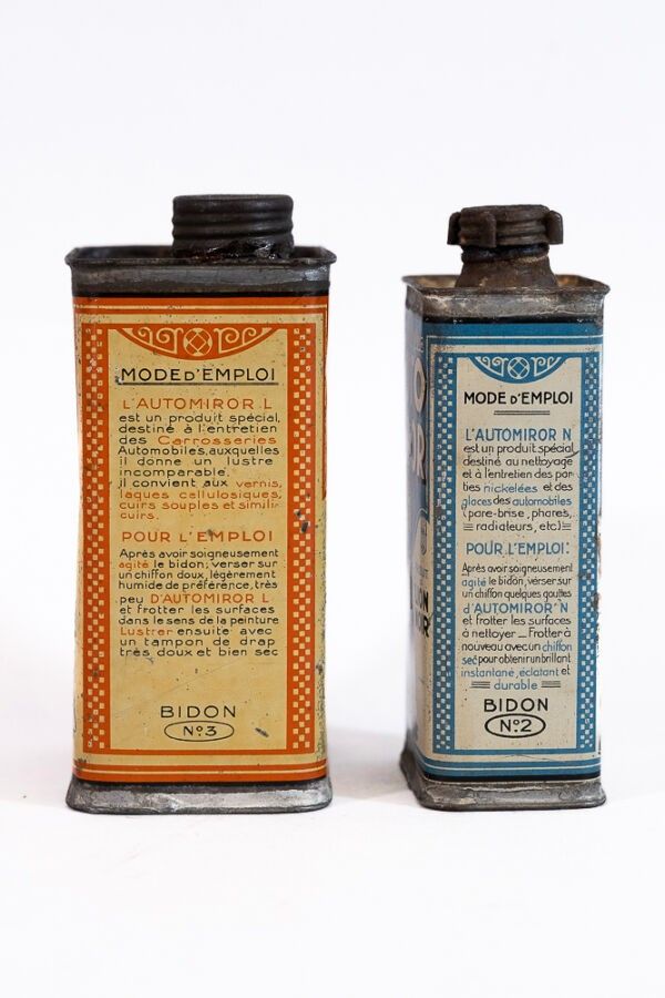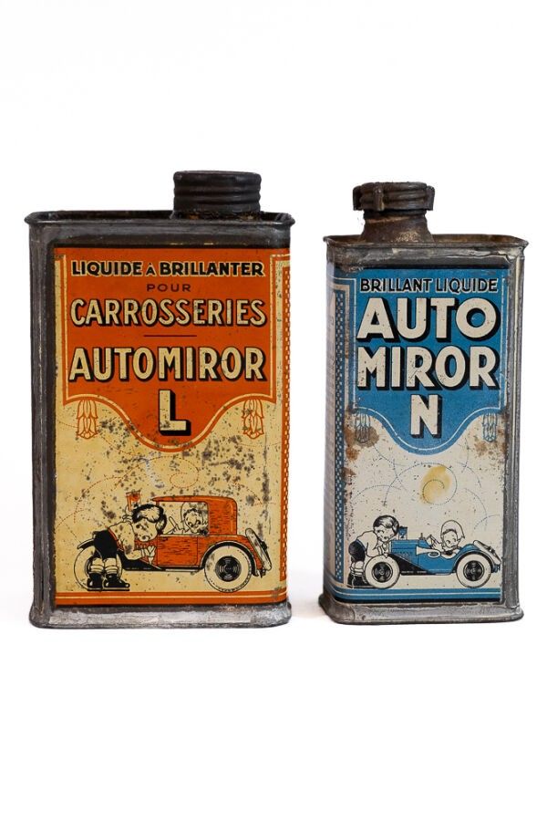 Two lithographed tin cans illustrated by Béatrice Mallet for "shining liquid" for car bodywork and windows.
