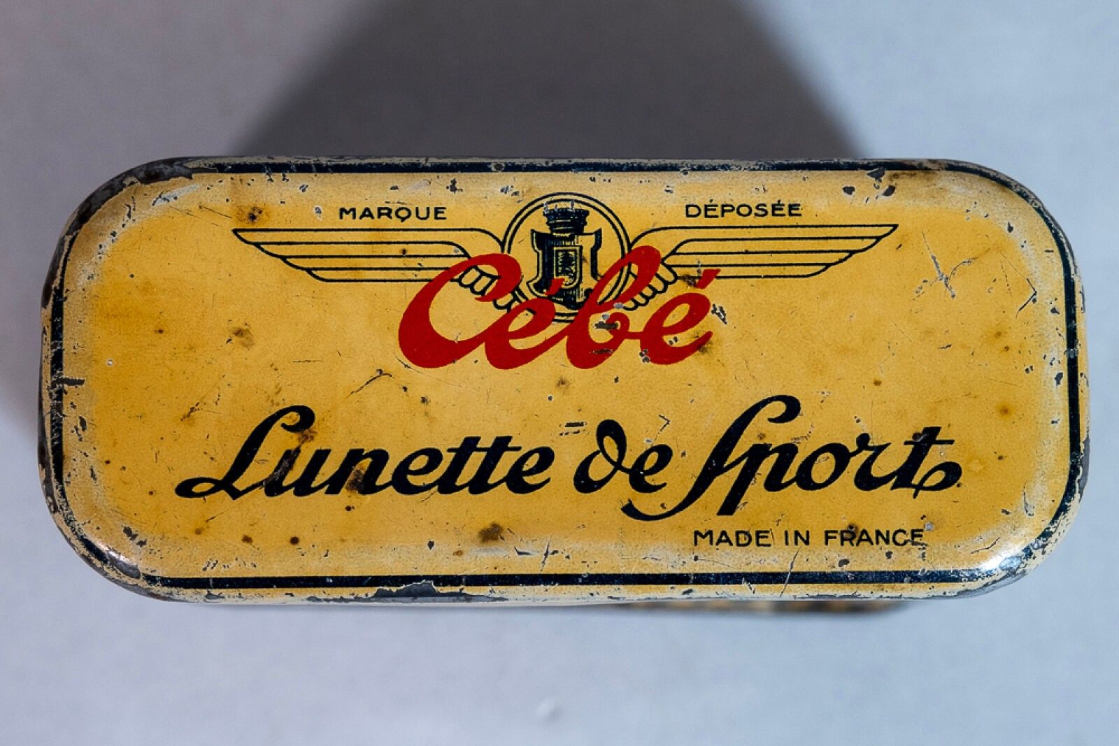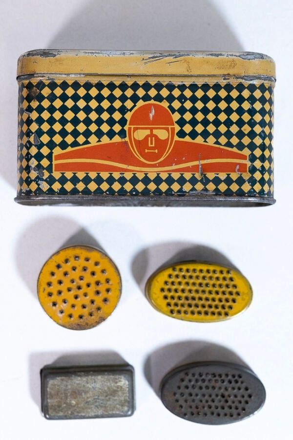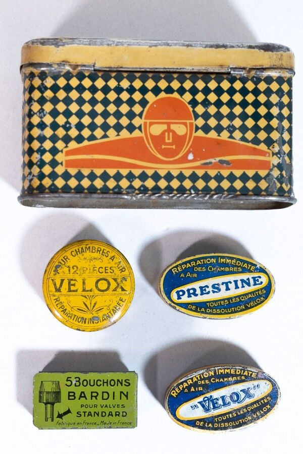 Lot of 5 lithographed sheet metal boxes on the theme of AUTOMOBILE: 1 CÉBÉ car/motorcycle sports glasses, 2 Vélox patches, 1 prestige patches, 1 Bardin stoppers. good general condition (some alterations).