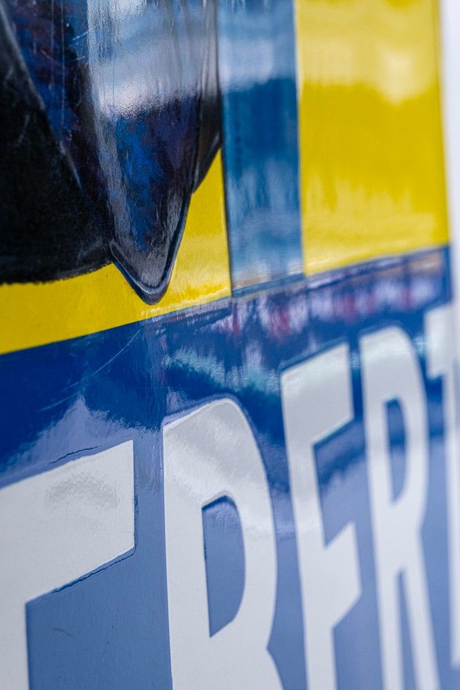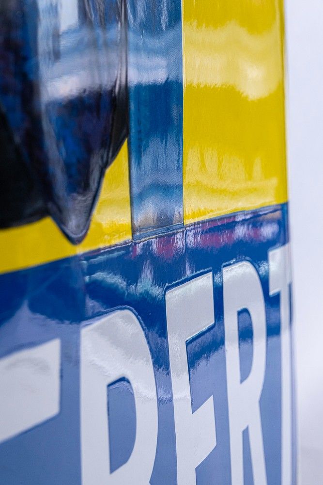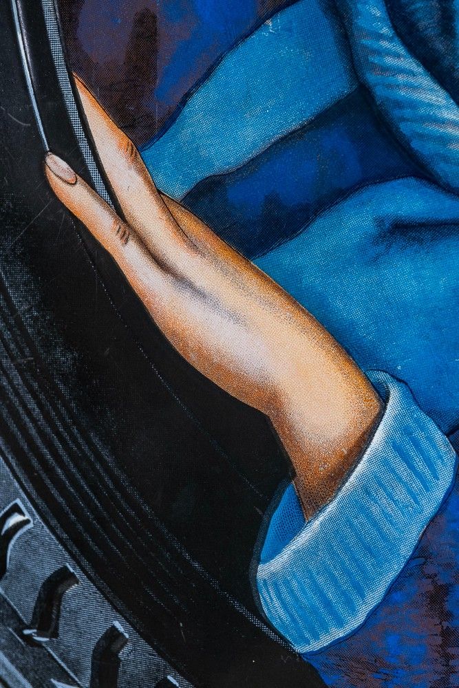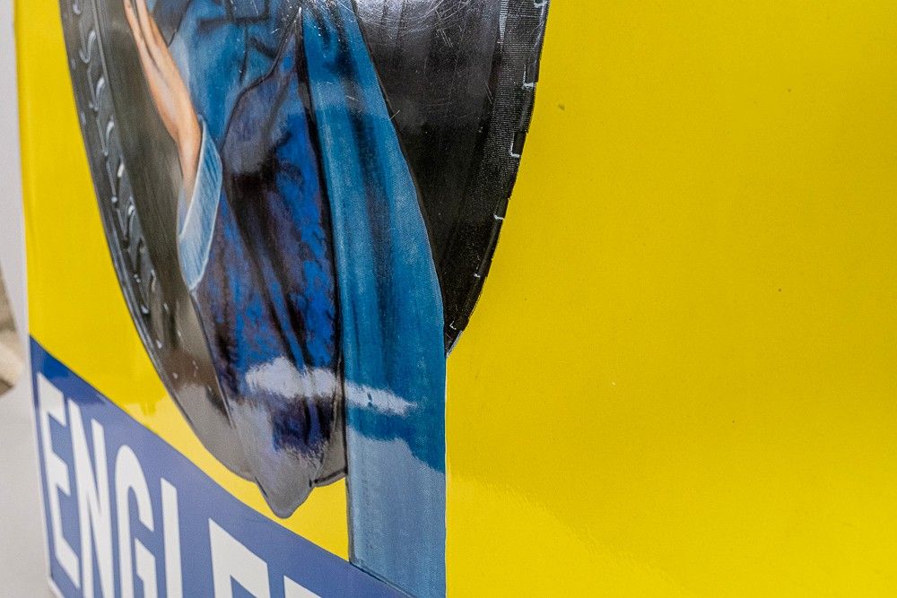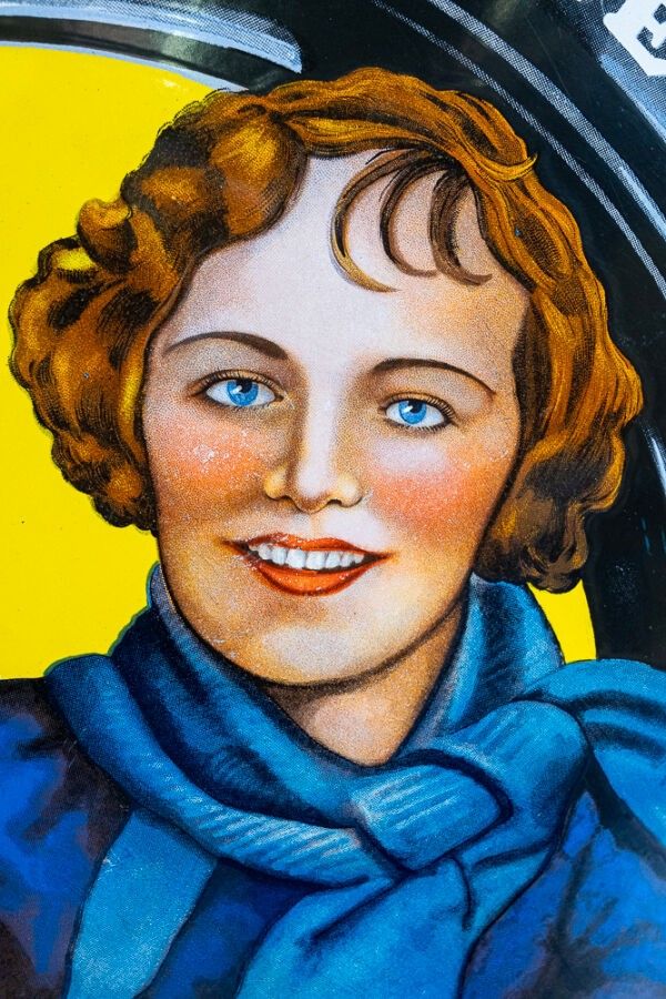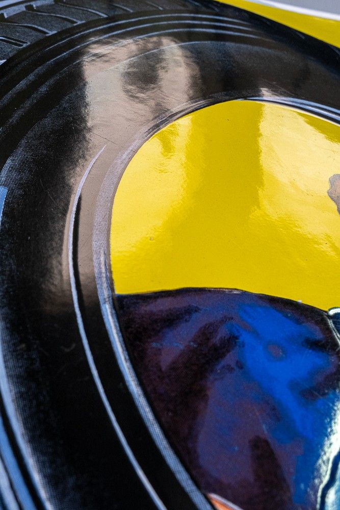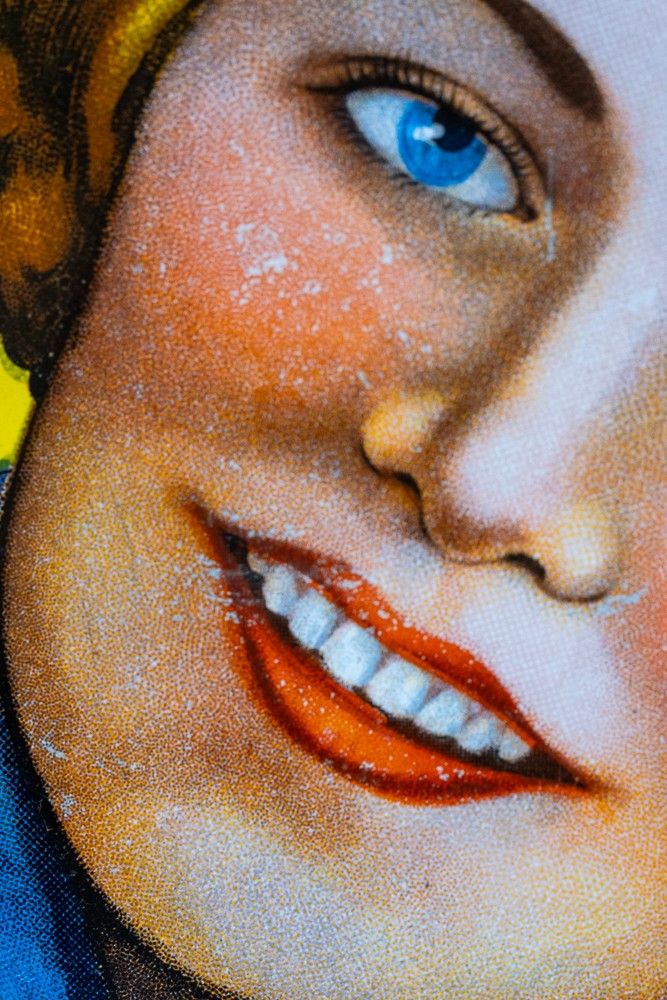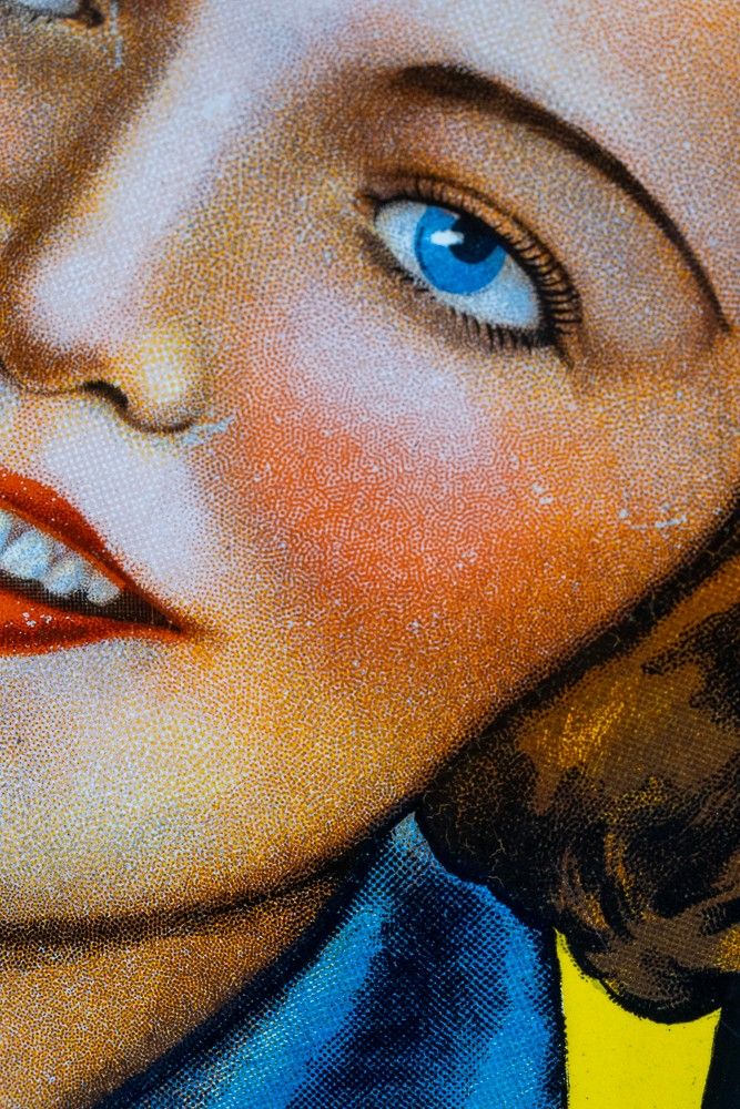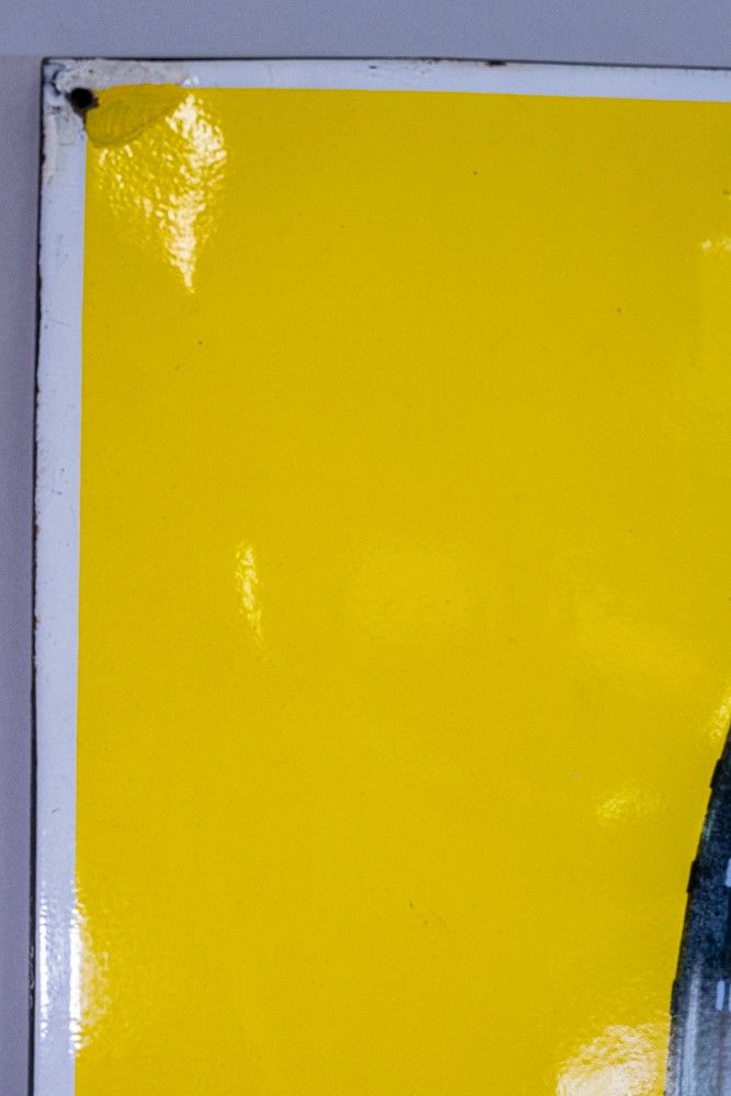 Rare in this state of preservation, with superb, bold, fresh colours, the red cheeks are well marked despite a very slight depigmentation. Exceptional brilliance. Slightly faded at the top with a minor chip in the white margin, chips in the upper corners at the fixing holes and in the lower right corner. A small chip in the letter "N" on the tyre and in the lower right-hand margin.