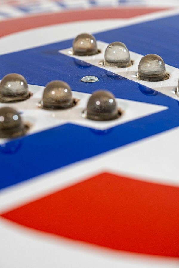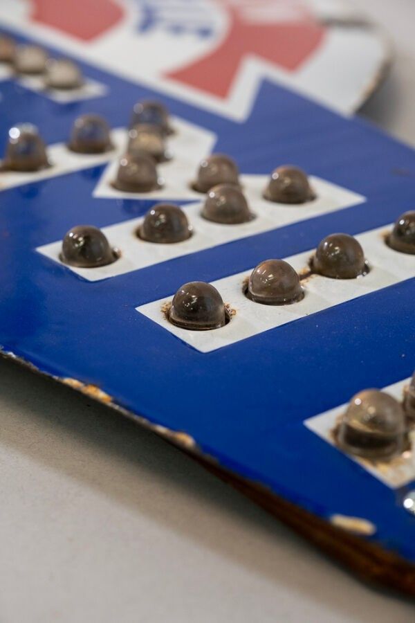 Enamelled single-sided cut-out plaque to hang with all its reflectors in good condition.