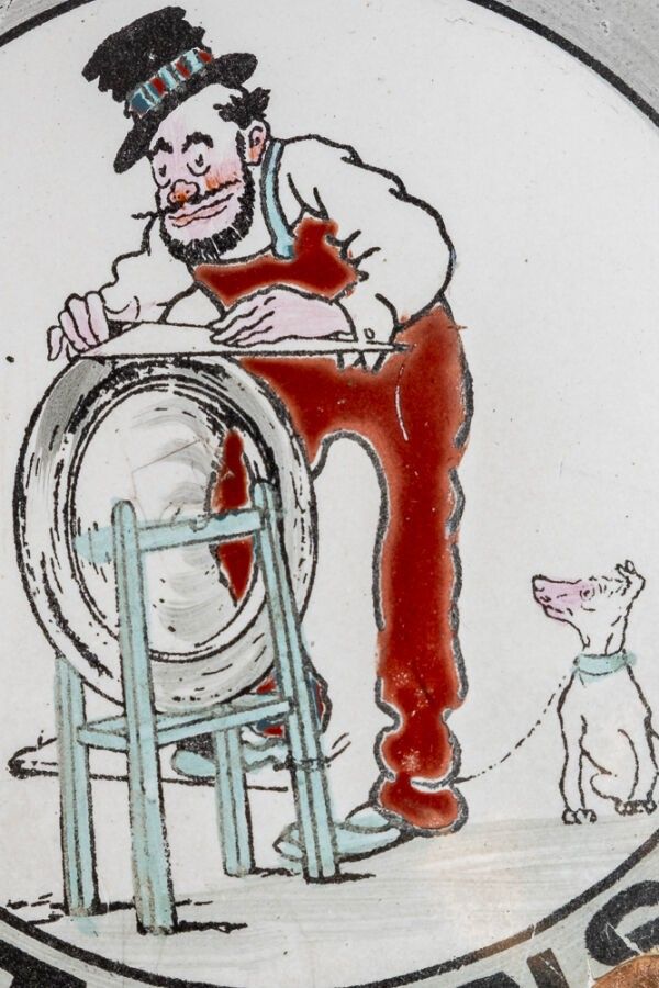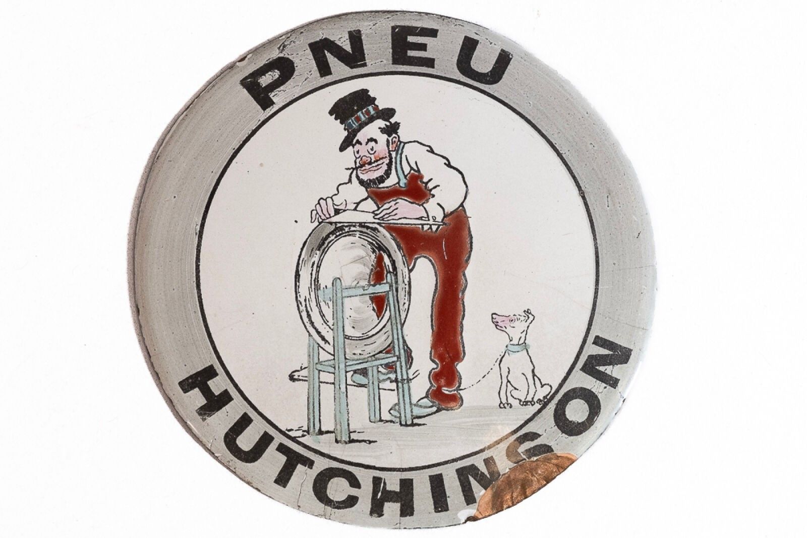 Very rare domed enamelled copper plate circa 1911 depicting "Sam", the tyre repairer, and his faithful dog "Floc" drawn by "MICH" Jean Marie Michel Liébaux (not mentioned). 11.5 cm in diameter.
