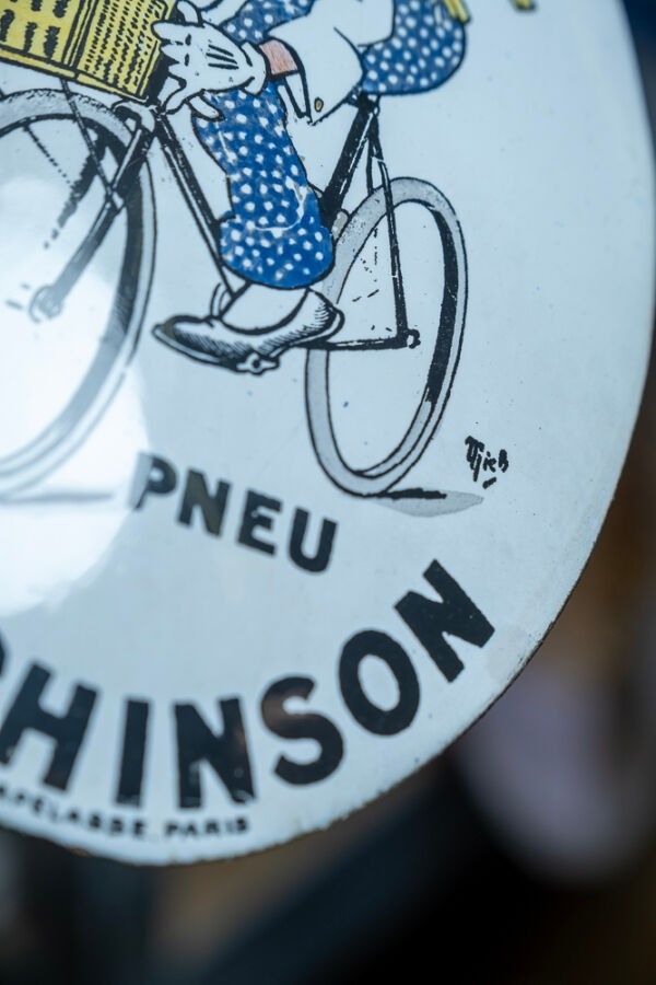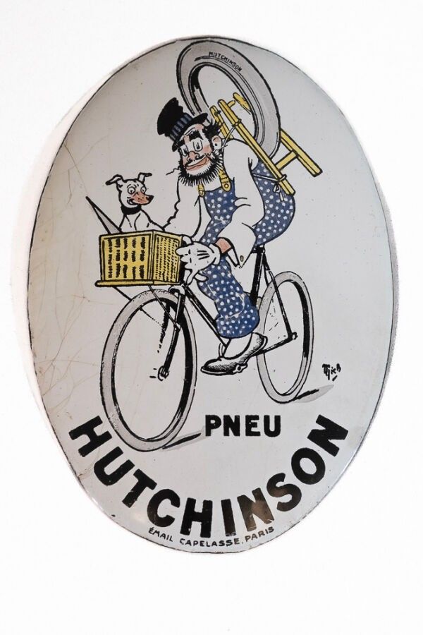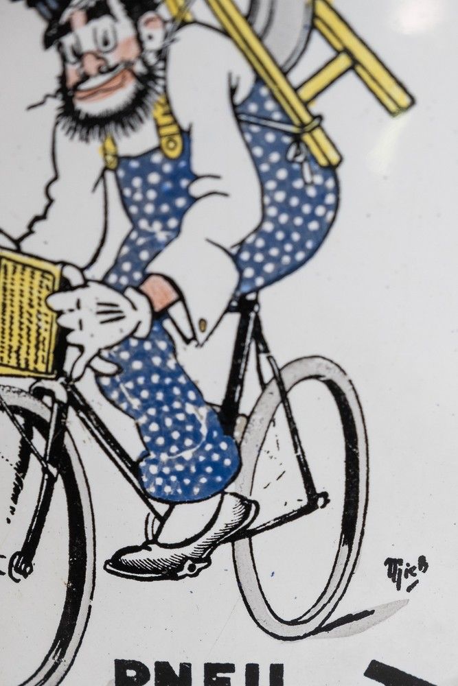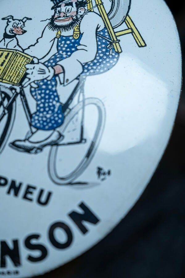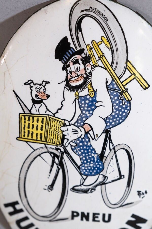 Rare domed enamelled copper plate circa 1911 depicting "Sam" the grinder and his faithful dog "Floc" on a bicycle, drawn and signed by "MICH" Jean Marie Michel Liébaux.