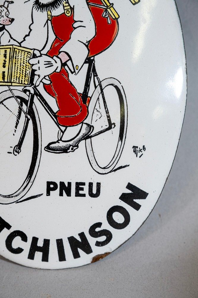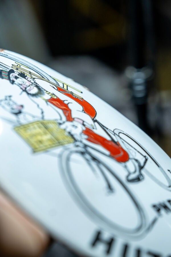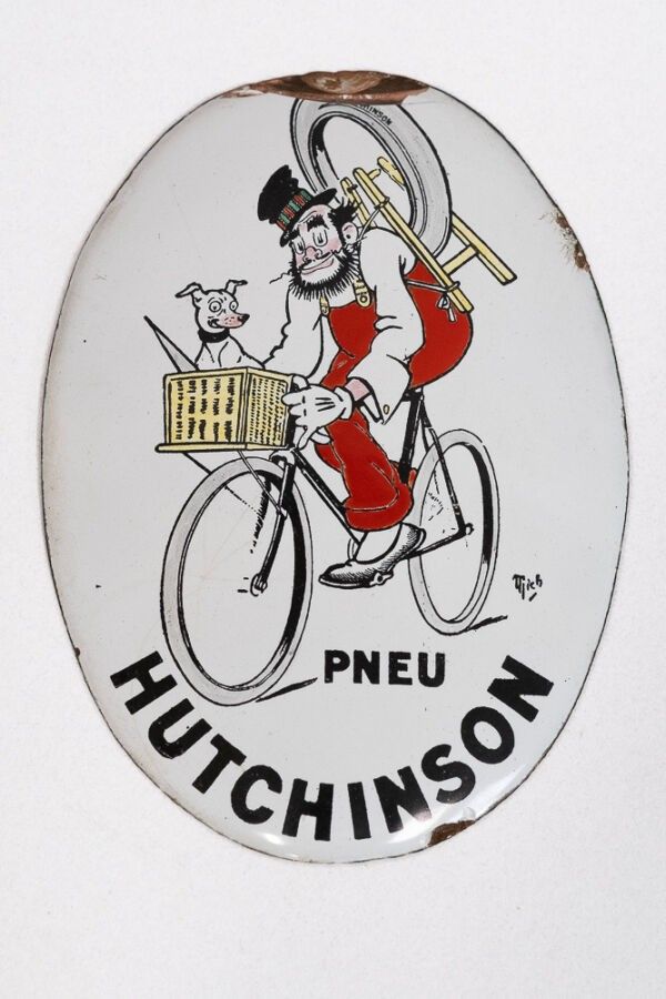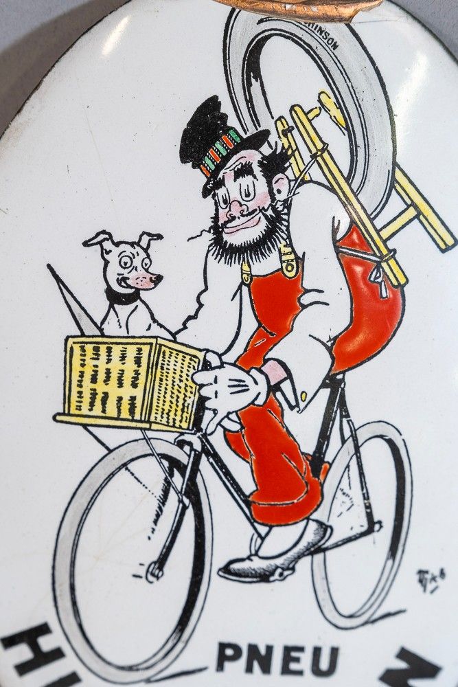 Rare domed enamelled copper plate circa 1911 depicting "Sam", a grinder, and his faithful dog "Floc" on a bicycle, drawn and signed by "MICH" Jean Marie Michel Liébaux.