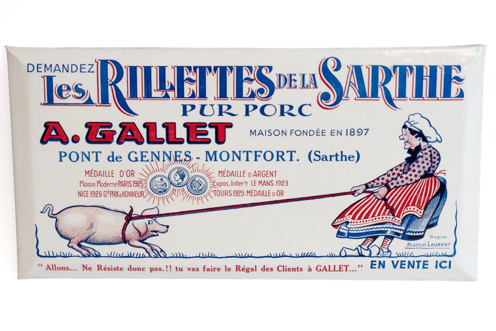 Representation of a pig being pulled by a peasant woman "Don't resist! You're going to delight the customers at GALLET...".